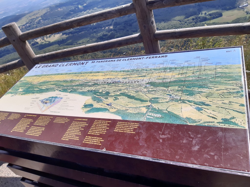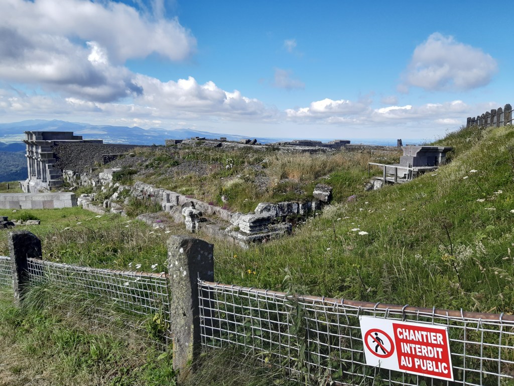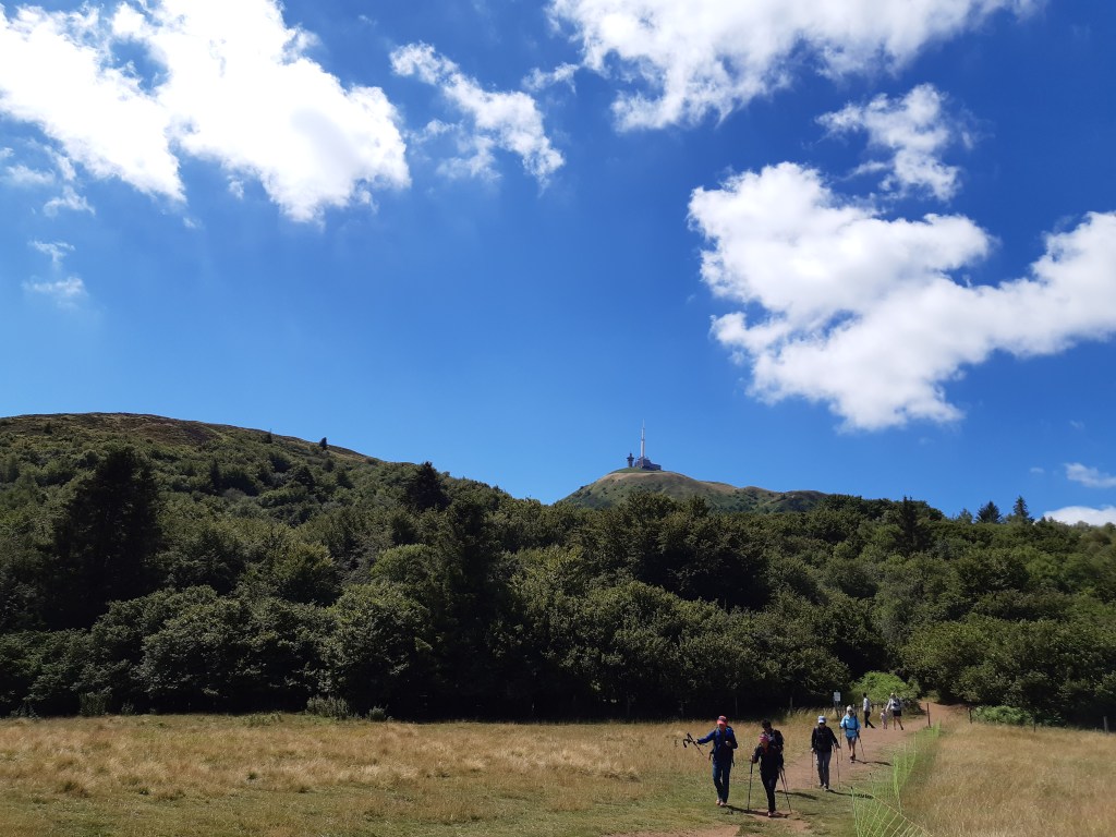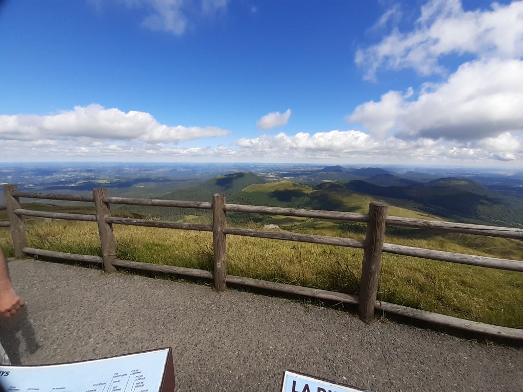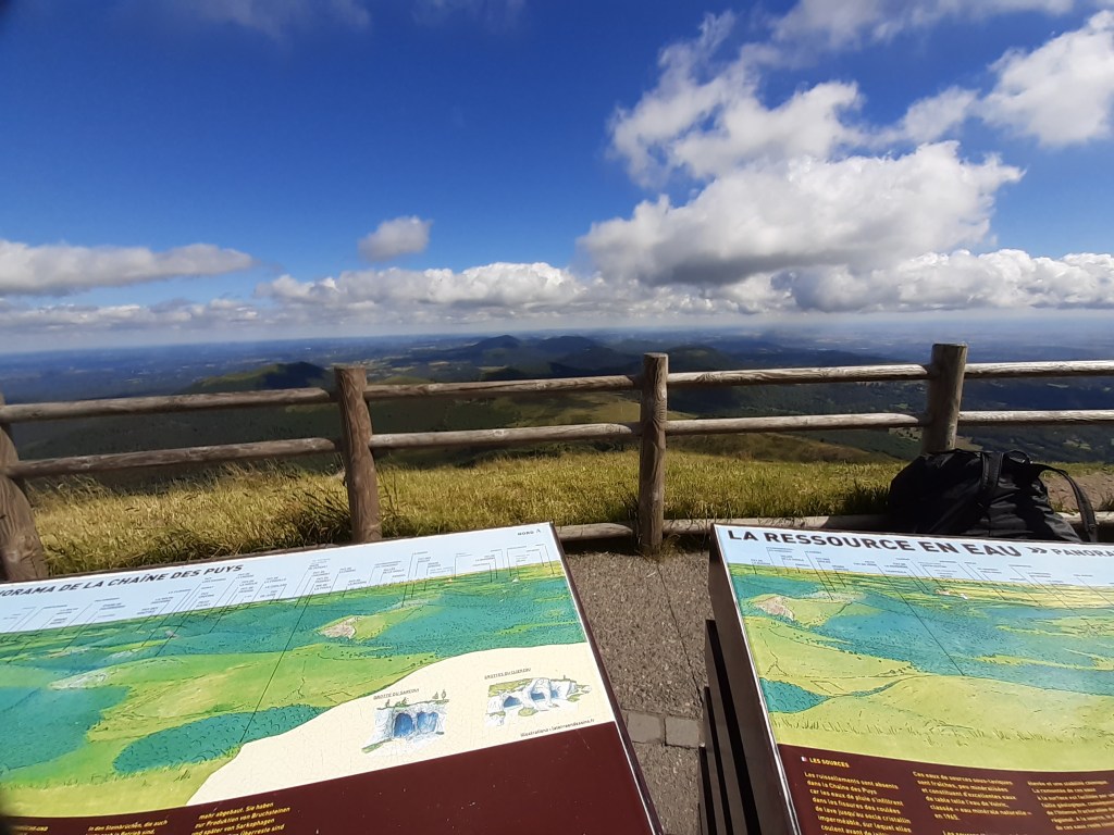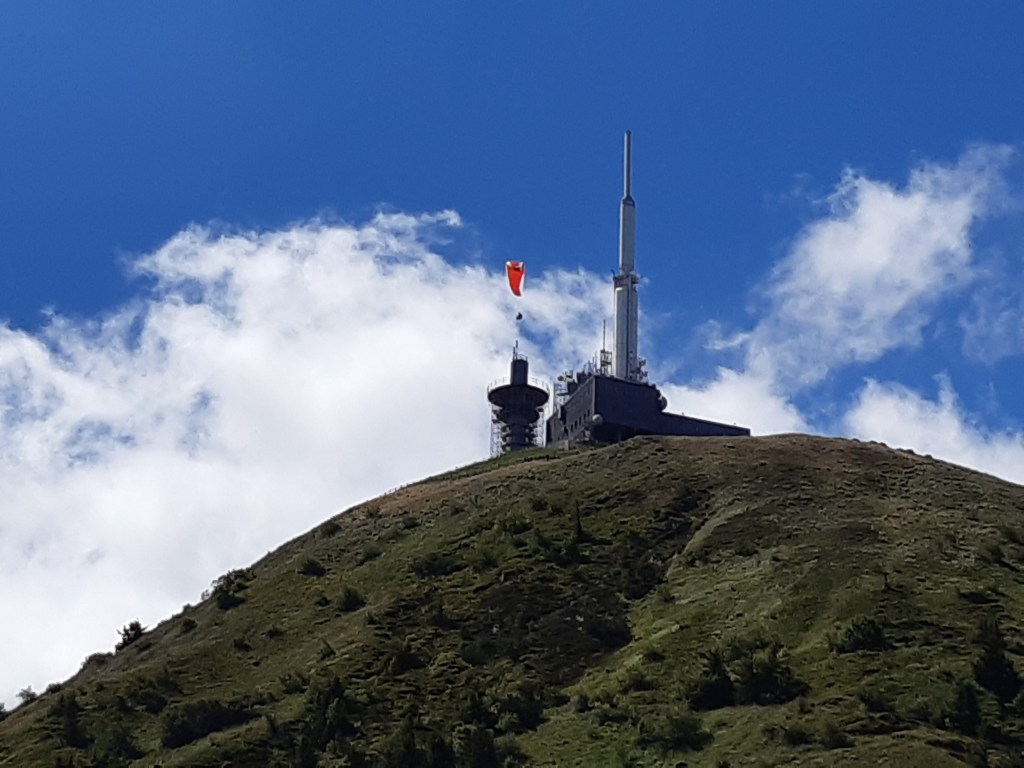 J’arrive au parking, départ de l’ascension du Puy-de-Dôme. C’est impressionnant ! Je soulage mes épaules, fais le plein d’eau et ne tarde pas trop. Je commence la montée par le chemin des muletiers, me fais rapidement doubler par d’autres randonneurs (non chargés) et des trailers qui me doublent en courant. Je ne les comprends pas, je préfère profiter du paysage. Bon, en même temps avec ma charge, je ne pourrais pas aller plus vite. Les derniers virages arrivent. Je me sens comme Frodon Sacquet sur la montagne du destin au Mordor. Mais plus je monte, plus le vent est fort et frais. Je m’arrête remettre le sweat posé avant le parking. J’arrive enfin en haut. La vue à elle seule est une récompense. Mais les fameuses montagnes que je vois de chez moi ne me permettent pas de voir chez moi. Je n’arrive même pas à trouver où c’est exactement malgré les panneaux indicatifs. Mais la chaîne des Puys est vraiment magnifique, on distingue bien les volcans et on se rend compte qu’on est bien peu de chose face à cette immensité.