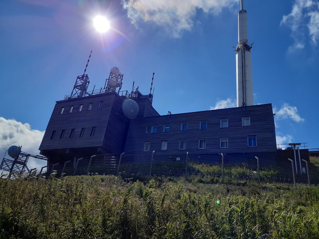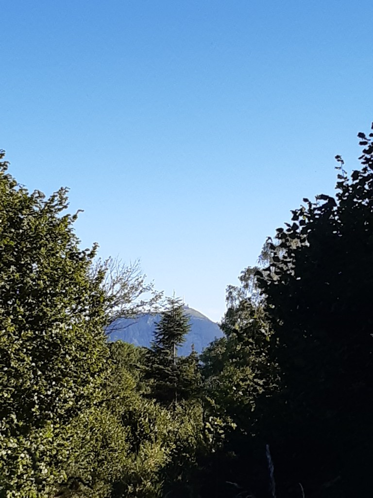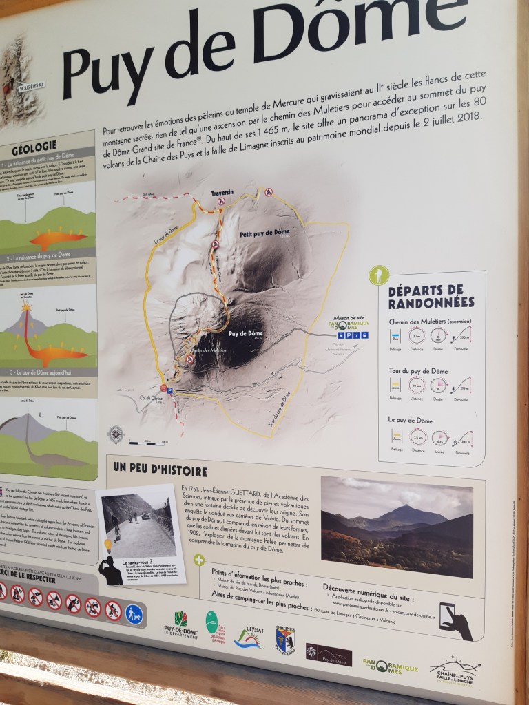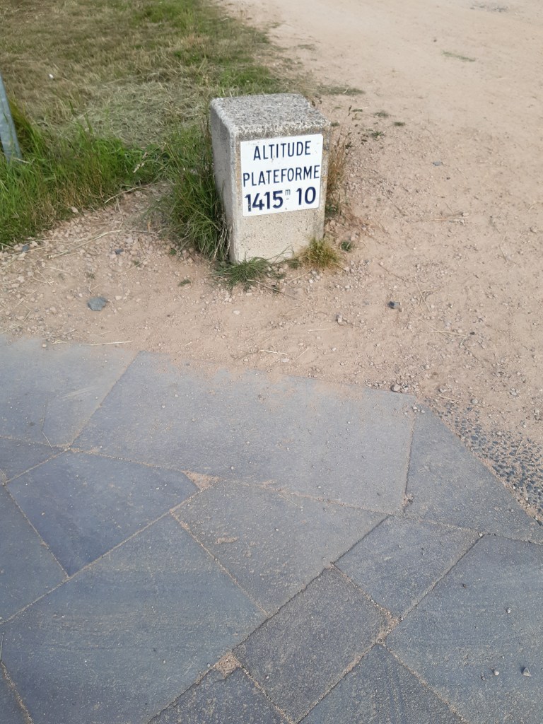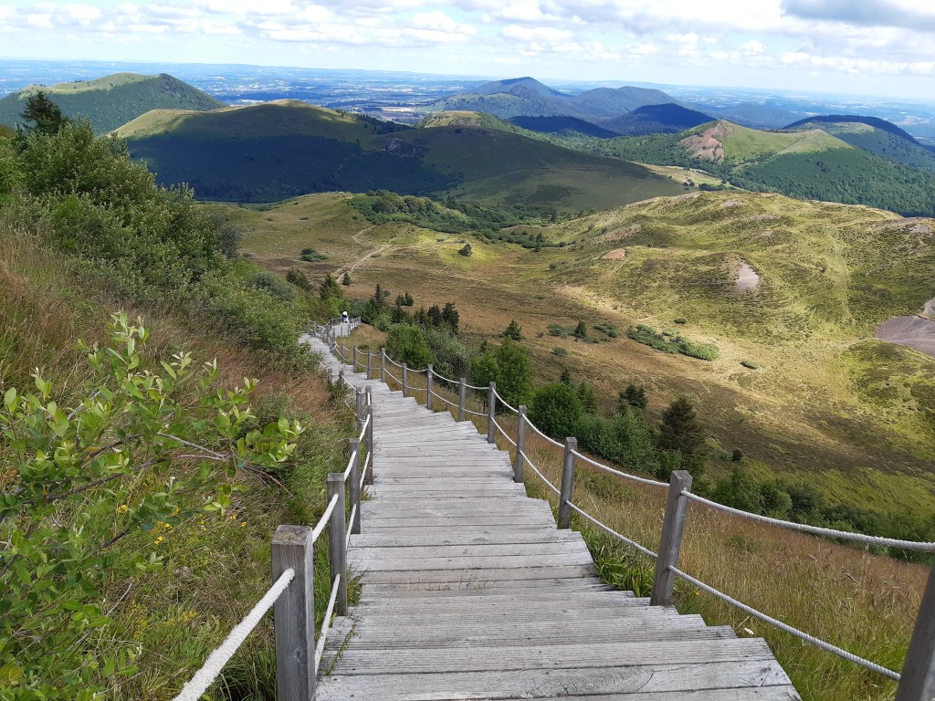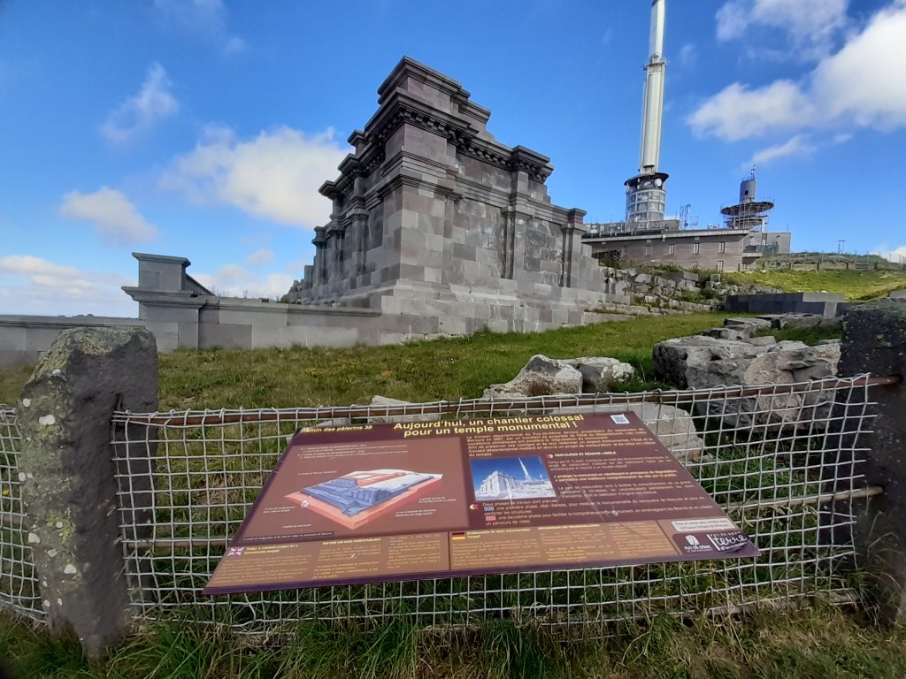 J’arrive au parking, départ de l’ascension du Puy-de-Dôme. C’est impressionnant ! Je soulage mes épaules, fais le plein d’eau et ne tarde pas trop. Je commence la montée par le chemin des muletiers, me fais rapidement doubler par d’autres randonneurs (non chargés) et des trailers qui me doublent en courant. Je ne les comprends pas, je préfère profiter du paysage. Bon, en même temps avec ma charge, je ne pourrais pas aller plus vite. Les derniers virages arrivent. Je me sens comme Frodon Sacquet sur la montagne du destin au Mordor. Mais plus je monte, plus le vent est fort et frais. Je m’arrête remettre le sweat posé avant le parking. J’arrive enfin en haut. La vue à elle seule est une récompense. Mais les fameuses montagnes que je vois de chez moi ne me permettent pas de voir chez moi. Je n’arrive même pas à trouver où c’est exactement malgré les panneaux indicatifs. Mais la chaîne des Puys est vraiment magnifique, on distingue bien les volcans et on se rend compte qu’on est bien peu de chose face à cette immensité.