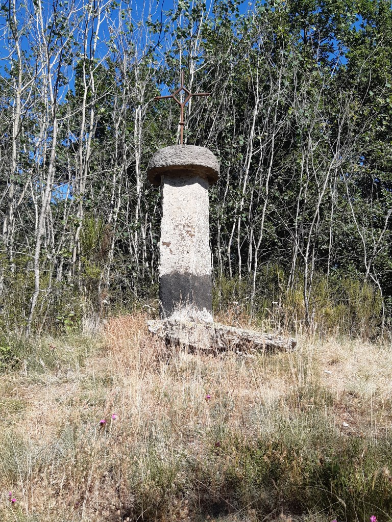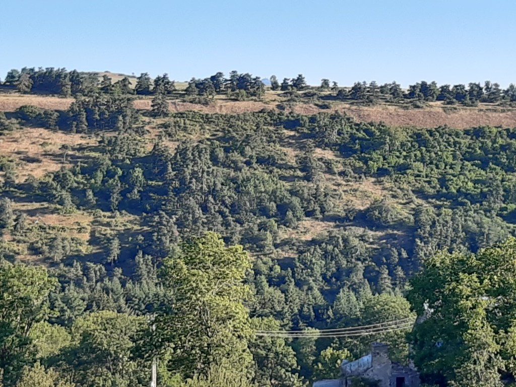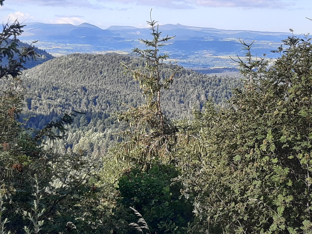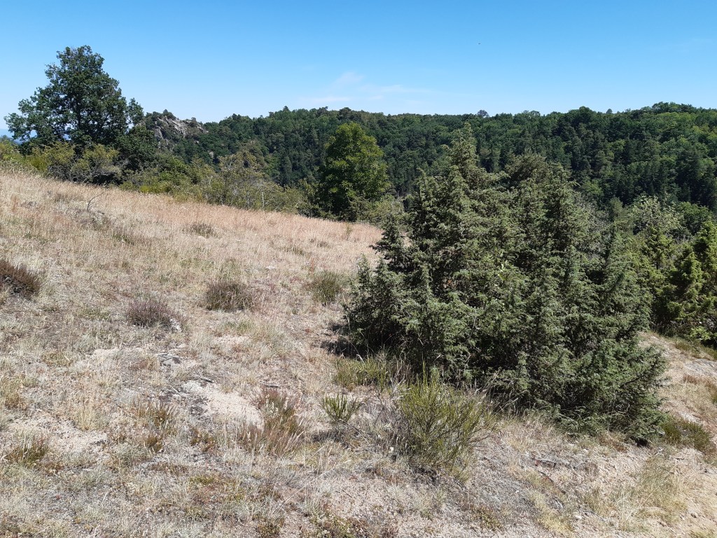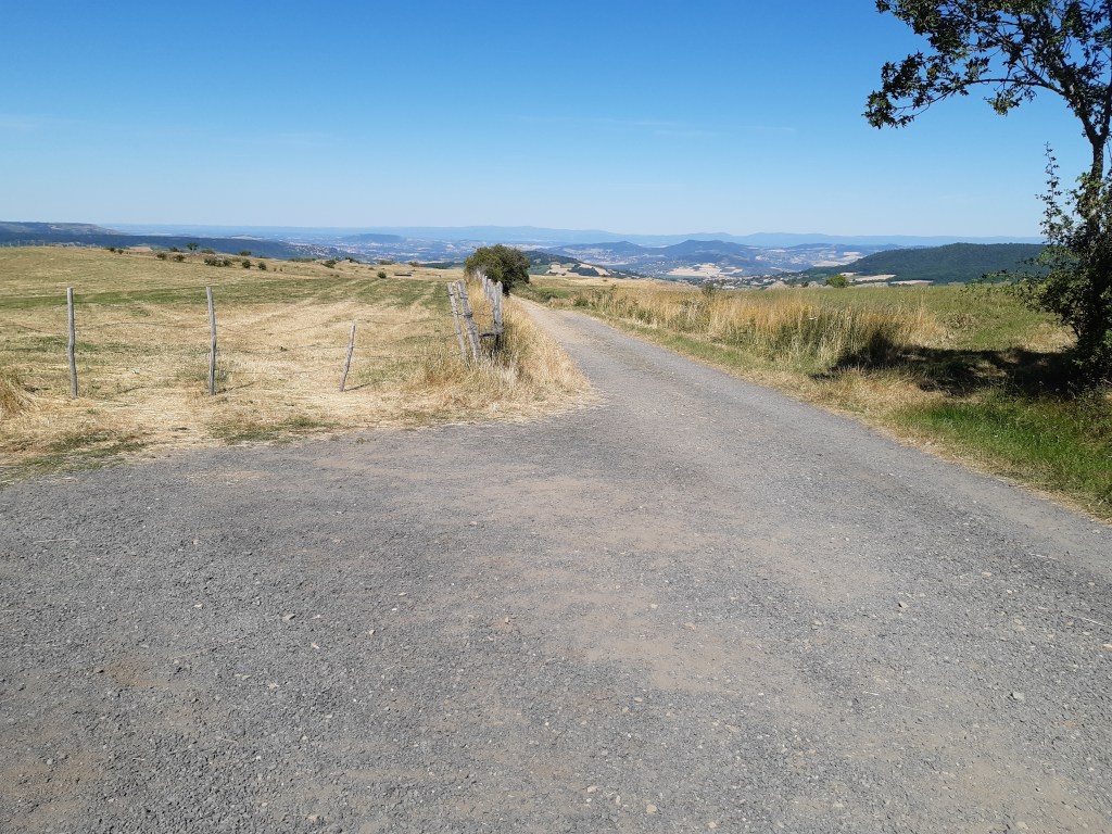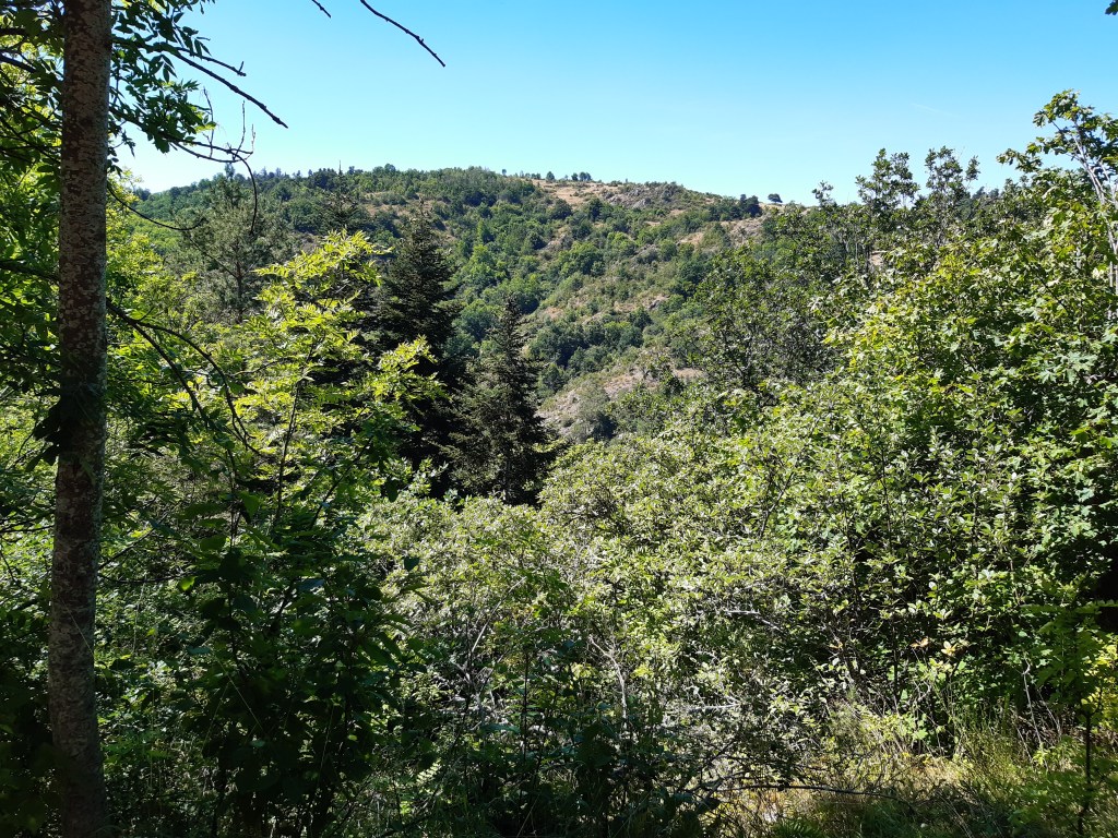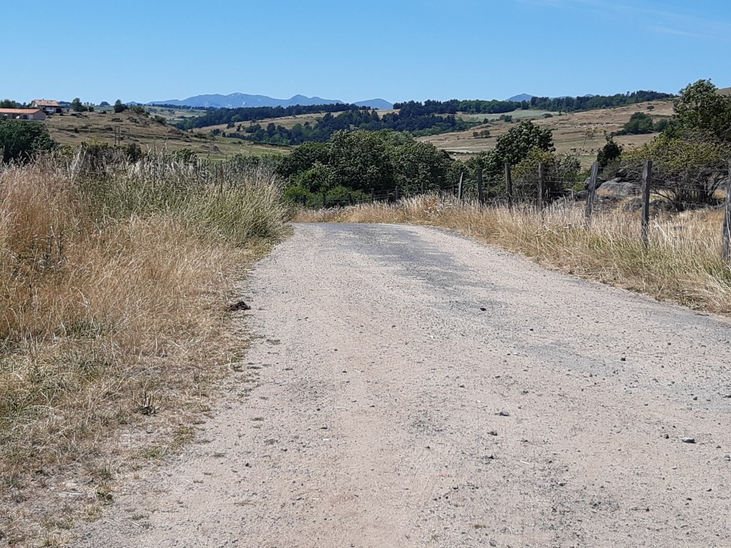 En suivant justement le GPS qui me conduit dans une impasse, je trouverai une chaussette que la jeune femme rencontrée à Phialeix avec son compagnon avait épinglée à son sac à dos. Les pinces à linge ne sont pas pratiques, une branche et le vêtement suspendu se retrouve au sol. Je leur préfère les épingles à nourrice beaucoup plus fiables. Dans cette zone, au sud de Cournols, les arbres sont plus rares, le sol est plus rocailleux, le soleil tape plus fort. Par ce jour caniculaire, la progression est plus fatigante, mais la vue est la récompense de cet effort.