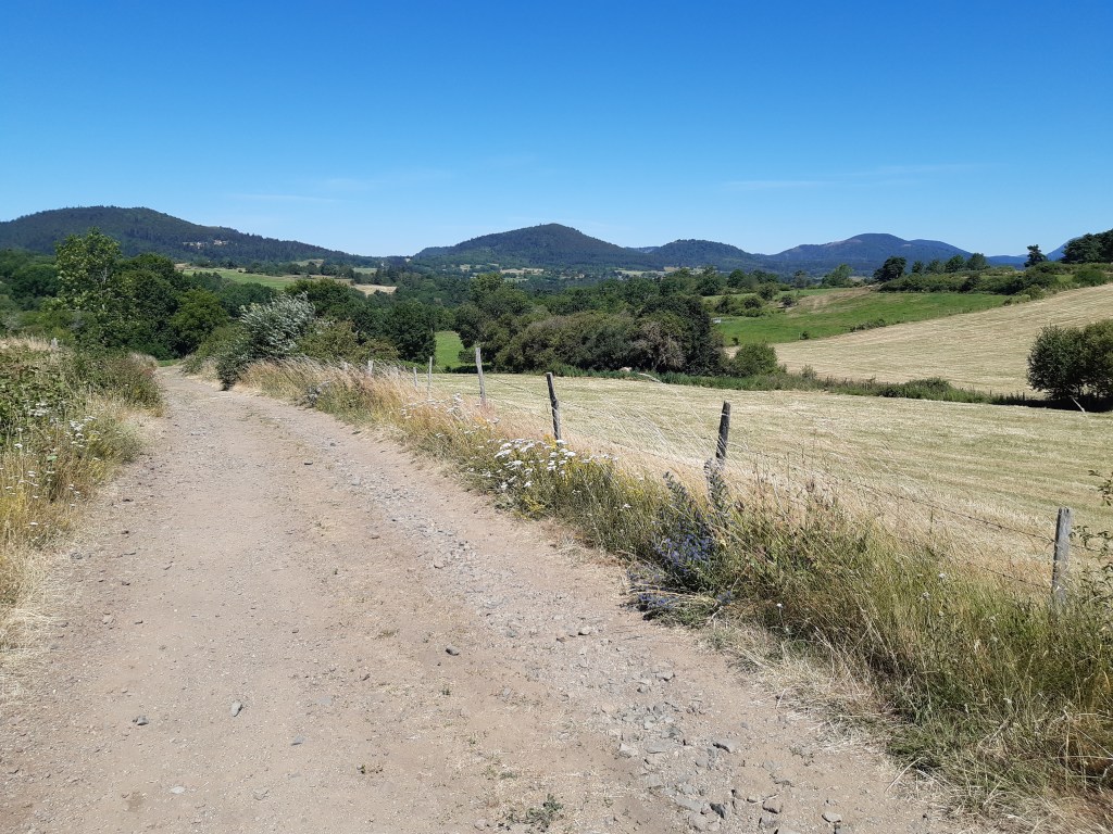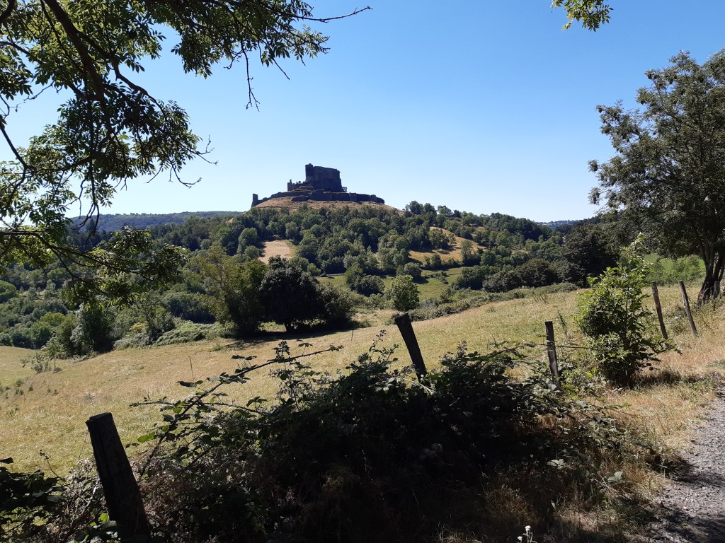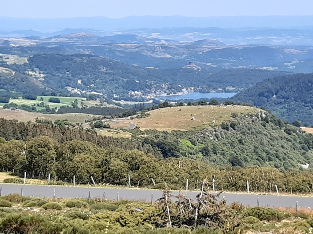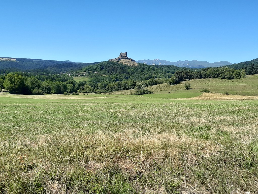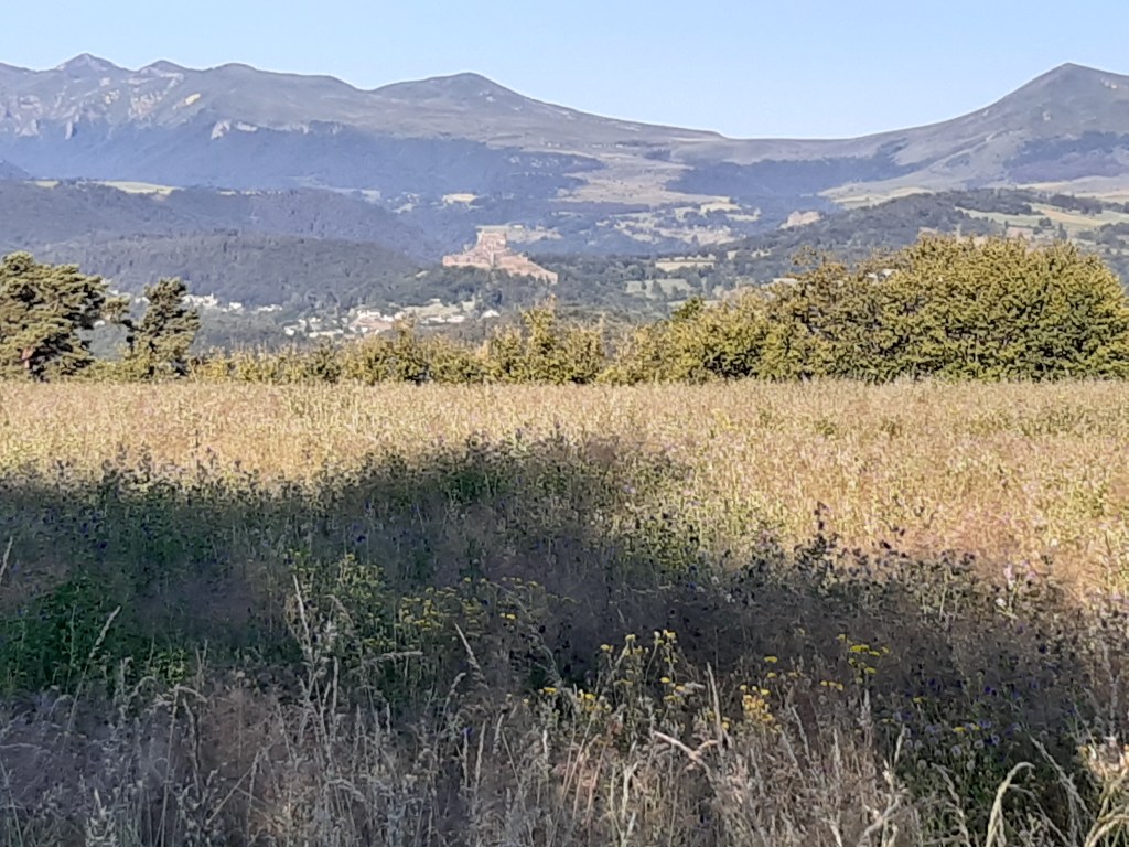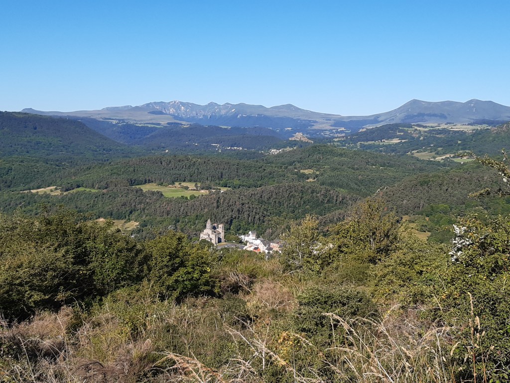 La vue depuis le plateau de Sailles est grandiose. La descente gravillonneuse nécessite quand même d’être vigilant, bien que n’étant pas très technique. Elle me conduit à Saint-Nectaire où je fais une petite pause-café dans un vrai café. Je me réhabitue progressivement à la civilisation. Je prends aussi des pains au chocolat à la boulangerie pour grignoter en chemin, et le dessert de ce midi. Les provisions sont pratiquement épuisées, si j’avais continué ma route, il aurait été temps de faire le plein. J’ai quand même tenu cinq jours en autonomie. Mais le chemin n’est pas terminé, il faut poursuivre. Et ce n’est pas tout plat. Pour sortir de Saint-Nectaire, ça monte… puis ça redescend. Je fais une pause pour reprendre mon souffle et changer de chaussettes. J’ai pris l’habitude, quand il fait chaud, de changer de chaussettes toutes les heures environ. Ça fait une pause, mais surtout, ça limite les ampoules causées par l’humidité. Lors de ma pause, un randonneur s’arrête à ma hauteur en me demandant si tout va bien, s’il peut m’aider. Je lui réponds que tout va bien et lui explique la raison de mon arrêt. L’homme me remercie de mon conseil qu’il va appliquer, car justement, les ampoules ralentissent sa marche. Il va à La Rochelle. Je lui suggère de profiter du cadre agréable de Murol pour prendre un jour de pause et soigner ses pieds.