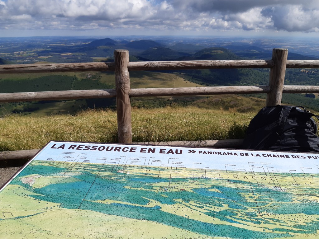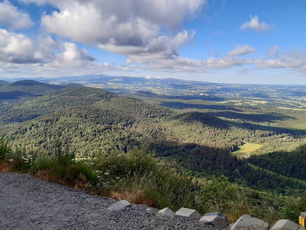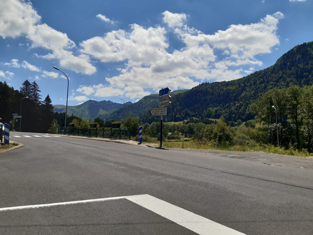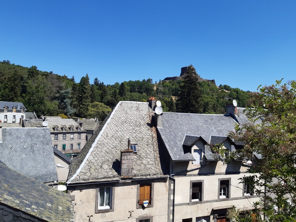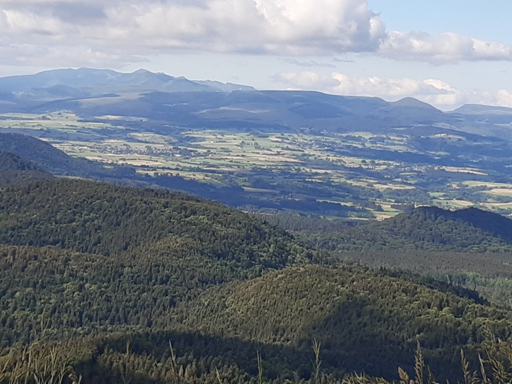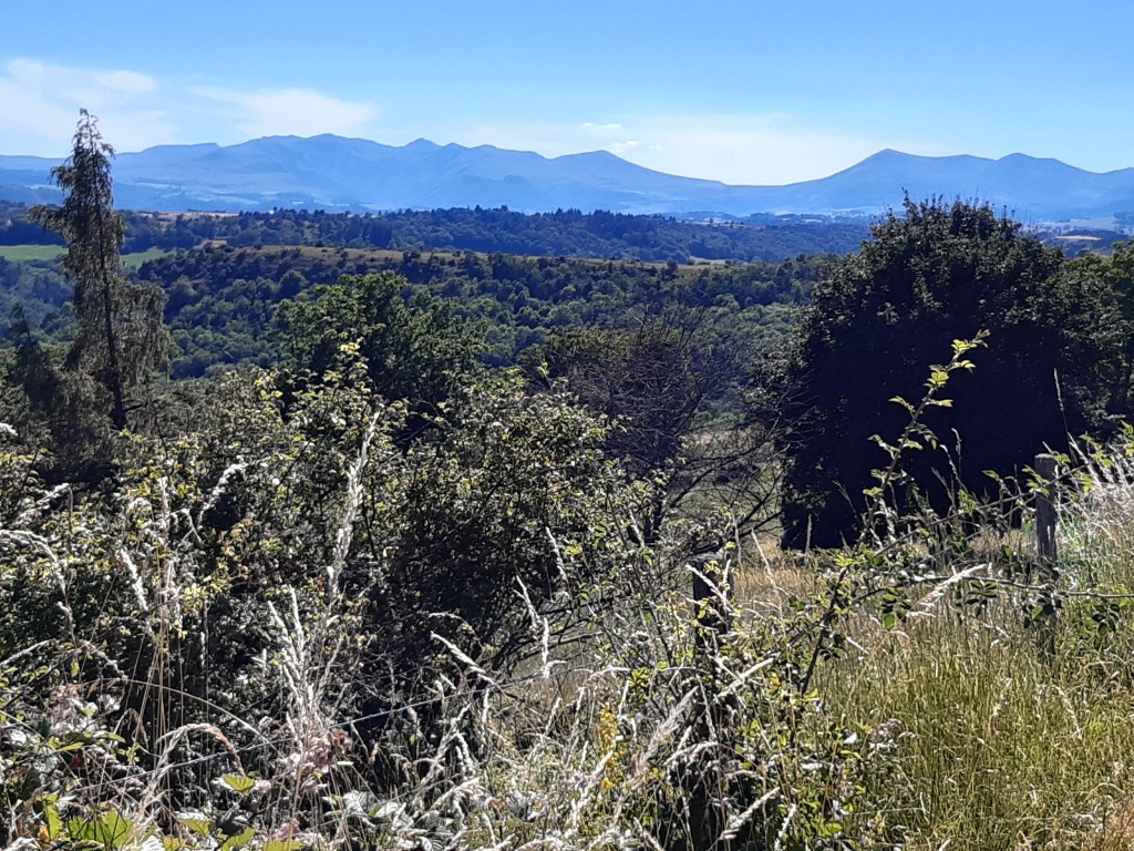 La vue depuis le plateau de Sailles est grandiose. La descente gravillonneuse nécessite quand même d’être vigilant, bien que n’étant pas très technique. Elle me conduit à Saint-Nectaire où je fais une petite pause-café dans un vrai café. Je me réhabitue progressivement à la civilisation. Je prends aussi des pains au chocolat à la boulangerie pour grignoter en chemin, et le dessert de ce midi. Les provisions sont pratiquement épuisées, si j’avais continué ma route, il aurait été temps de faire le plein. J’ai quand même tenu cinq jours en autonomie. Mais le chemin n’est pas terminé, il faut poursuivre. Et ce n’est pas tout plat. Pour sortir de Saint-Nectaire, ça monte… puis ça redescend. Je fais une pause pour reprendre mon souffle et changer de chaussettes. J’ai pris l’habitude, quand il fait chaud, de changer de chaussettes toutes les heures environ. Ça fait une pause, mais surtout, ça limite les ampoules causées par l’humidité. Lors de ma pause, un randonneur s’arrête à ma hauteur en me demandant si tout va bien, s’il peut m’aider. Je lui réponds que tout va bien et lui explique la raison de mon arrêt. L’homme me remercie de mon conseil qu’il va appliquer, car justement, les ampoules ralentissent sa marche. Il va à La Rochelle. Je lui suggère de profiter du cadre agréable de Murol pour prendre un jour de pause et soigner ses pieds.