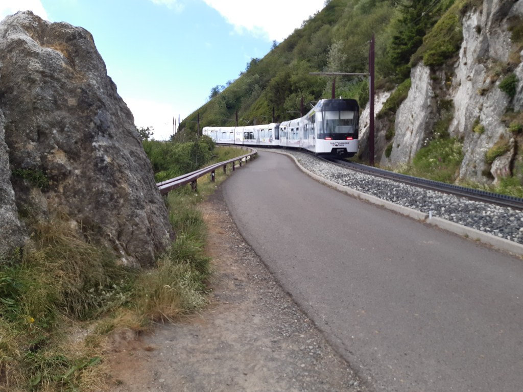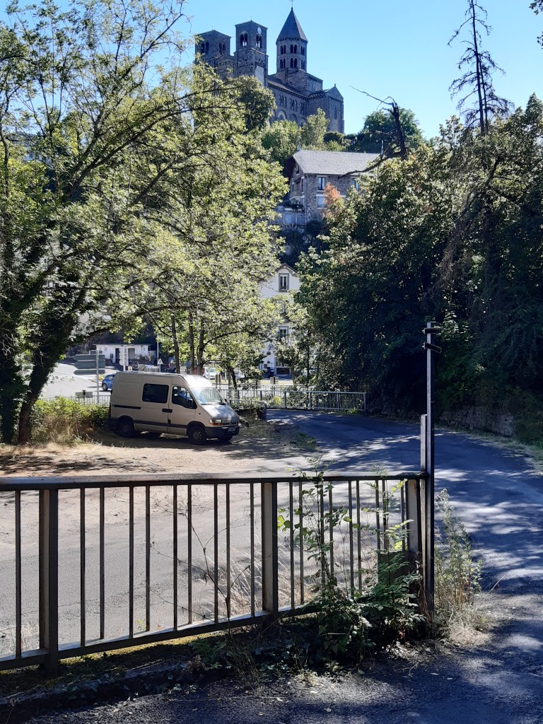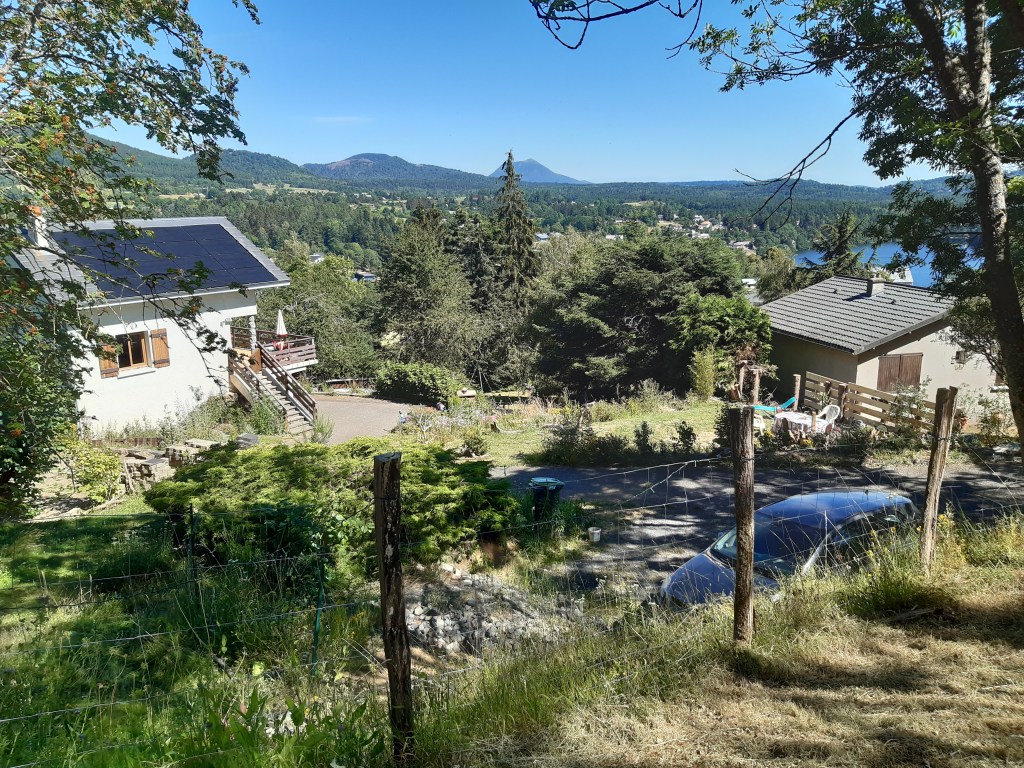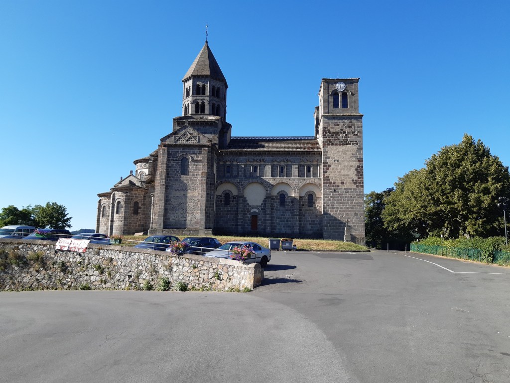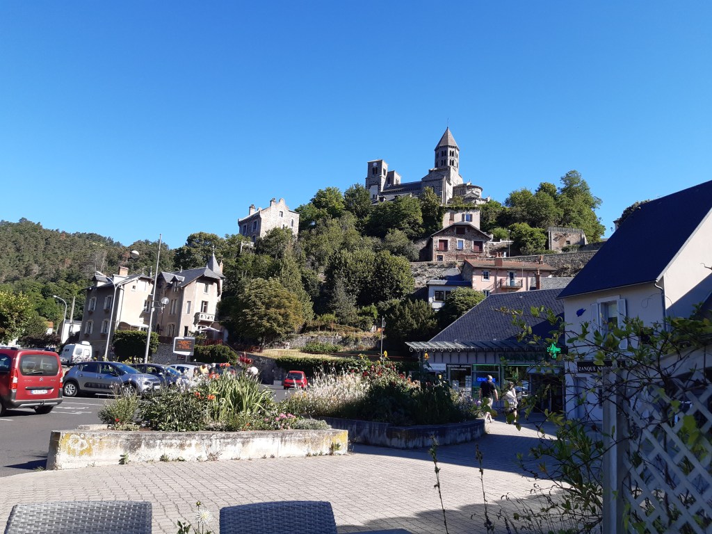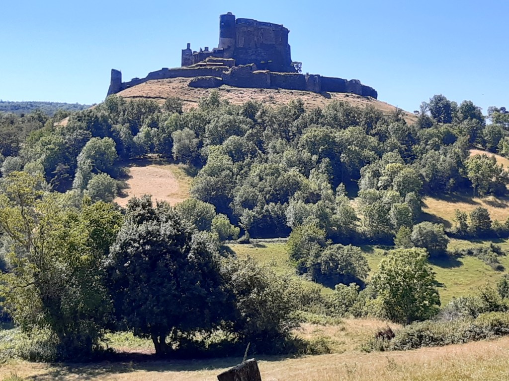 La vue depuis le plateau de Sailles est grandiose. La descente gravillonneuse nécessite quand même d’être vigilant, bien que n’étant pas très technique. Elle me conduit à Saint-Nectaire où je fais une petite pause-café dans un vrai café. Je me réhabitue progressivement à la civilisation. Je prends aussi des pains au chocolat à la boulangerie pour grignoter en chemin, et le dessert de ce midi. Les provisions sont pratiquement épuisées, si j’avais continué ma route, il aurait été temps de faire le plein. J’ai quand même tenu cinq jours en autonomie. Mais le chemin n’est pas terminé, il faut poursuivre. Et ce n’est pas tout plat. Pour sortir de Saint-Nectaire, ça monte… puis ça redescend. Je fais une pause pour reprendre mon souffle et changer de chaussettes. J’ai pris l’habitude, quand il fait chaud, de changer de chaussettes toutes les heures environ. Ça fait une pause, mais surtout, ça limite les ampoules causées par l’humidité. Lors de ma pause, un randonneur s’arrête à ma hauteur en me demandant si tout va bien, s’il peut m’aider. Je lui réponds que tout va bien et lui explique la raison de mon arrêt. L’homme me remercie de mon conseil qu’il va appliquer, car justement, les ampoules ralentissent sa marche. Il va à La Rochelle. Je lui suggère de profiter du cadre agréable de Murol pour prendre un jour de pause et soigner ses pieds.