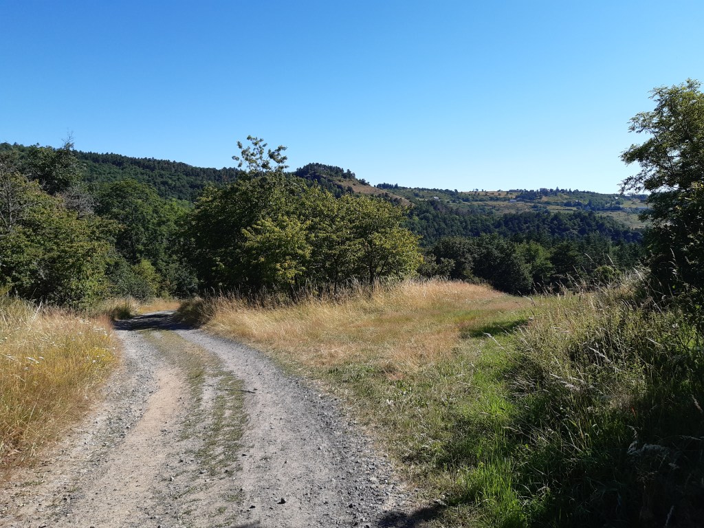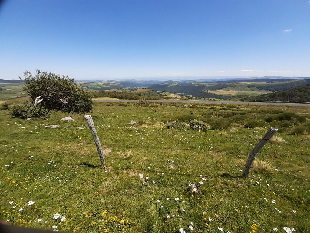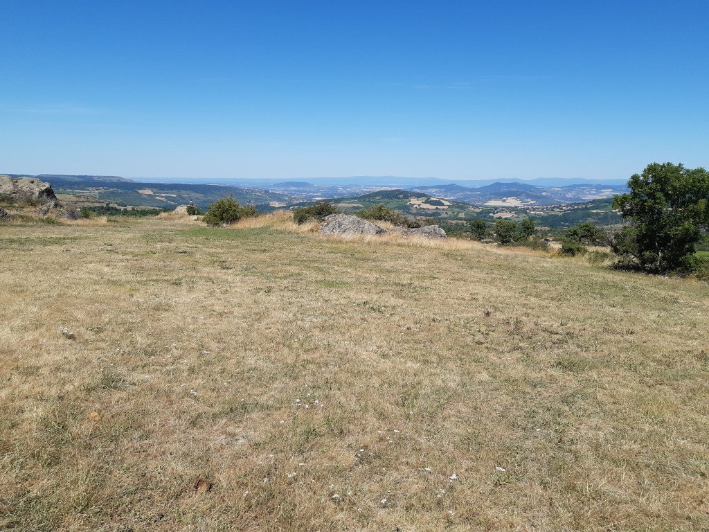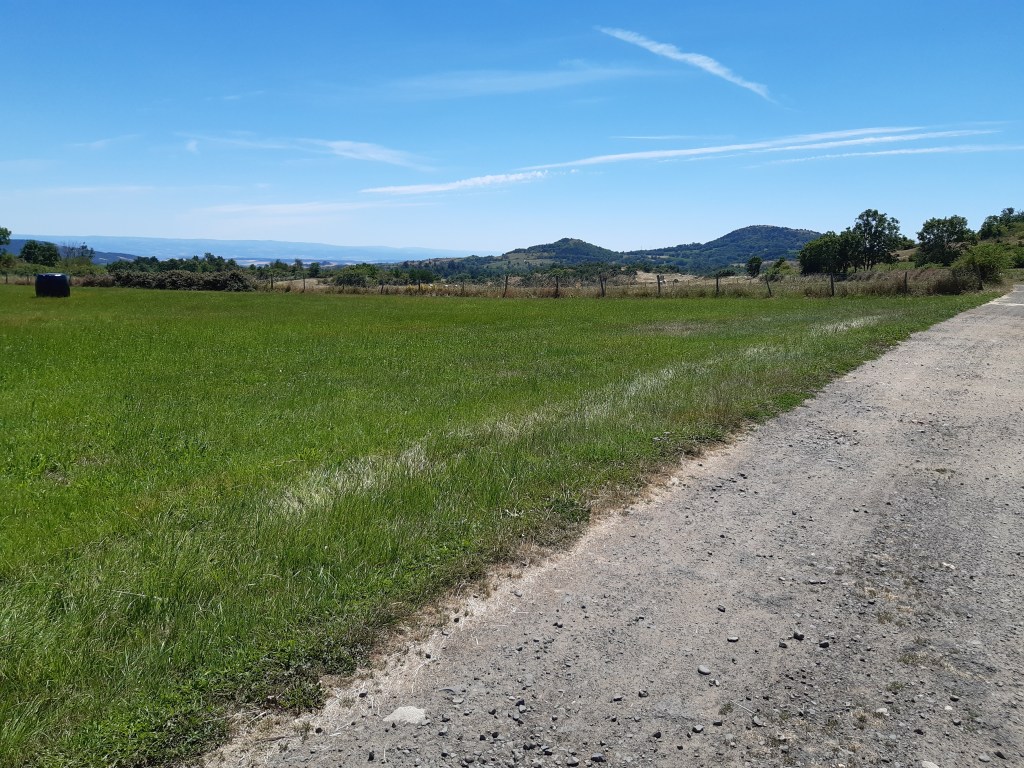 Il n’est pas tard, mais je décide de me mettre en quête d’un lieu de bivouac sans tarder. D’après la carte, le choix par ici n’est pas vaste, soit il faudra quitter le GR, soit je devrais me contenter d’un chemin ou un pré fraichement fauché. Je fais le tour du Puy-d’Olloix, redescends, et ne trouve pas mon bonheur. C’est la première fois que je passe autant de temps à chercher un lieu de bivouac. Je continue et remonte en direction de Lenteuge. Je devrais me contenter d’un chemin qui semble abandonné. Je pose mes affaires, fais un tour rapide et décide de m’installer là. Il n’est pas tard, mais je suis épuisé par la chaleur de cette journée. Comme d’habitude, j’attends que le soleil se couche (mais avant la nuit quand même) pour envisager de monter la tente. Heureusement, j’entends une voiture arriver. Pourtant le chemin n’a pas été fauché et en ce début juillet, l’herbe est très haute. Il semble que ce soit l’agriculteur du coin qui soit venu faire le tour de ses prairies (il y a des moutons dans le pré au bord duquel je suis installé). Le paysan roule doucement, me salue et s’arrête un peu plus loin. Je me dis que je vais probablement me faire éjecter… mais non, il attend simplement ses chiens qui font leur sport quotidien en suivant la voiture, de loin.