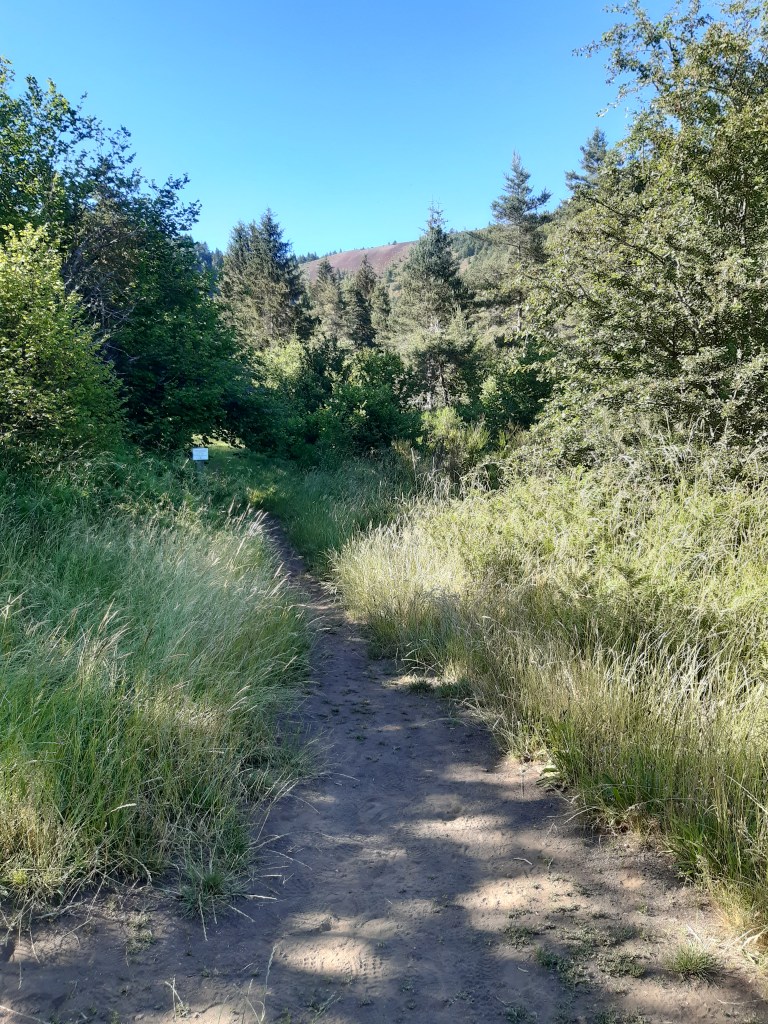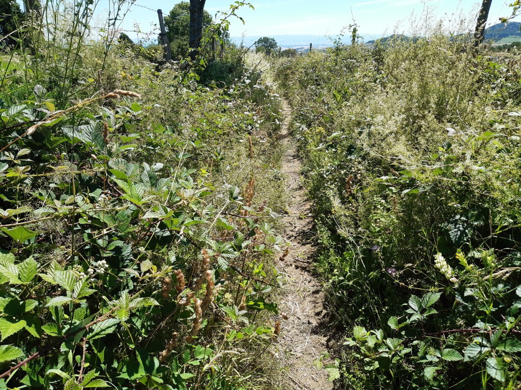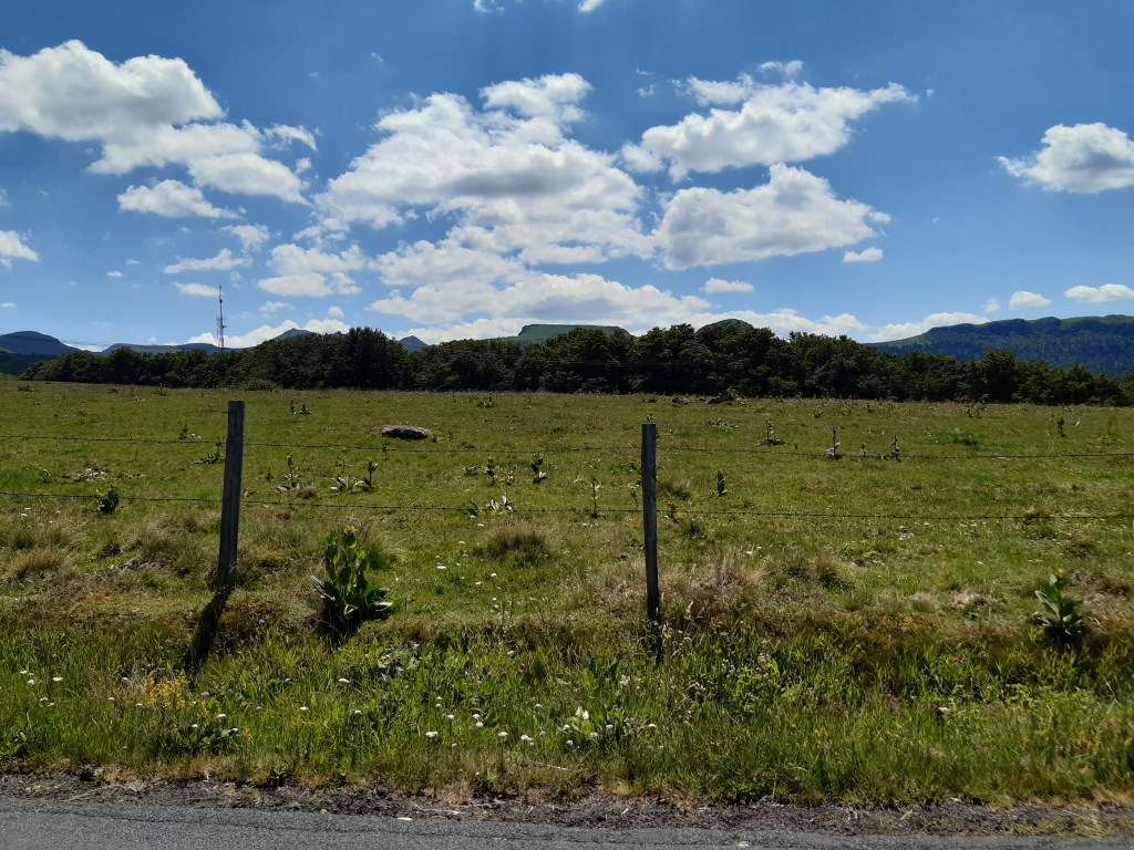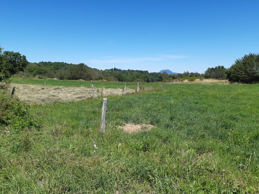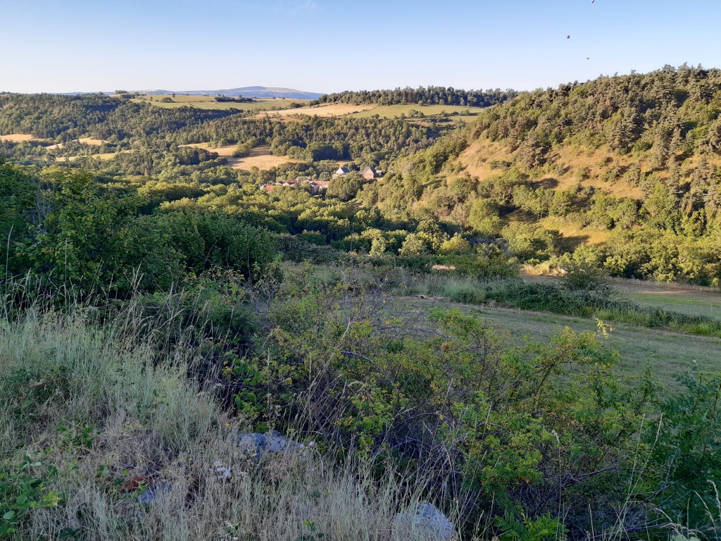 Il n’est pas tard, mais je décide de me mettre en quête d’un lieu de bivouac sans tarder. D’après la carte, le choix par ici n’est pas vaste, soit il faudra quitter le GR, soit je devrais me contenter d’un chemin ou un pré fraichement fauché. Je fais le tour du Puy-d’Olloix, redescends, et ne trouve pas mon bonheur. C’est la première fois que je passe autant de temps à chercher un lieu de bivouac. Je continue et remonte en direction de Lenteuge. Je devrais me contenter d’un chemin qui semble abandonné. Je pose mes affaires, fais un tour rapide et décide de m’installer là. Il n’est pas tard, mais je suis épuisé par la chaleur de cette journée. Comme d’habitude, j’attends que le soleil se couche (mais avant la nuit quand même) pour envisager de monter la tente. Heureusement, j’entends une voiture arriver. Pourtant le chemin n’a pas été fauché et en ce début juillet, l’herbe est très haute. Il semble que ce soit l’agriculteur du coin qui soit venu faire le tour de ses prairies (il y a des moutons dans le pré au bord duquel je suis installé). Le paysan roule doucement, me salue et s’arrête un peu plus loin. Je me dis que je vais probablement me faire éjecter… mais non, il attend simplement ses chiens qui font leur sport quotidien en suivant la voiture, de loin.