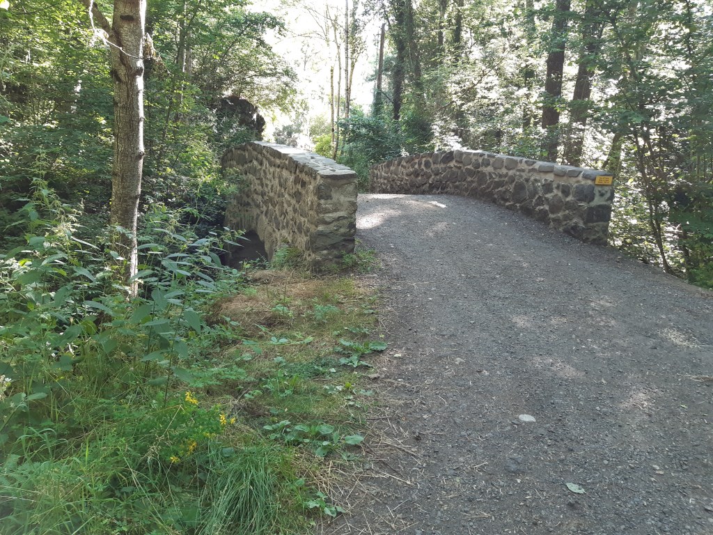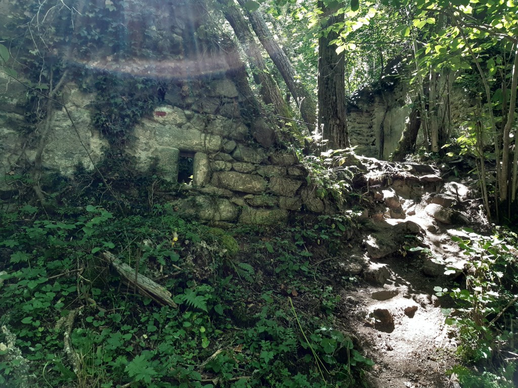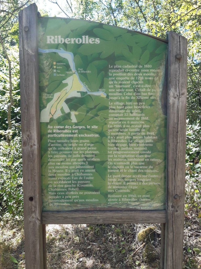 J’approche des gorges de la Monne et profite d’un bosquet pour faire une pause plus longue et grignoter une barre de céréales. J’avais vu sur Internet beaucoup de photos et récit soulignant la beauté du site. Je n’avais pas noté que la descente était si périlleuse. Effectivement c’est splendide, magique même. Mais avec 15 kg sur le dos, les bâtons de marche sont conseillés (mais il ne faut pas mettre les dragonnes) et les chaussures adaptées indispensables. J’aurais bien profité de la Monne pour faire trempette, mais cette chaude journée de juillet avait conduit là, de nombreux groupes de jeunes ayant eu la même idée. Je décide donc de reprendre mon chemin et m’arrêter au cimetière d’Olloix faire un brin de toilette et de lessive.