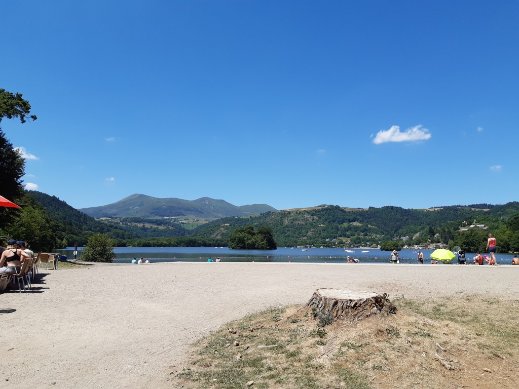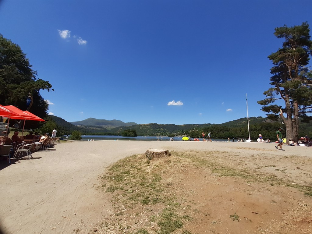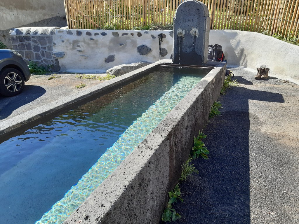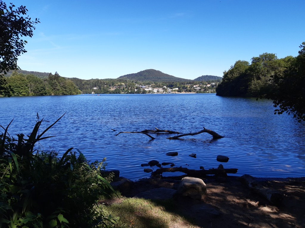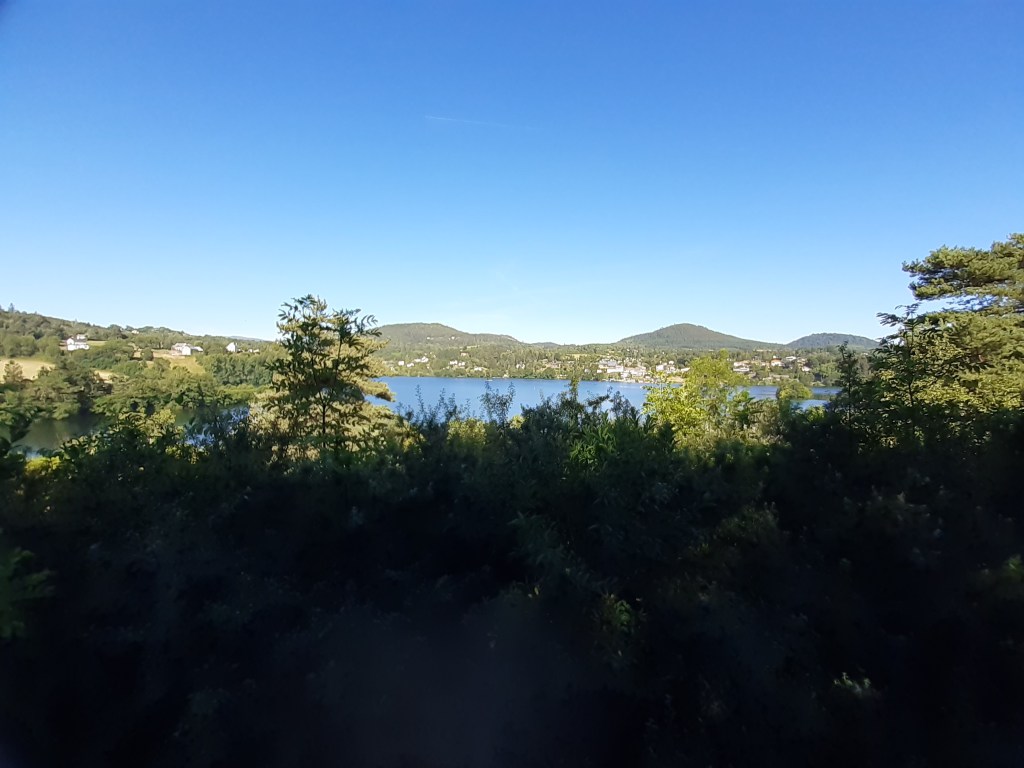 Départ de mon joli spot toujours avec les booms-booms. La nuit a été rythmée par cette musique (enfin ces sons), mais n’a en rien entaché mon sommeil réparateur. Direction La Cassière. J’arrive par un sentier très agréable qui traverse la route D2089 par en dessous grâce à un petit tunnel. Le village se réveille, je choisis de suivre le bord du lac ponctué de pêcheurs plutôt que prendre de la hauteur en suivant le GR30. Je rattrape le GR à Rouillat-Bas et poursuis en longeant le lac d’Aydat. Malgré la fatigue physique accumulée qui se manifeste par quelques douleurs (pieds, dos, genou, cou…), je trouve ce passage très agréable et la vue toujours aussi belle. Le Puy-de-Dôme est encore visible. C’est fou, il est présent partout, comme un phare. Même quand on ne le cherche pas, il est là au détour d’un chemin. Je décide d’aller à Aydat faire le plein d’eau. Il y a une jolie fontaine, l’eau est potable. La voisine vient remplir de ses bidons pour faire la cuisine, le café, le thé… Quelle chance d’avoir une eau aussi pure en libre-service devant la maison. Cuisiner à la Volvic qui n’est pas passée par l’usine ni mise en bouteille plastique, ce doit être un vrai bonheur.