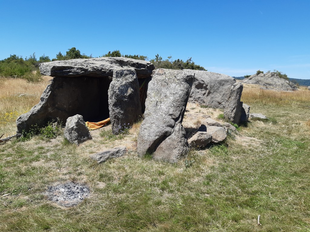Je passe à proximité d’un site à ne pas manquer le dolmen de Sarou (ou dolmen de la grotte). J’y fais une brève pause, car plusieurs familles sont venues pique-niquer ici et le seul arbre est donc occupé.