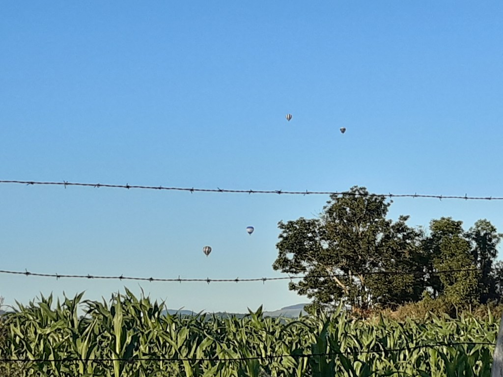 Comme souvent lorsqu’une belle journée s’annonce dans les volcans, les montgolfières s’élèvent tôt le matin, ajoutant un spectacle aux montagnes rougissantes. Les hameaux se réveillent, rythmés par la vie agricole. Le paysage change au fur et à mesure que j’avance. Le Sancy prend la place du Puy-de-Dôme comme point de repère. Les montées sont parfois rudes et les points de vue se méritent. Mais quel bonheur en arrivant sur les hauteurs d’apercevoir la vallée de Chaudefour et le massif du Sancy tout au fond, Murol juste derrière Saint Nectaire.