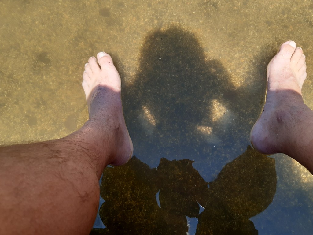 Le repas prix, je me dirige vers le Tartaret, longe la plage de Murol. Je croise le jeune couple qui m’avait doublé à Phialeix. Je le reconnais trop tard, sinon je leur aurais suggéré de ne plus utiliser les pinces à linge pour faire sécher les chaussettes sur le sac à dos. Tant pi, ils en feront certainement la déduction par eux-mêmes. Je vais jusqu’à la voiture me décharger de mon sac et retourne déambuler les pieds dans l’eau. Et je découvre une ampoule sous le pied. Si j’avais dû continuer, je me serais accordé un jour ou deux au camping histoire de prendre une bonne douche et de profiter du paysage encore un peu. Je reviendrais, c’est sûr.