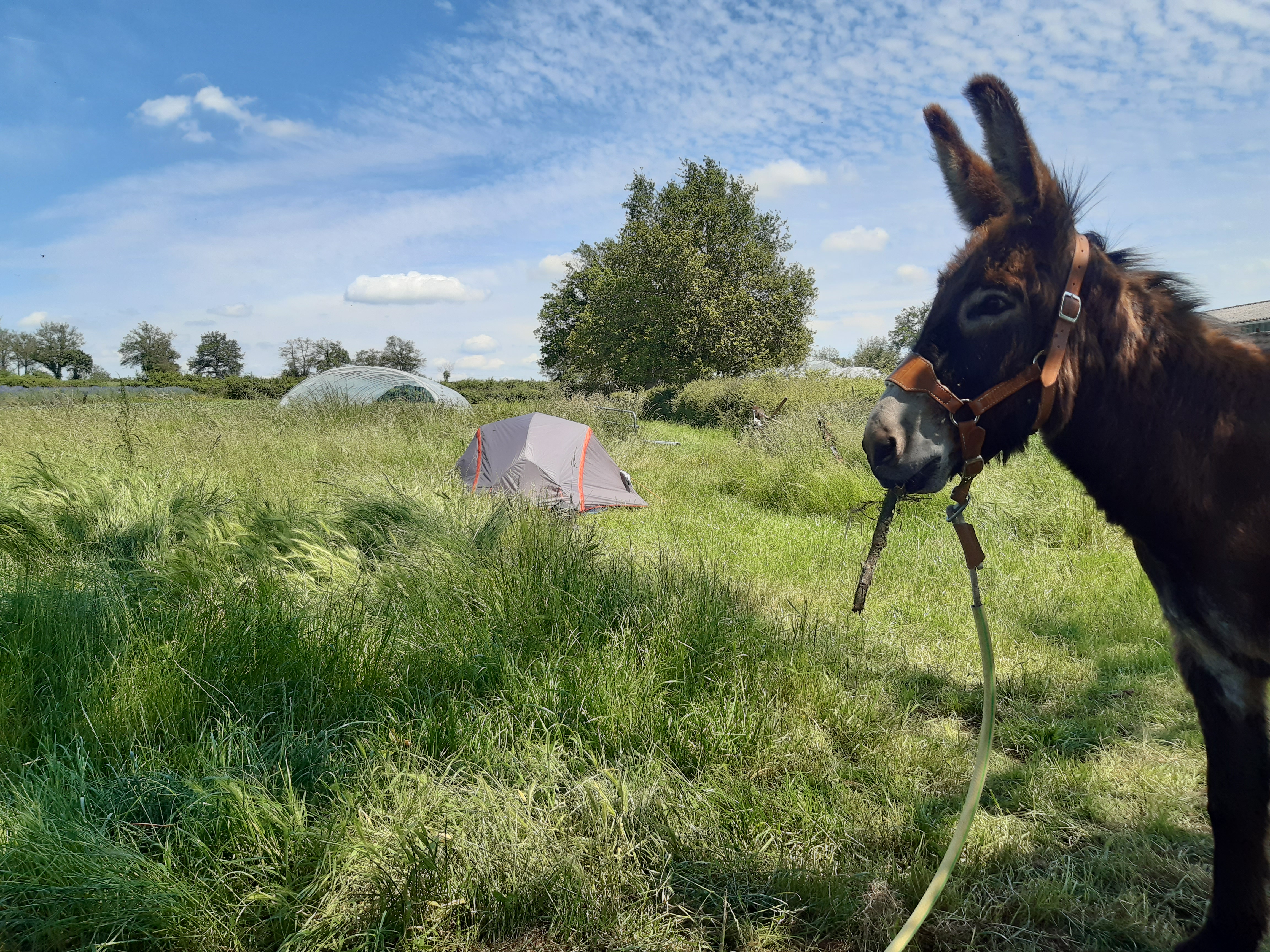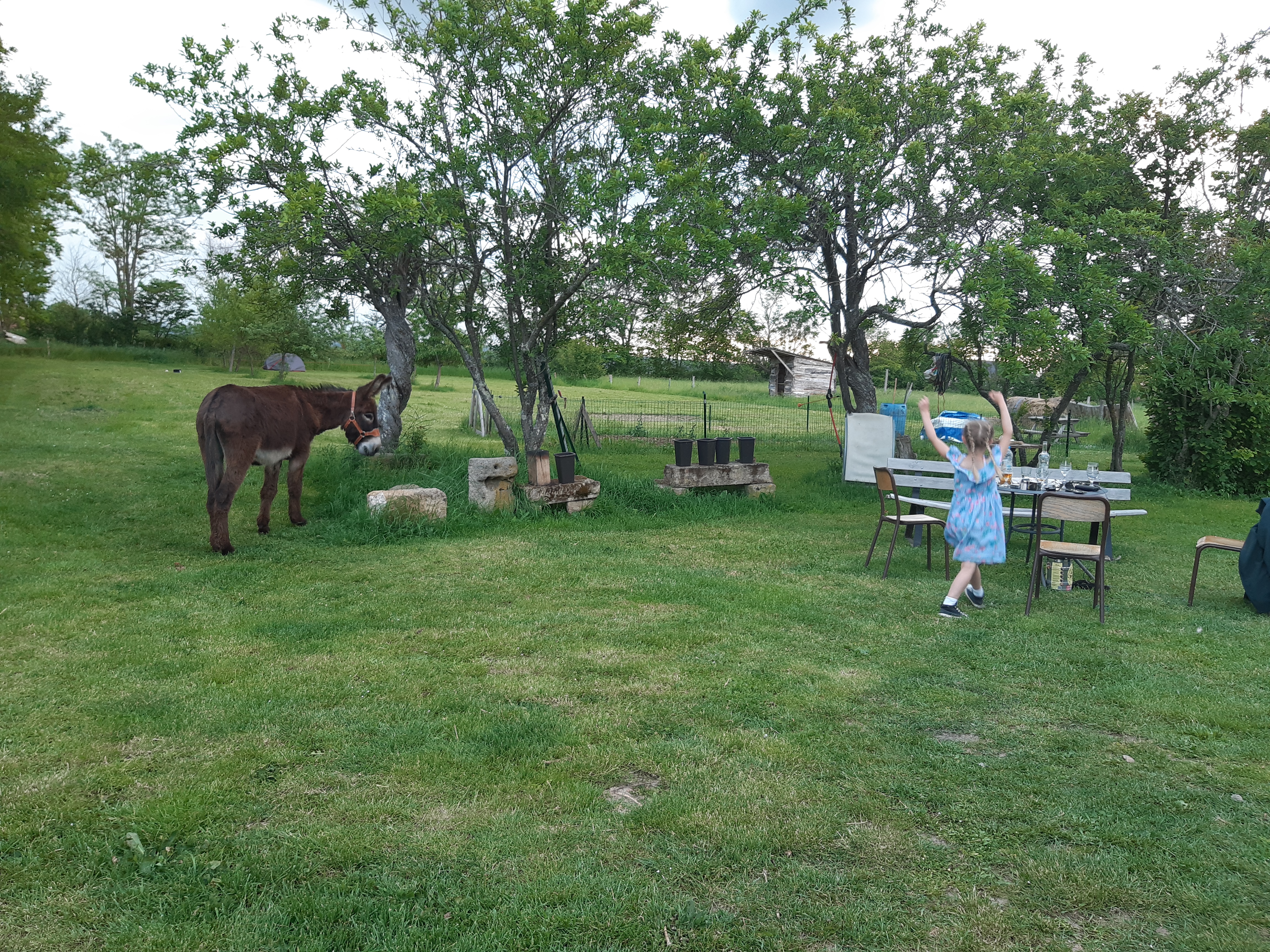 Au détour d’un chemin, Honoré s’arrête et semble attendre quelqu’un. Je ne vois rien ni personne et je me dis que c’est certainement le bât qui a un peu glissé en accrochant une barrière, on en a croisé quelques unes… J’ajuste le harnachement mais il fait demi tour. Il a vu Martine (il y a beaucoup de Martine par ici) qui a arrêté son vélo plus haut et qui veut le saluer. On discute un instant et il se trouve qu’elle habite au bord de notre parcours, près de l’endroit où j’envisageais de bivouaquer. Rendez-vous est pris, on arrive. Martine et Yves ont deux ânesses avec qui Honoré va pouvoir gambader, c’est chouette pour lui. Moi j’ai un beau jardin pour planter la tente, une bonne douche et un repas chaud avec Martine et Yves. Encore une soirée agréable, comme toujours dans le Tarn. Ce matin je prends un petit café et il est déjà l’heure de se mettre en marche.