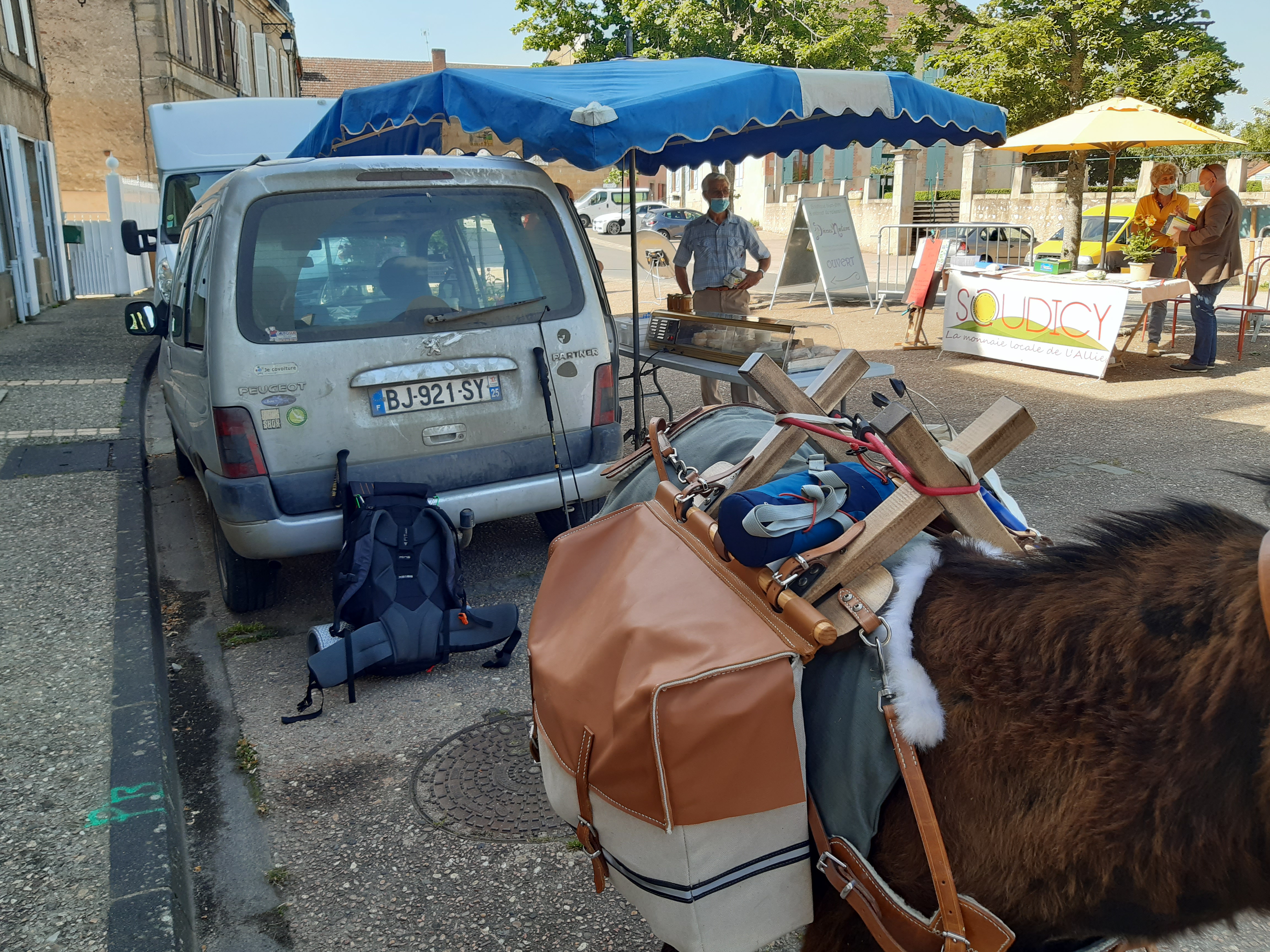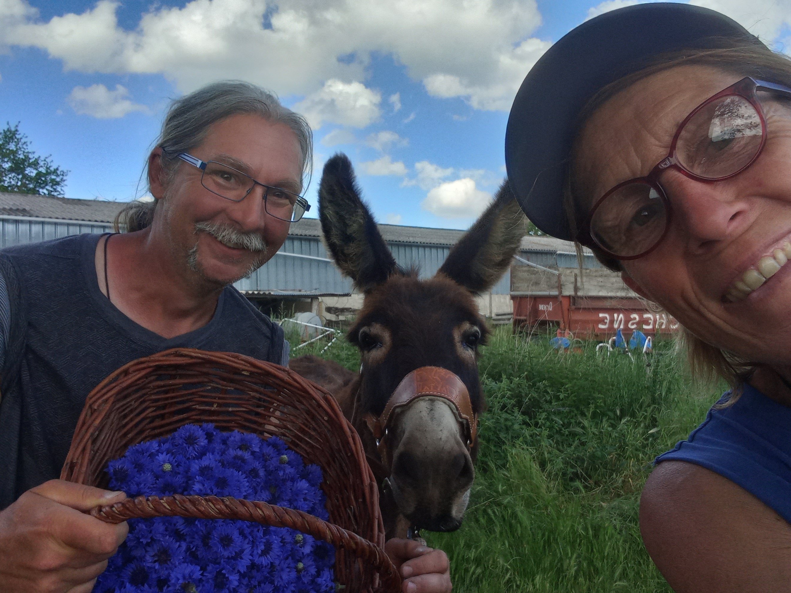 La traversée de Souvigny s’est super bien passée. J’ai même pu m’arrêter à la pharmacie, Honoré attaché devant qui m’attendait sagement. Il était l’attraction du village et nous avons été interpellés de nombreuses fois. Le chemin nous a ensuite réservé une surprise incroyable. Je m’arrête demander de l’eau et un lieu de bivouac à un couple dans son jardin, la dame, ne pouvant pas m’accueillir, va demander à son voisin. Quand je regarde chez le voisin, je reconnais un nom qui m’est familier sur le camion. Là, un type sort. Et ho stupeur, c’est Fabien que j’ai connu tout petit et que j’emmenais à la pêche quand il venait en vacances chez sa sœur Valérie, amie d’enfance, et en plus, à l’époque, collègue de travail et voisine. Tant de souvenirs remontent. Du coup je suis invité à l’apéro et même à dîner, soirée téléphone et émotions avec Valérie, Fabien me présente sa charmante petite famille. C’est magique, incroyable, émouvant. Wahou ! Merci Fabien bises et à bientôt 😉. Départ difficile du coup le lendemain matin, mais je suis tout près de Saint Menoux, je vais passer faire quelques petits coucous au marché et bien sûr à D’Âmes Nature (https://www.d-ames-nature.com/) Là encore Honoré attire tous les regards de bienveillance. Bruno, mon ancien voisin de marché, m’offre un fromage, Céline de D’âmes Nature, une nouvelle pierre pour Honoré. Merci pour toute cette bienveillance. Mais Honoré n’est pas très motivé aujourd’hui. Je le sens fatigué et moi aussi. Alors j’appelle Corinne et lui demande si je peux bivouaquer 1 ou 2 jours sur sa ferme. Et c’est donc parti pour deux jours de woofing à « coucou le jardin de l’essentiel ». Encore de belles rencontres et deux jolis dessins offerts par la petite voisine de la ferme de Corinne, Adélie qui a 7 ans et qui a fait le portrait de « lane ». Merci Adélie pour cette gentille attention. Merci à Corinne et son homme pour l’accueil, la cueillette des Bleuets… un séjour réparateur. Décidément ce chemin réserve bien des surprises.