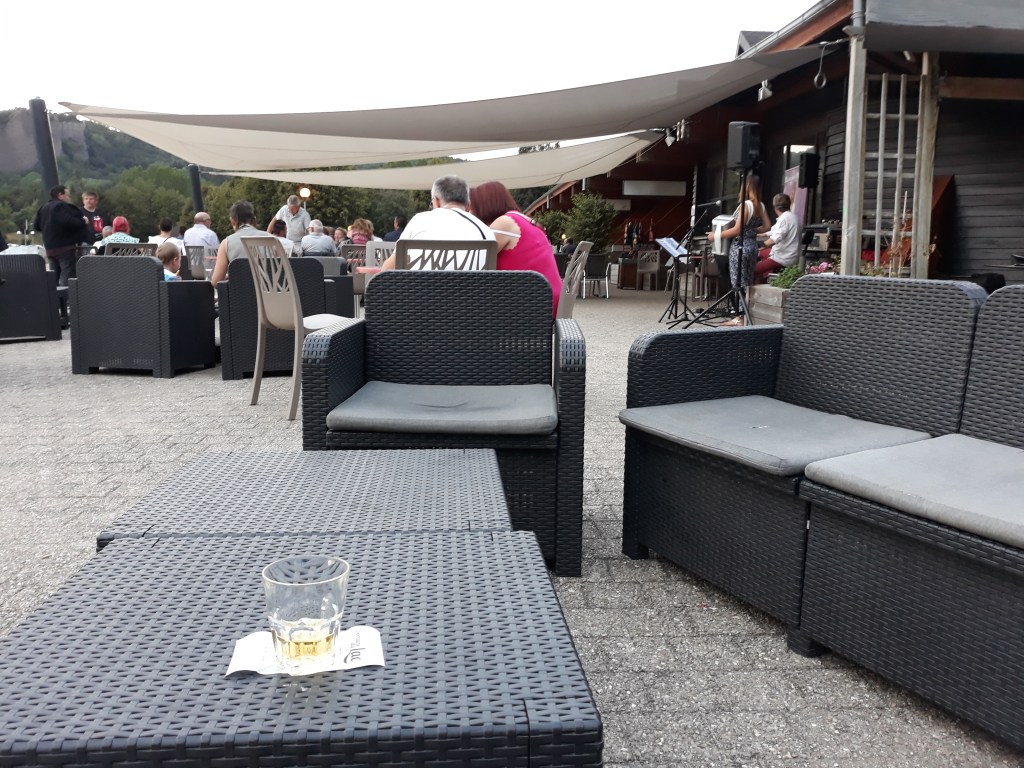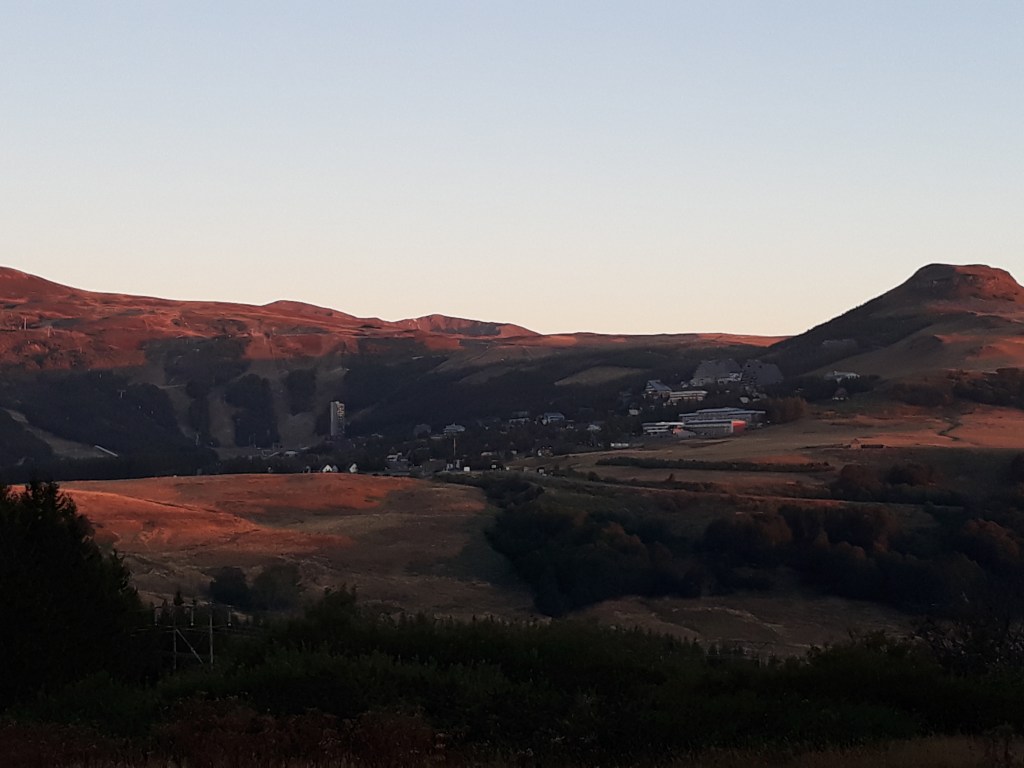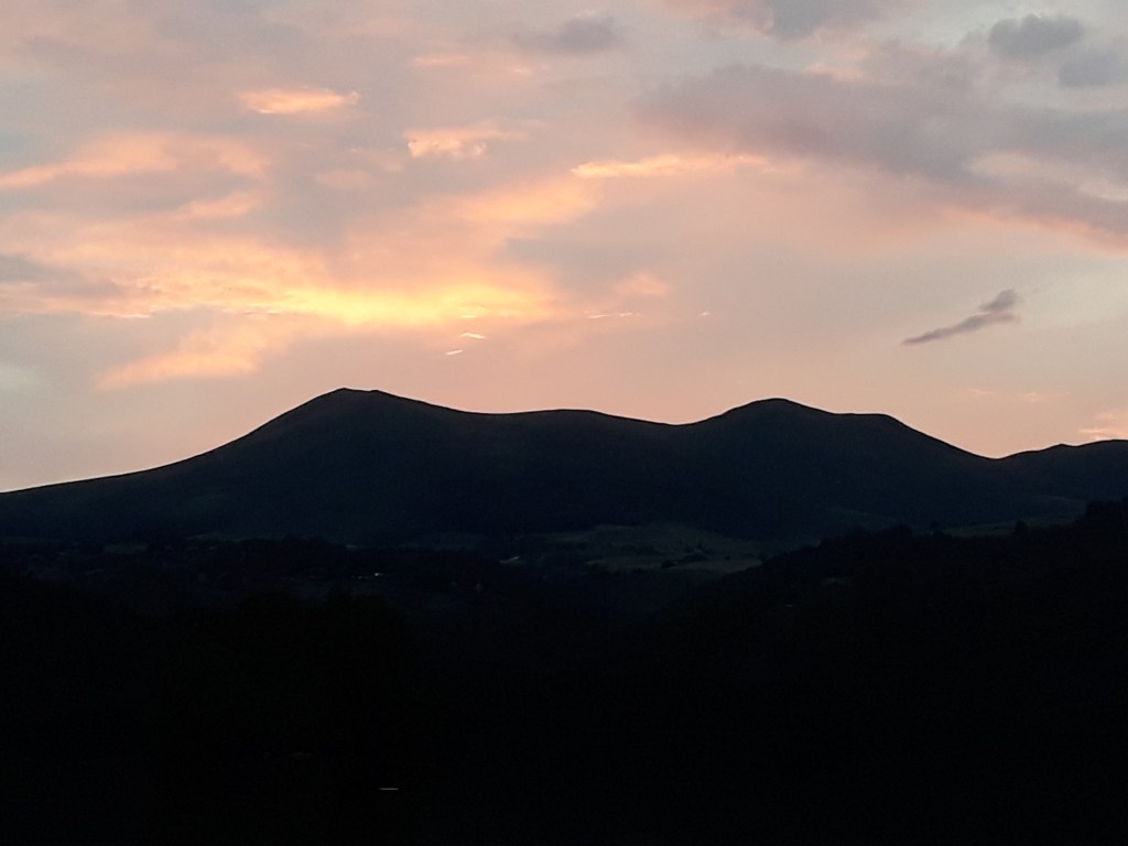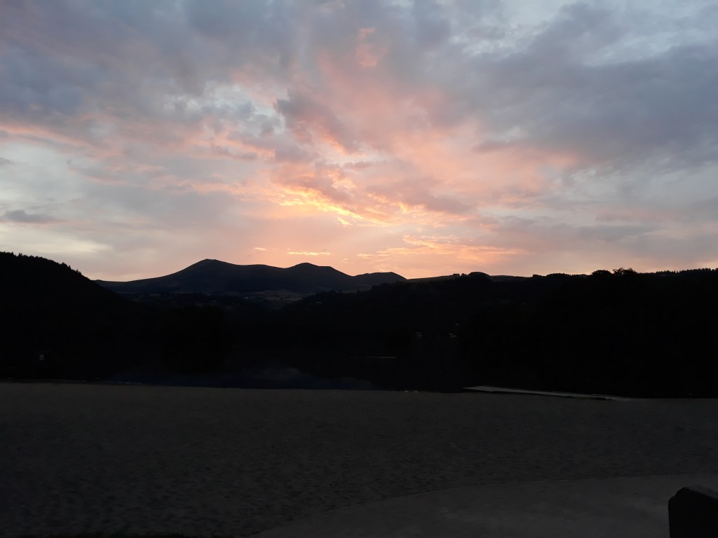 Je rentre au camping, mais laisse la voiture sur le parking extérieur car elle sent le gazoil et je ne veux pas devoir supporter cette odeur près de la tente. Ce soir au camping, il y a un apéro concert. Une jeune fille à l’accordéon accompagné par un clavier, propose des chansons de la variété française. je pense à mes amis David, Christophe ou encore François. Je profite de l’instant pour déguster un whisky au soleil couchant sur le massif du Sancy.