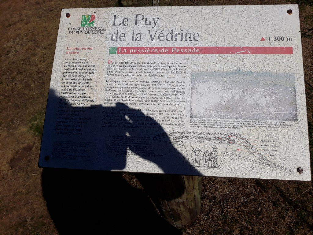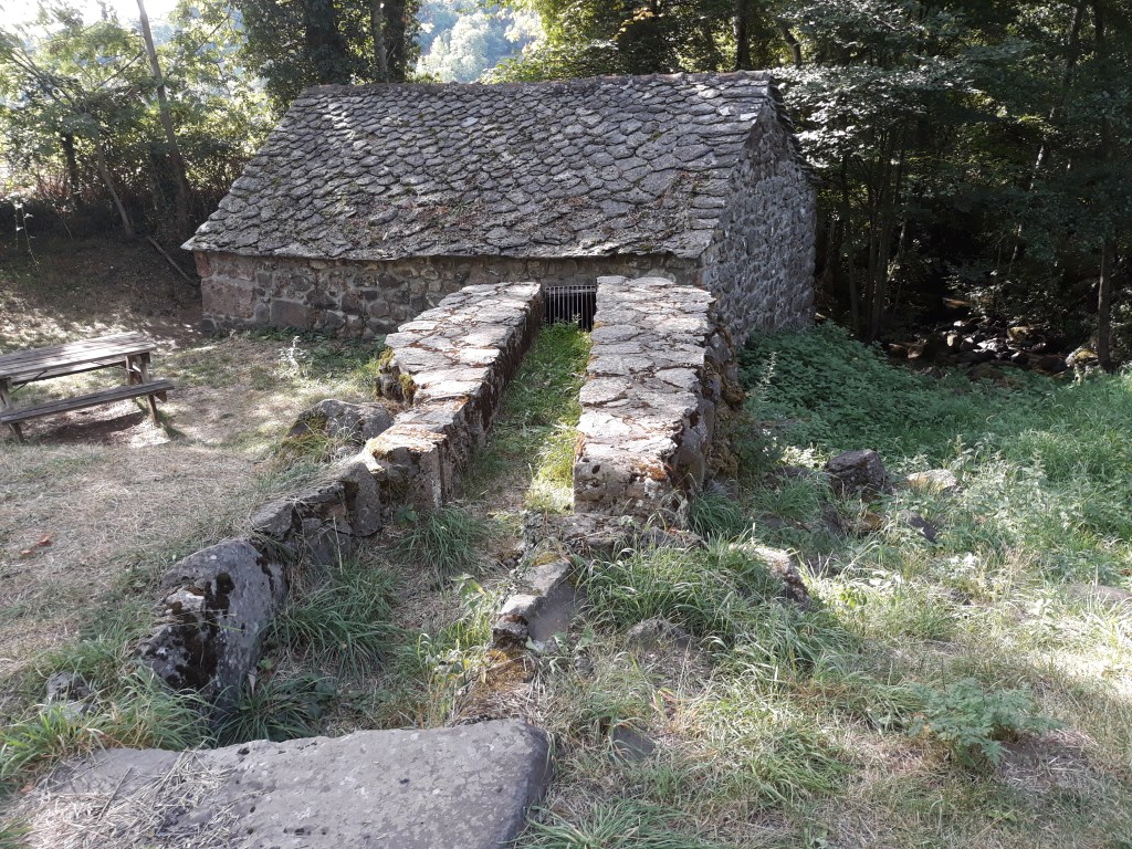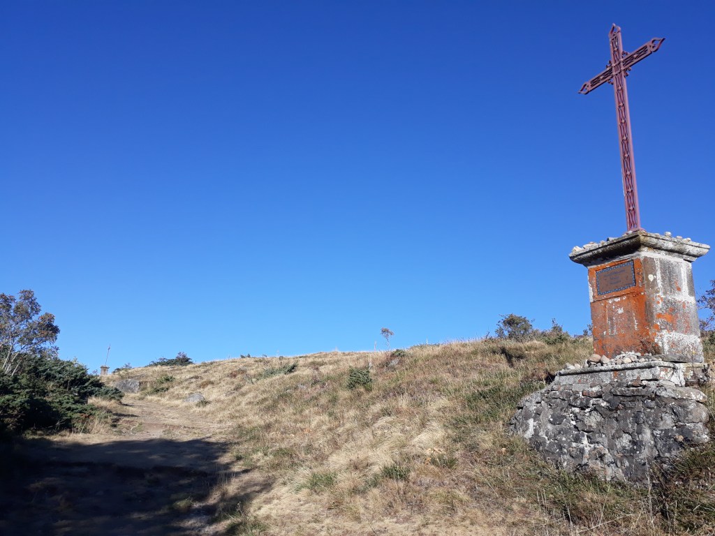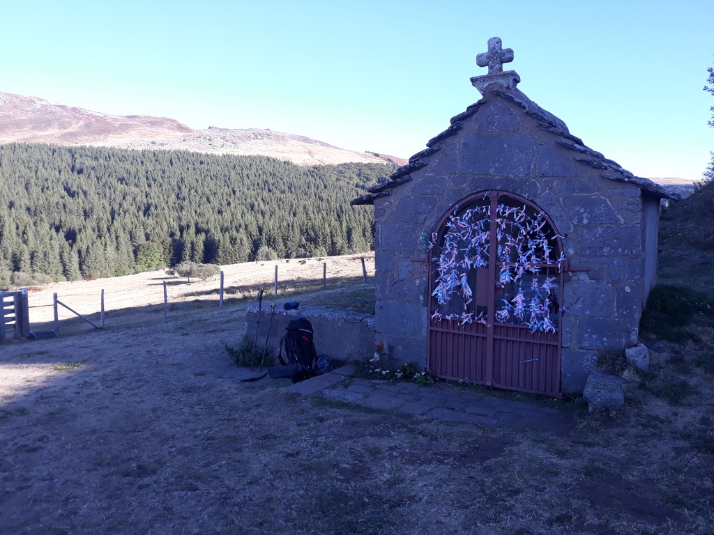 La descente entamée la veille se poursuit ce matin et commence par un bosquet très agréable avec ses odeurs de pin frais et la rosée. S’en suit un passage entre deux lignes à haute tension, beaucoup moins agréable. Pour ce passage, je m’imagine que ce sont des remontées mécaniques… il faut faire marcher son imagination. La descente forestière se termine sur une portion de la route qui mène de Besse à Picherande. Puis, à la baraque de Vassivière, je découvre un autre chemin que celui que je m’étais tracé, celui du pèlerinage de Vassivière. Chaque année en juillet, la vierge noire est montée depuis l’Église de Besse-en-Chandesse, en procession jusqu’à la chapelle de Vassivière à 8 km. La redescente, appelée aussi la dévalade, se déroule le dimanche qui suit la Saint Matthieu en septembre. Ce n’est pas par motivation religieuse, mais je choisi de prendre le chemin du pèlerinage qui de toutes manières arrive au même point que le GR4A, le bitume en moins. et puis comme j’envisage de faire le chemin de Compostelle l’année prochaine, ce sera un bon exercice. Le chemin est ponctué d’une quinzaine de croix, à chacune son propre sermon. Le pèlerinage s’arrête à la chapelle qui jouxte un gîte. Sous la chapelle se trouve une source d’eau potable qui arrive à temps pour remplir mes gourdes à sec depuis le café de ce matin.