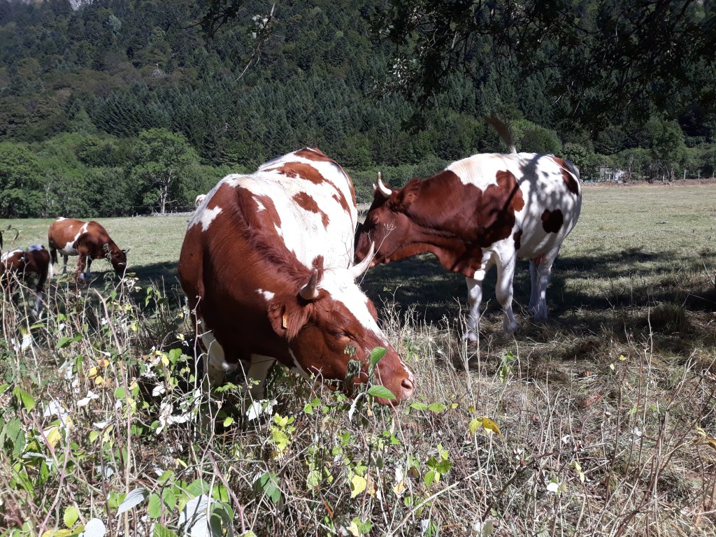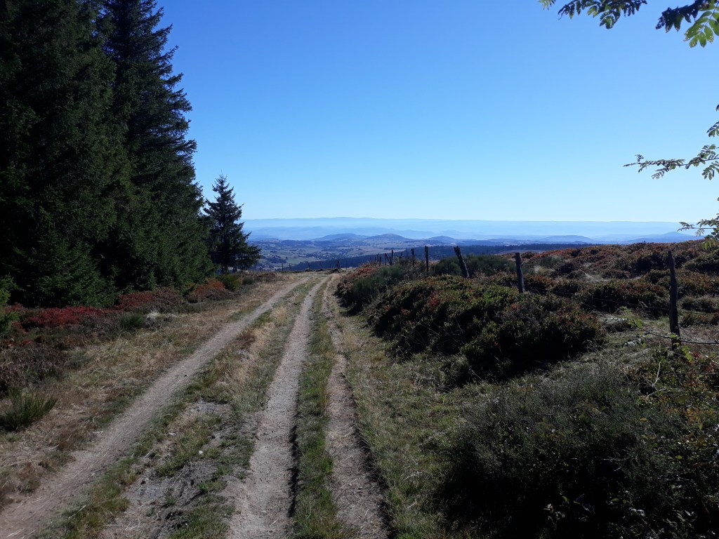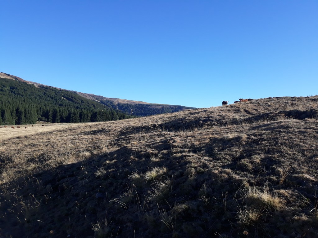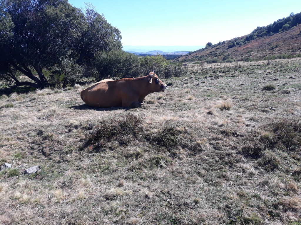 Je fais ma photo, redescends et recroise les jeunes filles arrêtées sur le bord du chemin. « Vous vous êtes trompé de chemin ? » se moquent-elles en s’adressant à moi. « Non, je suis allé faire un selfi et chercher de l’eau, et vous, vous êtes perdues ? » et là je me rends compte qu’il manque une des filles qui était dans le buisson en train de faire ses besoins… « Bonne randonnée ! » m’exclamais-je les dispensant ainsi de me répondre. Je repris mon chemin rapidement afin de ne pas mettre plus mal à l’aise la fille du buisson. Plus loin, elles me rattrapent alors que je m’arrête à nouveau pour poser mon sweat. Je les laisse prendre de l’avance, picore quelques mûres, admire le paysage et profite du dénivelé moins agressif que celui d’hier. Je passe près du Puy du Baladou, puis le Puy de la Védrine où là encore je traverse les estives à proximité des vaches.