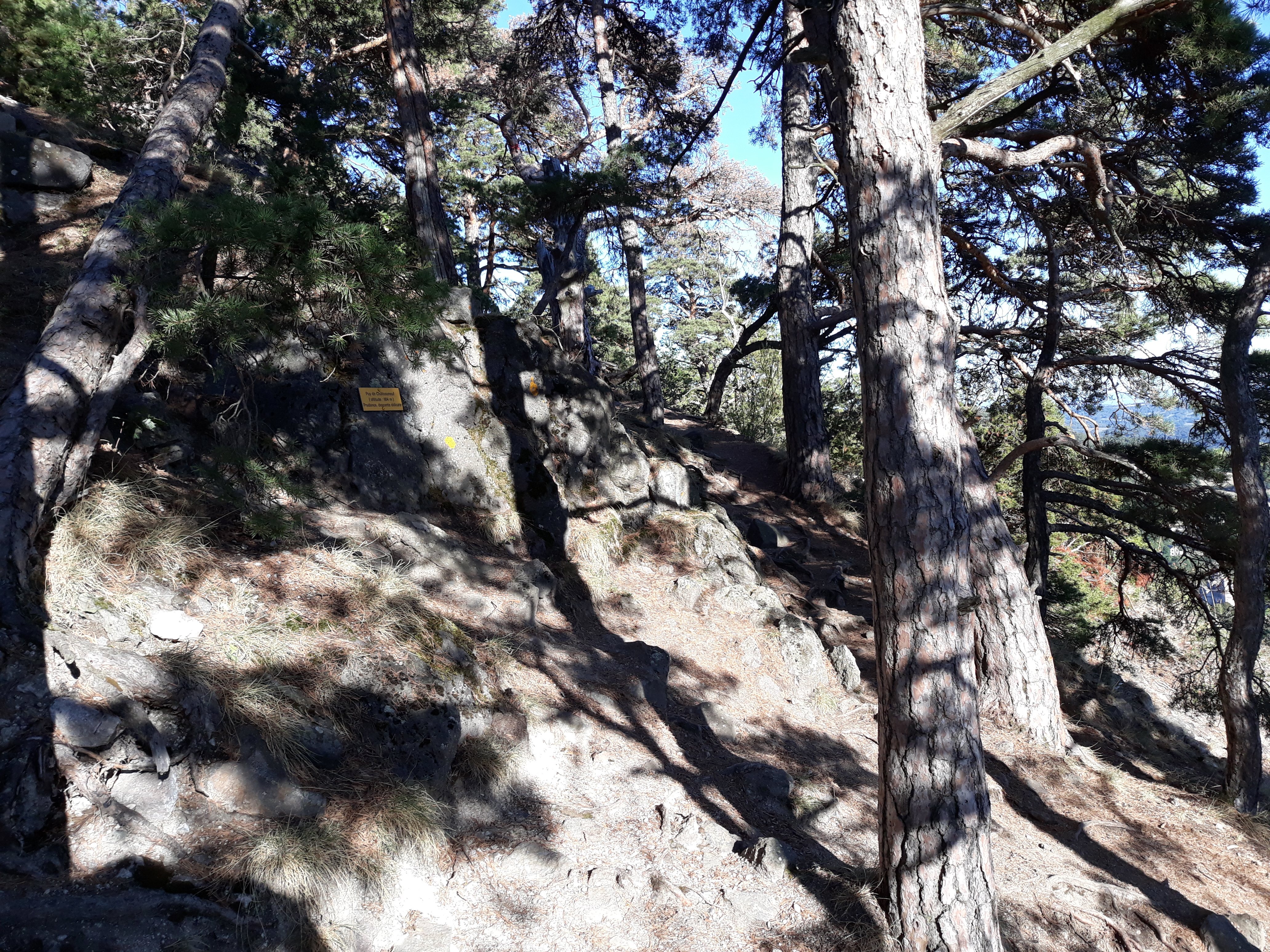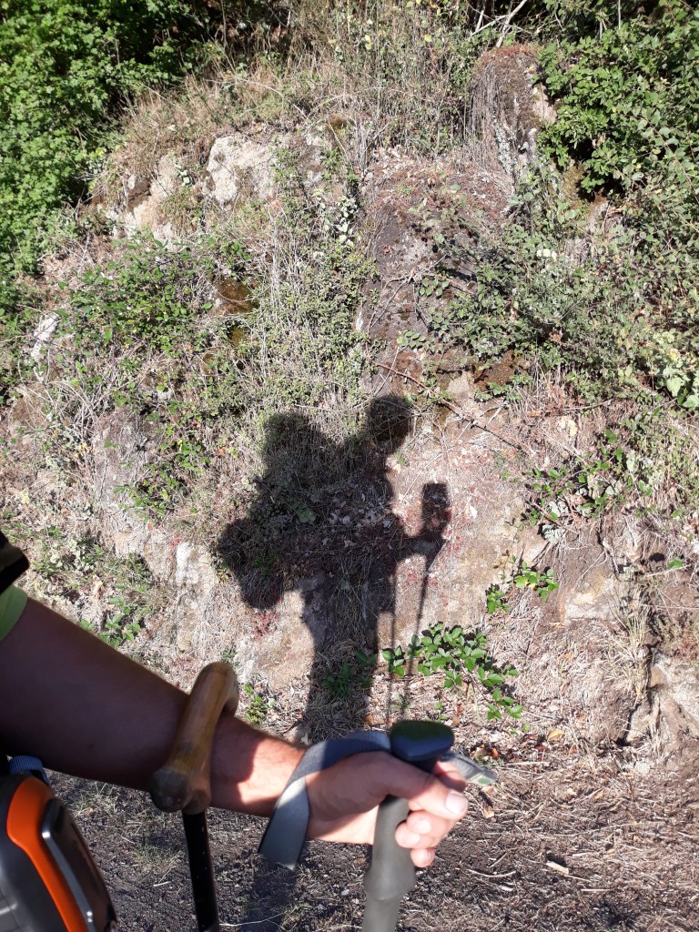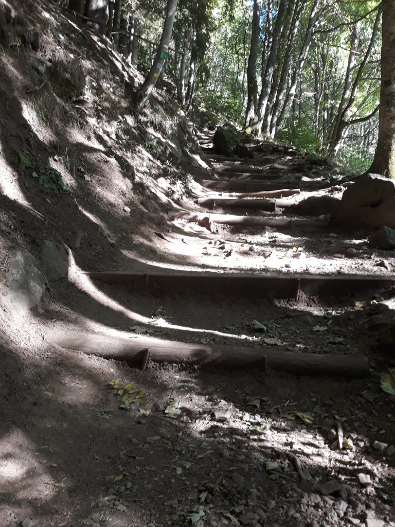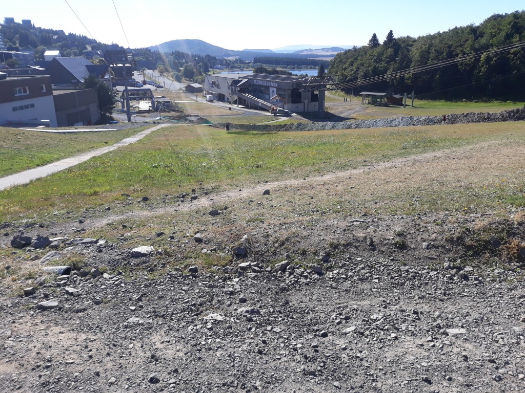 La descente est large, gravillonneuse, glissante. Là encore je remercie Jean-François pour le conseil des bâtons, qui soulagent grandement les articulations, surtout les chevilles et les genoux, à chaque pas. La Dore (qui deviendra la Dordogne au Mont-Dore) est à sec. Je ne prends pas le temps de faire le crochet par les nombreuses cascades (Dore, Serpent…) qui sont probablement à sec aussi. Je continue ma descente jusqu’à la station pour m’offrir une bonne bière et remplir les gourdes. Je rejoins le Mont Dore par les chemins qui sont des pistes de ski de fond l’hiver : le chemin des artistes, le chemin des montagnes, le chemin des médecins… Je rentre dans la ville, passe devant le funiculaire du Capucin. En effet je n’aurais pas eu le temps en passant par le Sancy. Il est déjà tard et je dois encore trouver un endroit pour bivouaquer. En ville c’est impossible. Je poursuis donc le GR4E en passant derrière l’établissement thermal, emprunte les escaliers dont l’irrégularité coupe un peu le souffle. Je croise un homme d’un certain âge qui m’interpelle voyant mon équipement, m’assurant que dans sa jeunesse il avait fait le même parcours. Je l’en félicite d’autant plus qu’à son époque le matériel était certainement beaucoup moins confortable que le mien, plus lourd, plus encombrant aussi.