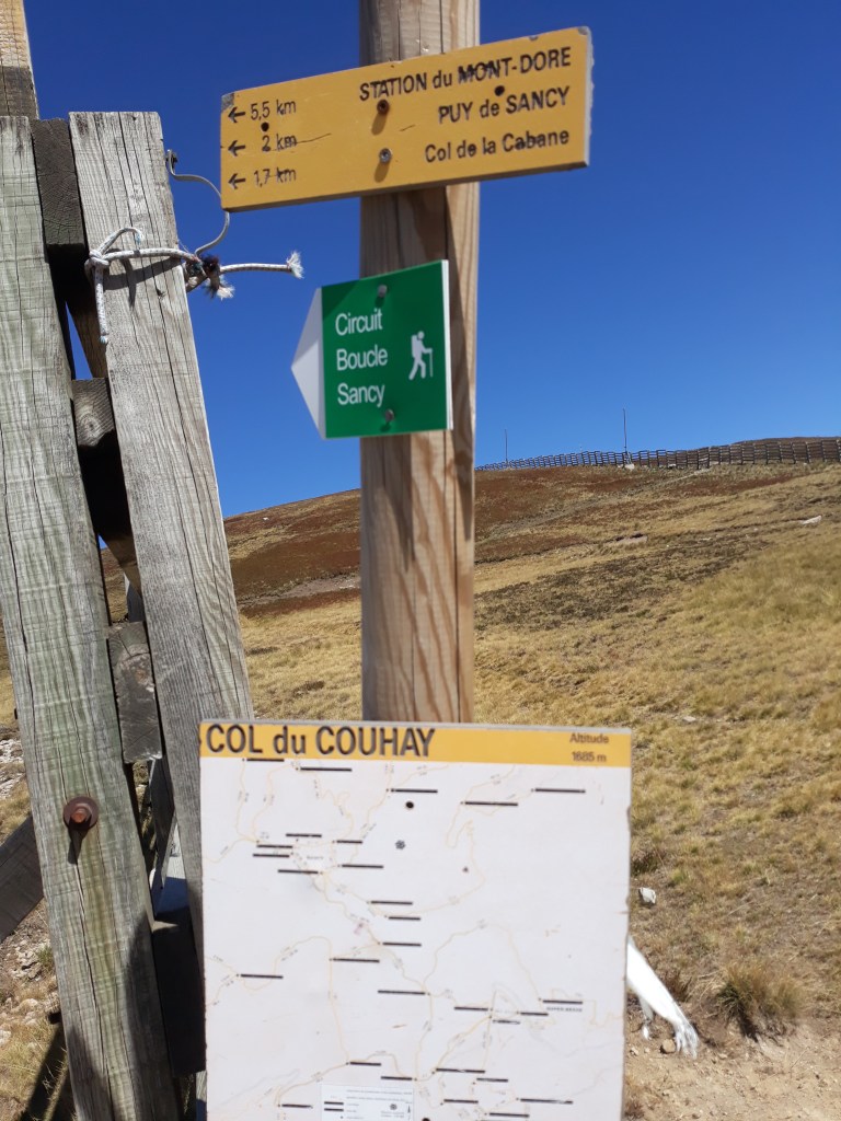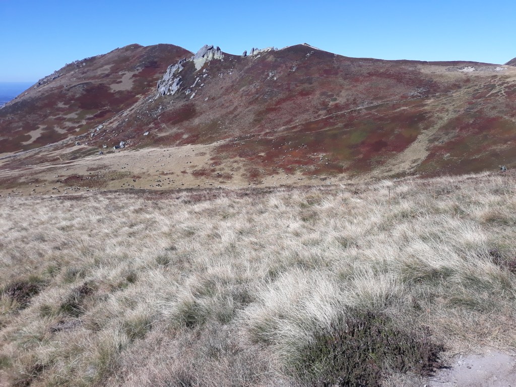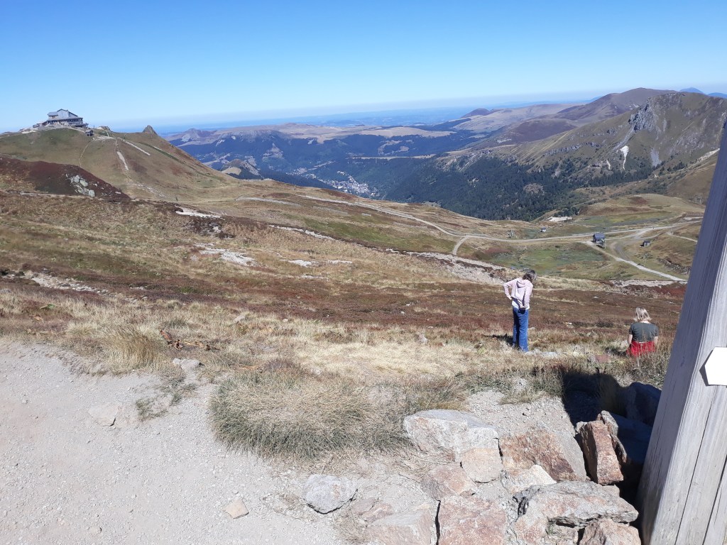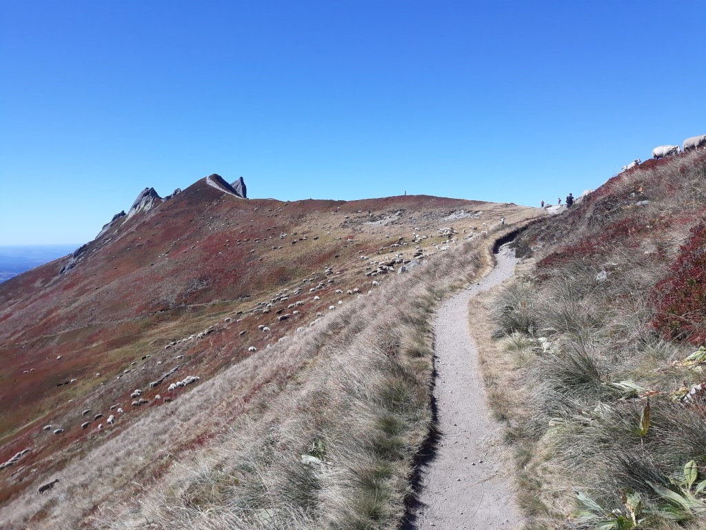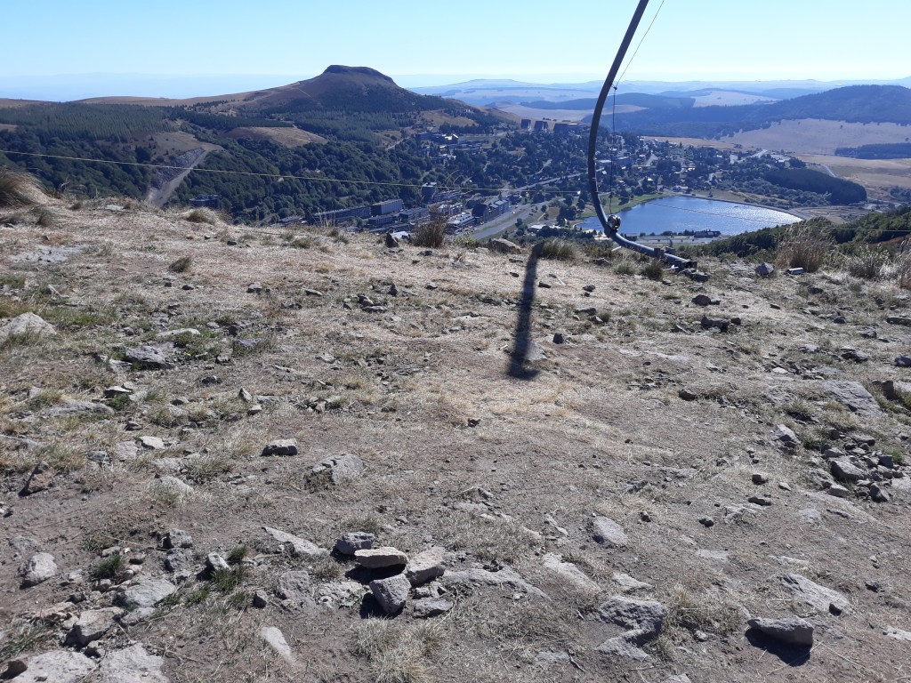 La montée se faisait dans les prairies, au milieu des vaches, la descente vers la route de Super-Besse aussi. Des Salers cette fois-ci, impressionnantes avec leurs cornes, mais je ne les intéressais pas. Il commence à faire chaud et je décide de m’arrêter à Super-Besse prendre un double café, re-remplir les gourdes parce que la prochaine étape va être longue avec l’ascension du Sancy et aucun point d’eau avant le Mont Dore. Et c’est parti pour la montée, longue, difficile, glissante avec le gravier qui roule sous les chaussures. C’est à ce moment-là que j’ai béni mon ami Jean-François de m’avoir conseillé de m’équiper de bâtons de randonnée, sans cette aide, je ne sais pas comment j’aurais pu gravir cette montagne. La montée est interminable, pas un randonneur en vue jusqu’à la jonction avec la GR30 au Col du Couhay. Là deux options s’offrent à moi, poursuivre par le Puy de la Perdrix puis le Puy Ferrand, ou poursuivre le GR30-GR4 jusqu’au Col de la Cabanne. Vu le monde sur la crête et que j’avais prévu au départ de suivre le GR30, je choisi de continuer avec l’idée de départ. Mais c’est quand même vertigineux… Il est midi passé, la faim m’impose un arrêt à flanc de montagne à hauteur du téléski du Puy Ferrand. Ça fait du bien ! Le déjeuner se fait avec vue sur les monts du Cantal et j’assiste à un exercice de deux Rafales qui se pourchassent entre les montagnes. Habituellement on les voit du dessous, avec l’altitude, on aperçoit les pilotes. Ici ce ne sont pas les vaches mais les moutons par centaines qui partagent ce vaste terrain de jeu.