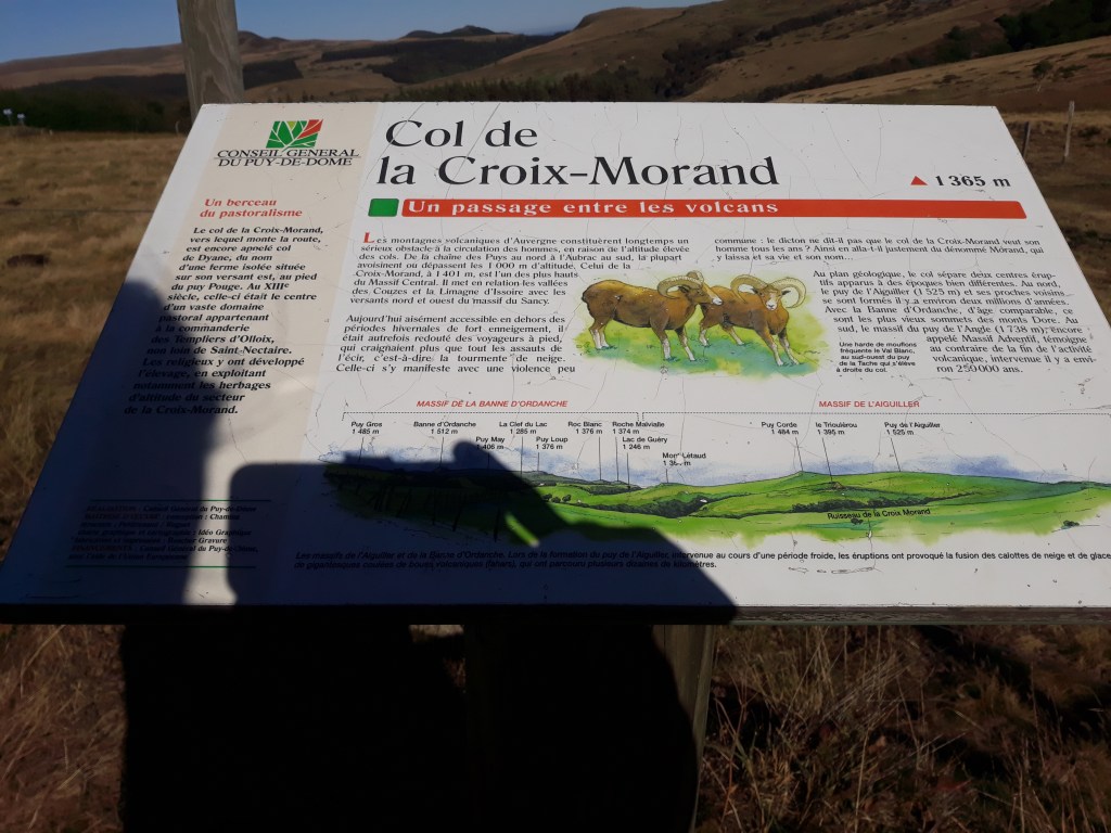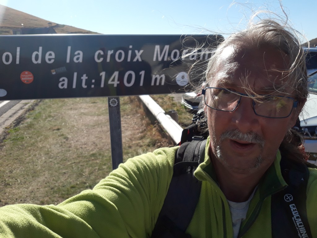 Je n’ai plus beaucoup d’eau et le prochain village, Pessade, est assez loin. Tant pi je prends quand même un café, essentiel à la mise en route matinale. Le café à peine englouti, mon voisin hirsute descend m’assurant avoir passé une bonne nuit près de la cascade du Queureuilh. Son périple est encore long à lui aussi, nous nous encourageons mutuellement. Je démonte la tente et démarre ma journée avec pour premier objectif : trouver de l’eau. Il fait encore frais, je prends la pause pour un selfi près de la cascade et entame la montée qui devrait durer jusqu’à la Croix Morand. Il y a une auberge en haut du Col, j’y trouverais peut-être de l’eau. Je passe donc la cascade sans prendre le risque de me mouiller, passe devant un lieu qui aurait été bien plus agréable pour camper cette nuit près de la cascade du Rossignolet… et ça monte. Ça monte tellement que rapidement, j’ai chaud. Je fais une pause près de la ferme de la Tache pour poser le pantalon et enfiler un bermuda. La suite de la montée est peu agréable, une forêt de pins alignés au cordeau, tellement serrés que la lumière a du mal à passer malgré qu’il n’y a pas un nuage. Et en plus, les nombreux randonneurs qui empruntent ce parcours, pour y faire leurs besoins. Du coup, le sol est jonché d’une multitude de morceaux de papier hygiénique. Pour ma part, j’ai accroché à mon sac une petite pelle de jardinage pour enfants qui me sert à enterrer la grosse commission et laisser la nature aussi propre que possible. Et j’ai toujours un petit sac poubelle dans mon sac au cas où. J’arrive enfin près du Col de la Croix Morand. Le vent m’oblige à remettre le sweat-shirt que j’avais posé plus tôt. Normalement, je dois tourner à gauche pour rejoindre Pessade, mais je décide de faire un détour pour faire un selfi, ce n’est pas tous les jours qu’on peut accéder à ce Col à pied, mais surtout pour faire le plein d’eau car je suis à sec. Je croise à nouveau trois jeunes filles, mais je ne sais pas si ce sont celles que j’avais croisé l’avant-veille à Besse et au lac Pavin. J’arrive à l’auberge du Col, fermée pour travaux. Ça commence à m’inquiéter, Pessade est loin.
