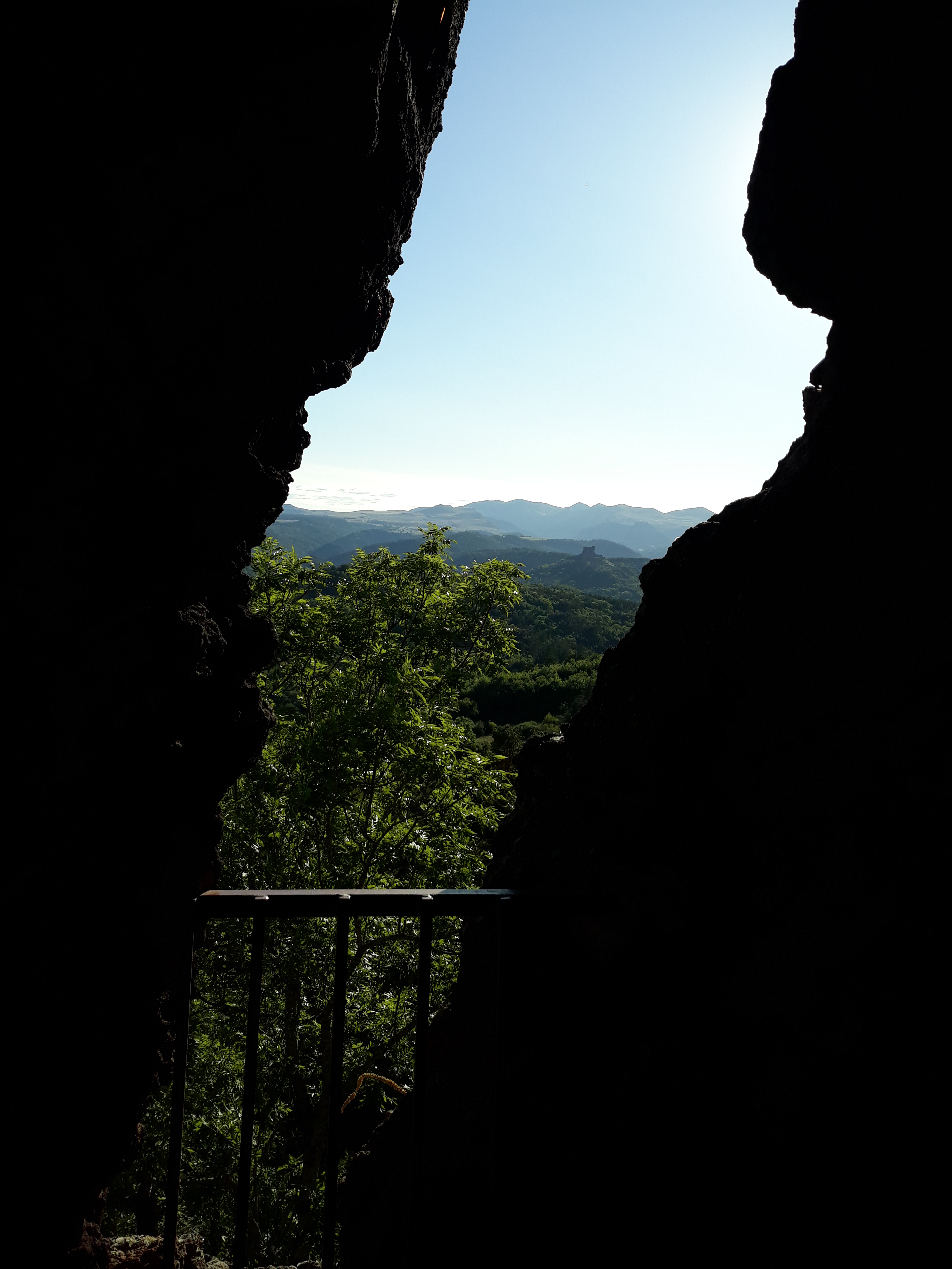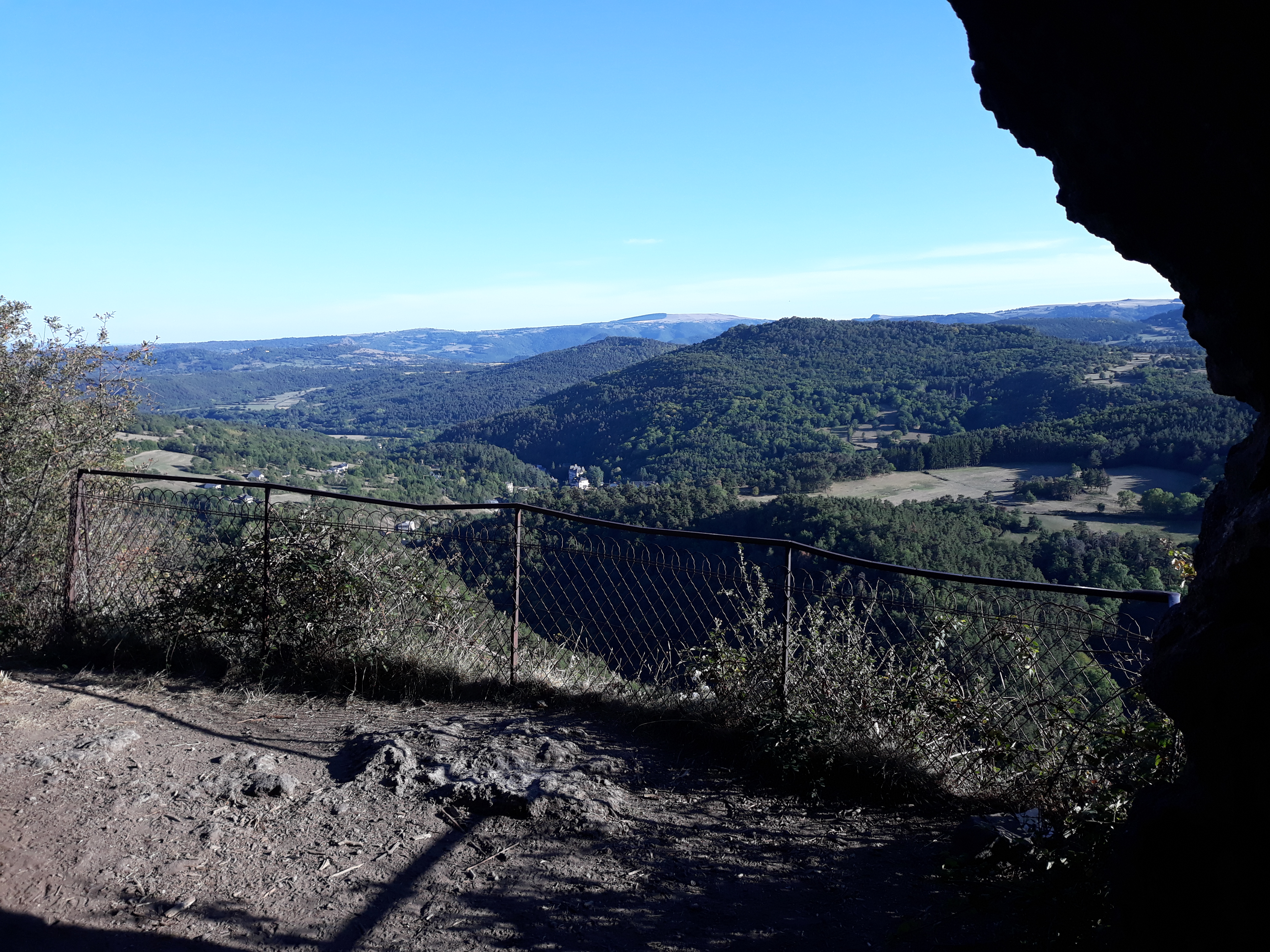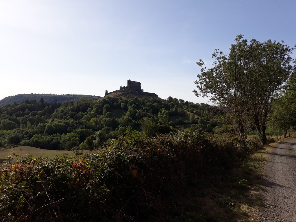 Rapidement je croise un randonneur équipé d’une carte et cherchant ses repères. – « Bonjour, c’est bien par ici le GR30 ? » me demande le retraité. – « Oui c’est bien ça, c’est là que je vais aussi » lui répondis-je en lui montrant les signes qui confirment mon affirmation. – « Ha oui c’est bien ce que je pensais, je démarre tout juste ma journée, je m’étais éloigné du GR pour rejoindre une chambre d’hôtes où j’ai passé la nuit, du coup je n’étais plus très sûr » explique le marcheur. Nous marchons un peu ensemble mais quand la pente se renforce, je me rends compte que l’homme assure un rythme bien supérieur au mien. Il s’arrête pour ranger son gilet, je prends de l’avance mais rapidement il me rattrape. Nous échangeons sur nos parcours, lui fait le GR30 en entier soit près de 200 km. Il est parti de La Bourboule, il n’est pas à la moitié de son parcours. Il a réservé un hébergement dans un gîte pour ce soir, il ne doit pas trainer. Il m’explique qu’il a fait le chemin de Saint Jacques de Compostelle avec un ami. Ce doit être de la rigolade pour lui ce parcours d’à peine 200 km… Je fais une pause pour boire un coup et reprendre mon souffle, je ne le reverrai pas par la suite. Sur le trajet, j’aperçois sur les hauteurs les grottes de Châteauneuf passées hier soir. Puis au détour d’un chemin, le château de Murol. La fin du périple.