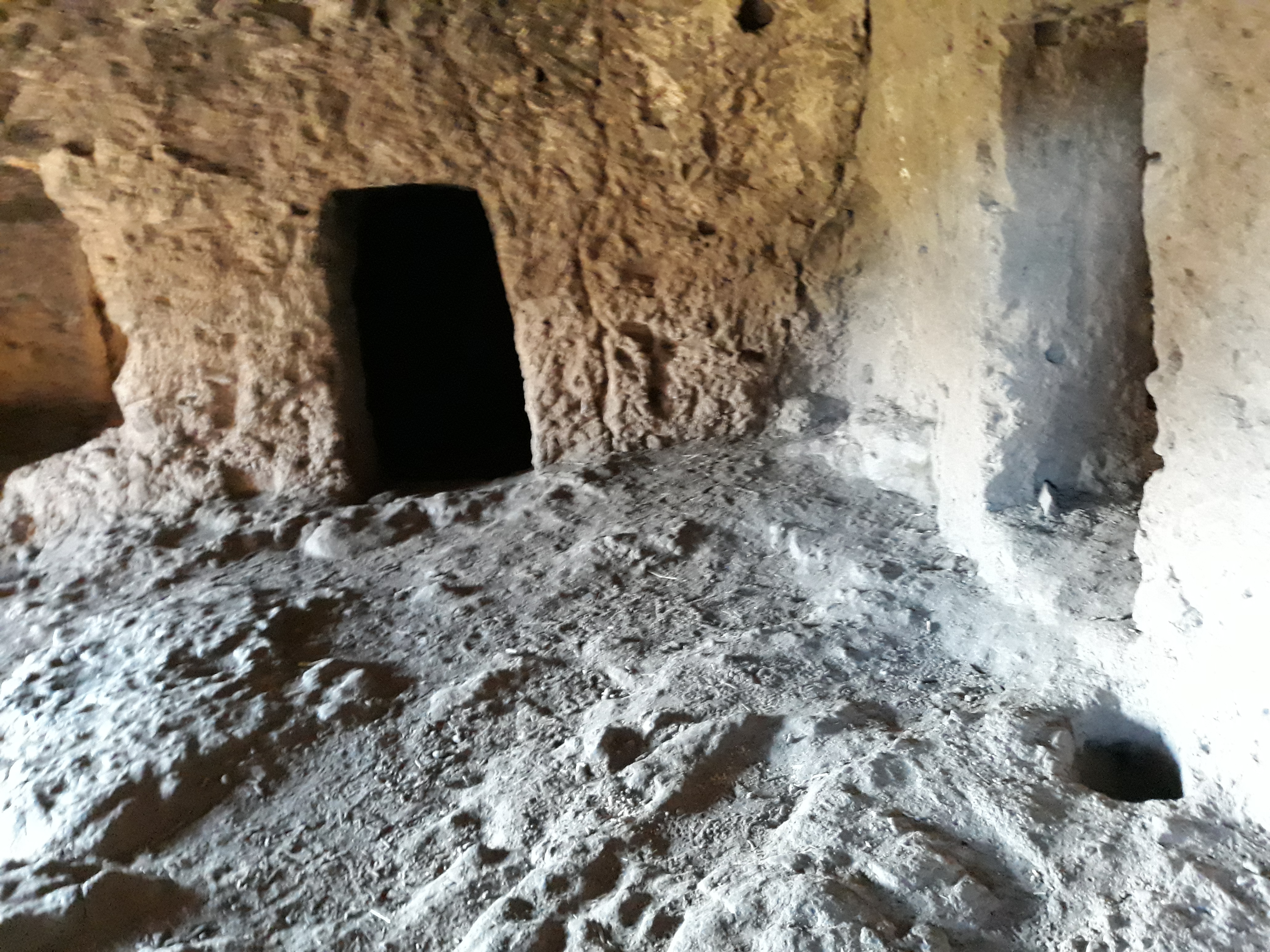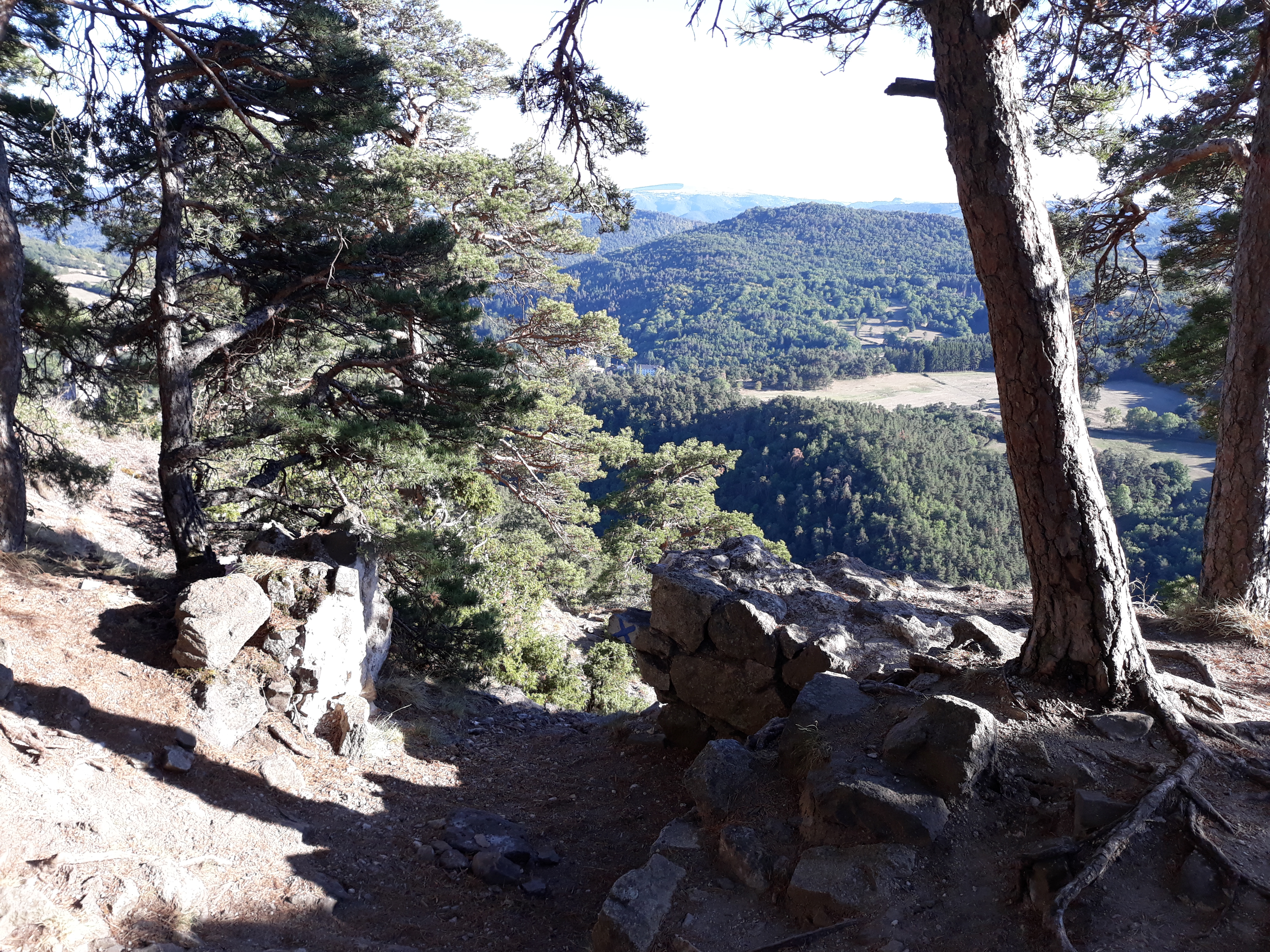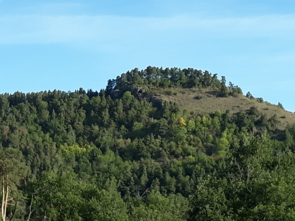 Rapidement je croise un randonneur équipé d’une carte et cherchant ses repères. – « Bonjour, c’est bien par ici le GR30 ? » me demande le retraité. – « Oui c’est bien ça, c’est là que je vais aussi » lui répondis-je en lui montrant les signes qui confirment mon affirmation. – « Ha oui c’est bien ce que je pensais, je démarre tout juste ma journée, je m’étais éloigné du GR pour rejoindre une chambre d’hôtes où j’ai passé la nuit, du coup je n’étais plus très sûr » explique le marcheur. Nous marchons un peu ensemble mais quand la pente se renforce, je me rends compte que l’homme assure un rythme bien supérieur au mien. Il s’arrête pour ranger son gilet, je prends de l’avance mais rapidement il me rattrape. Nous échangeons sur nos parcours, lui fait le GR30 en entier soit près de 200 km. Il est parti de La Bourboule, il n’est pas à la moitié de son parcours. Il a réservé un hébergement dans un gîte pour ce soir, il ne doit pas trainer. Il m’explique qu’il a fait le chemin de Saint Jacques de Compostelle avec un ami. Ce doit être de la rigolade pour lui ce parcours d’à peine 200 km… Je fais une pause pour boire un coup et reprendre mon souffle, je ne le reverrai pas par la suite. Sur le trajet, j’aperçois sur les hauteurs les grottes de Châteauneuf passées hier soir. Puis au détour d’un chemin, le château de Murol. La fin du périple.