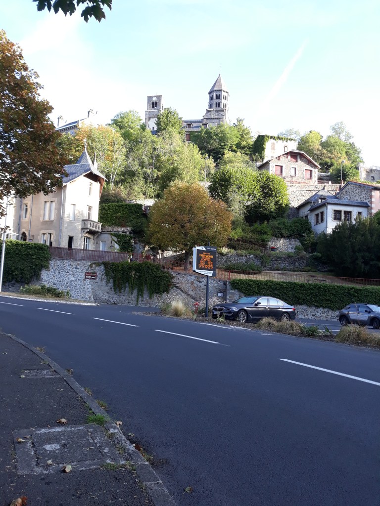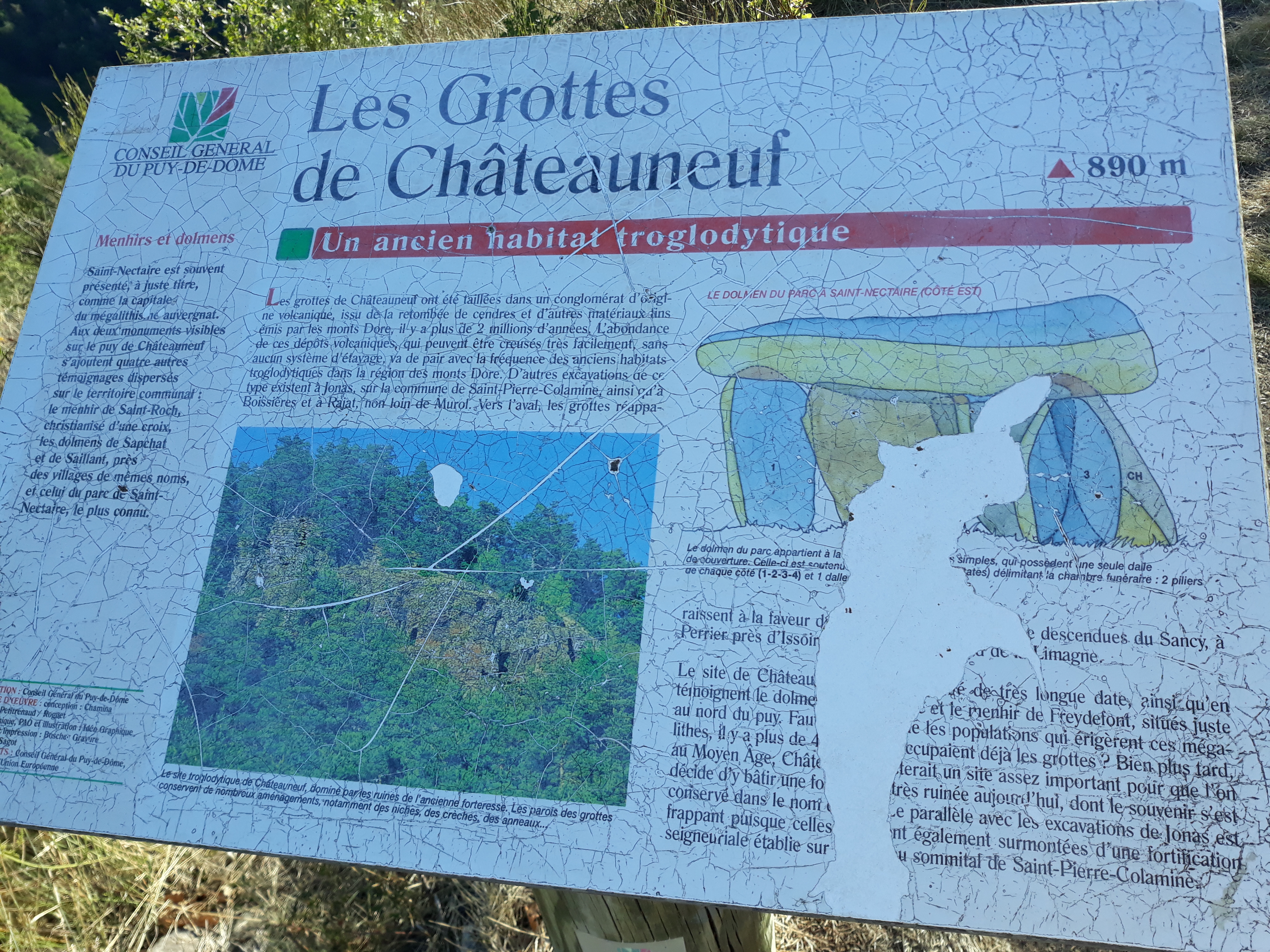 Je commence à voir des panneaux indiquant la proximité de Saint-Nectaire. Je regarde mon GPS, j’ai déjà fait plus de 25 km, je suis fatigué, pas certain d’être très lucide à cause de la déshydratation. Je suis tout près du Dolmen de Pineyre. Si j’avais eu les idées claires, je me serais arrêté ici pour la nuit. Mais tout à coup, je ne me sens pas en sécurité de passer la nuit ici, pris de vertige. Il est encore temps de rejoindre Saint-Nectaire pour aller dans un camping, au moins, si je ne me sens pas bien, je pourrais demander de l’aide. J’allume le téléphone, j’ai du réseau, Google Maps m’indique les campings à proximité. J’appelle, le gérant m’assure qu’il va m’attendre, mais pas trop longtemps. Pour lui c’est la fin de la saison, les journées sont longues et il ne compte pas faire d’heures supplémentaires. Je me dépêche. Mais c’était sans compter sur un dénivelé que je n’avais pas anticipé, celui du Puy de Châteauneuf. Non pas qu’il soit haut avec ces 904 m, mais c’est qu’il y a un dénivelé positif de 10 m sur une distance de 5 m. Bref, un mur. Ce n’est plus de la marche mais de l’escalade. Et arrivé en haut, un petit panneau indiquant « Prudence, descente délicate ». « Délicate ? Non mais t’es sérieux là » ruminais-je en me demandant si ce message est adressé à ceux qui viennent d’en fasse ou pour moi… Et en fait la descente est vraiment délicate, tellement même que je l’ai faite sur les fesses. Dommage de manquer de temps car j’aurais bien fait une pause aux grottes de Châteauneuf. Peut-être même que j’aurai pu y passer la nuit si j’avais été plus lucide. La vue sur Saint Nectaire est à couper le souffle, j’aperçois par moment le château de Murol.