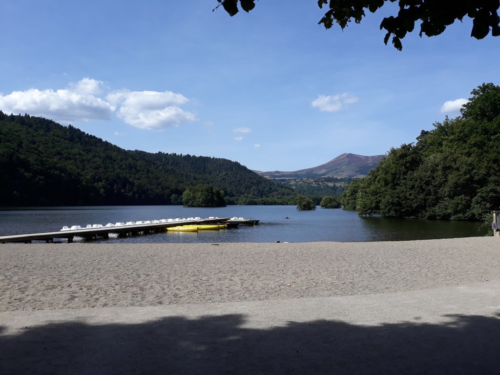 C’est jour de chasse. J’entends des chiens, je croise des guetteurs qui doivent se dire que je marche sur leur terrain de chasse et que je les gênerais pour tirer si besoin. Je poursuis la montée, traverse des fermes et passe devant une ferme qui vend du Saint Nectaire à Chautignat et qui me semble répondre à mon étique d’élevage (ils ne sont pas en bio, mais en tant qu’éleveur bio, je trouve cet élevage différent des autres). La vente n’est ouverte que les après-midis et fermé le dimanche. Je reviendrais tout à l’heure. Et puis c’est l’arrivée au château. J’allume le téléphone pour donner des nouvelles, rassurer la famille, dire que je suis bien arrivé et que je vais bien profiter de la journée. Je m’arrête à Murol au distributeur de la banque, vais prendre mon pain au chocolat pour mon dessert de ce midi (il est trop tard pour le petit déjeuner) mais midi approche. Je m’autorise une bière puis prends la direction du camping de Chambon-du-Lac. Non, je ne prends pas la voiture, je suis encore un marcheur, tant que la tente ne sera pas montée. Arrivée au lac Chambon, je pose les chaussures et me trempe les pieds dans l’eau fraiche du lac. J’ai l’impression d’entendre « pschhhhh » comme quand on met une poêle chaude dans l’eau froide de l’évier. Une randonneuse qui est assise sur le ponton des pédalos et qui elle aussi baigne ses pieds, m’interroge sur mon parcours ayant vu mon sac à dos que j’ai laissé sur un banc. Retraitée, elle et son mari sillonne la France en camping-car pour découvrir à pied, les beaux paysages que nous offrent l’Auvergne. Il est trop tôt pour aller au camping, il n’est pas encore ouvert pour l’accueil des campeurs. Je vais manger sur les tables de pique-nique près de la Couze Chambon qui prolonge le lac. Le lieu est calme à cette heure, à peine dérangé par les arrivées de camping-cars qui attendent eux aussi l’ouverture du camping. J’ai donc tout mon temps pour déjeuner. Enfin l’heure de l’ouverture, je me dirige à l’accueil et choisi mon emplacement. Je paye ma nuitée, réserve deux pains au chocolat pour demain matin et vais mettre fin à mon statut de randonneur.