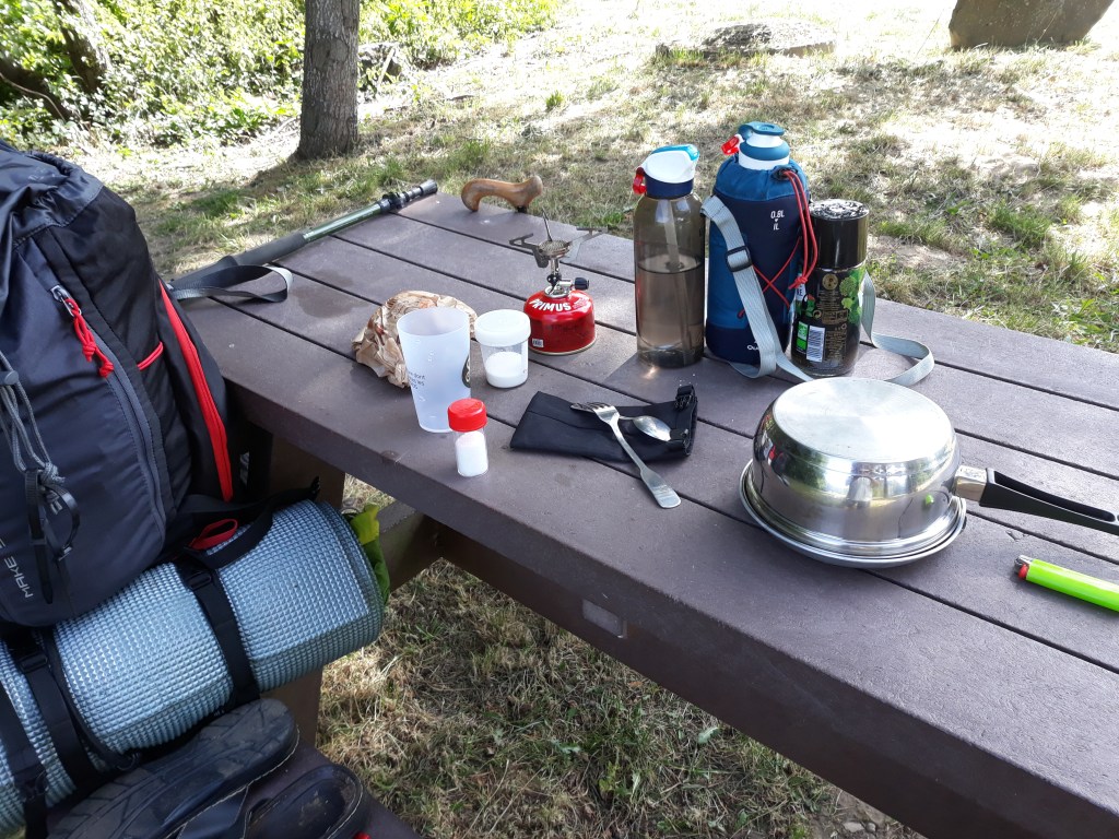 À peine la tente montée, j’aperçois un type un peu hirsute, un sac sur le dos un autre dans les bras, qui monte dans ma direction. Son équipement est dans un bien triste état, les bretelles de ses sacs sont déchirées, les fermetures éclairs ne ferment pas correctement. Lui aussi cherche un endroit pour dormir. C’est un creusois qui se rend à pied à un festival du côté de Vic-Le-Compte où il doit rejoindre des amis qui le redescendront en voiture. Je n’ai pas tout compris et je n’ai trouvé aucune trace du festival dont il m’a parlé. Probablement un festival réservé à quelques initiés dont la notoriété n’a pas besoin des lumières de la presse. Je lui dis que je n’ai pas trouvé d’emplacement plus plat sauf au bord de la cascade, mais que ce serait trop bruyant pour dormir. Il s’y dirige quand même comptant sur le bruit de la chute d’eau pour le bercer. Je ne le reverrai pas avant le lendemain. Un taboulé fera le repas du soir suivi d’une tisane et d’un petit tour pour se dégourdir les jambes avant de dormir.