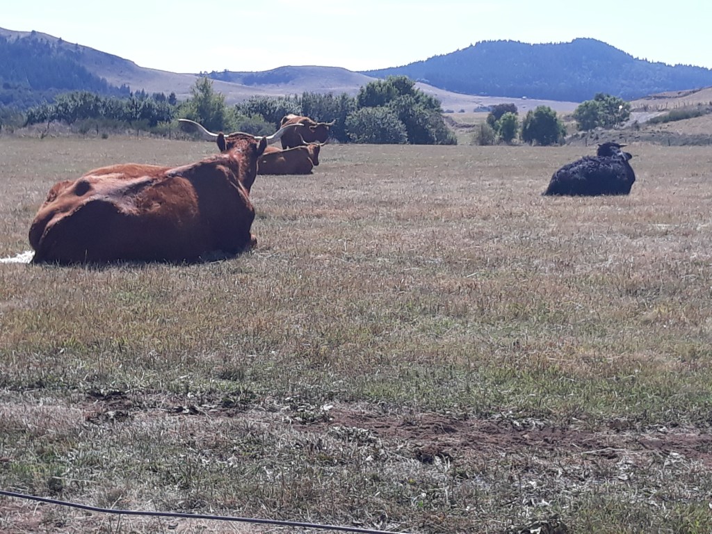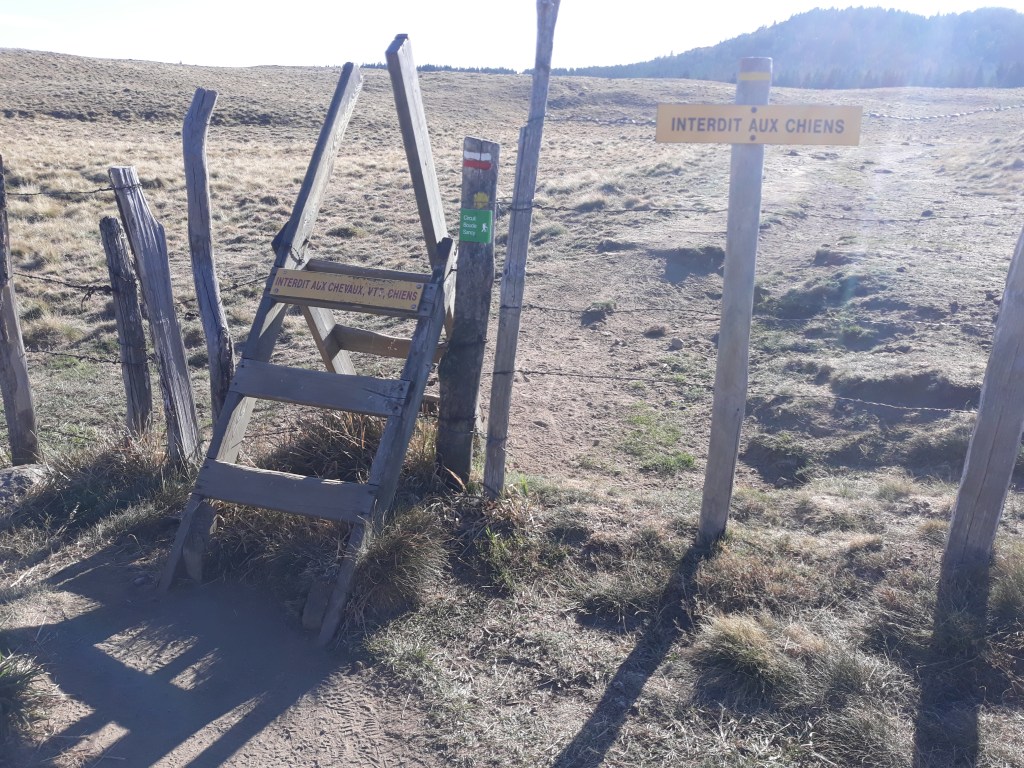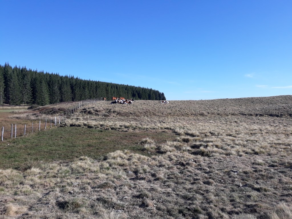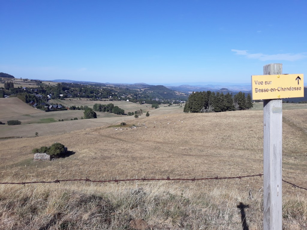 C’est jour de chasse. J’entends des chiens, je croise des guetteurs qui doivent se dire que je marche sur leur terrain de chasse et que je les gênerais pour tirer si besoin. Je poursuis la montée, traverse des fermes et passe devant une ferme qui vend du Saint Nectaire à Chautignat et qui me semble répondre à mon étique d’élevage (ils ne sont pas en bio, mais en tant qu’éleveur bio, je trouve cet élevage différent des autres). La vente n’est ouverte que les après-midis et fermé le dimanche. Je reviendrais tout à l’heure.