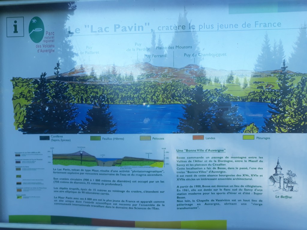 Je m’arrête à Murol au distributeur de la banque, vais prendre mon pain au chocolat pour mon dessert de ce midi (il est trop tard pour le petit déjeuner) mais midi approche. Je m’autorise une bière puis prends la direction du camping de Chambon-du-Lac. Non, je ne prends pas la voiture, je suis encore un marcheur, tant que la tente ne sera pas montée. Arrivée au lac Chambon, je pose les chaussures et me trempe les pieds dans l’eau fraiche du lac. J’ai l’impression d’entendre « pschhhhh » comme quand on met une poêle chaude dans l’eau froide de l’évier. Une randonneuse qui est assise sur le ponton des pédalos et qui elle aussi baigne ses pieds, m’interroge sur mon parcours ayant vu mon sac à dos que j’ai laissé sur un banc. Retraitée, elle et son mari sillonne la France en camping-car pour découvrir à pied, les beaux paysages que nous offrent l’Auvergne.
