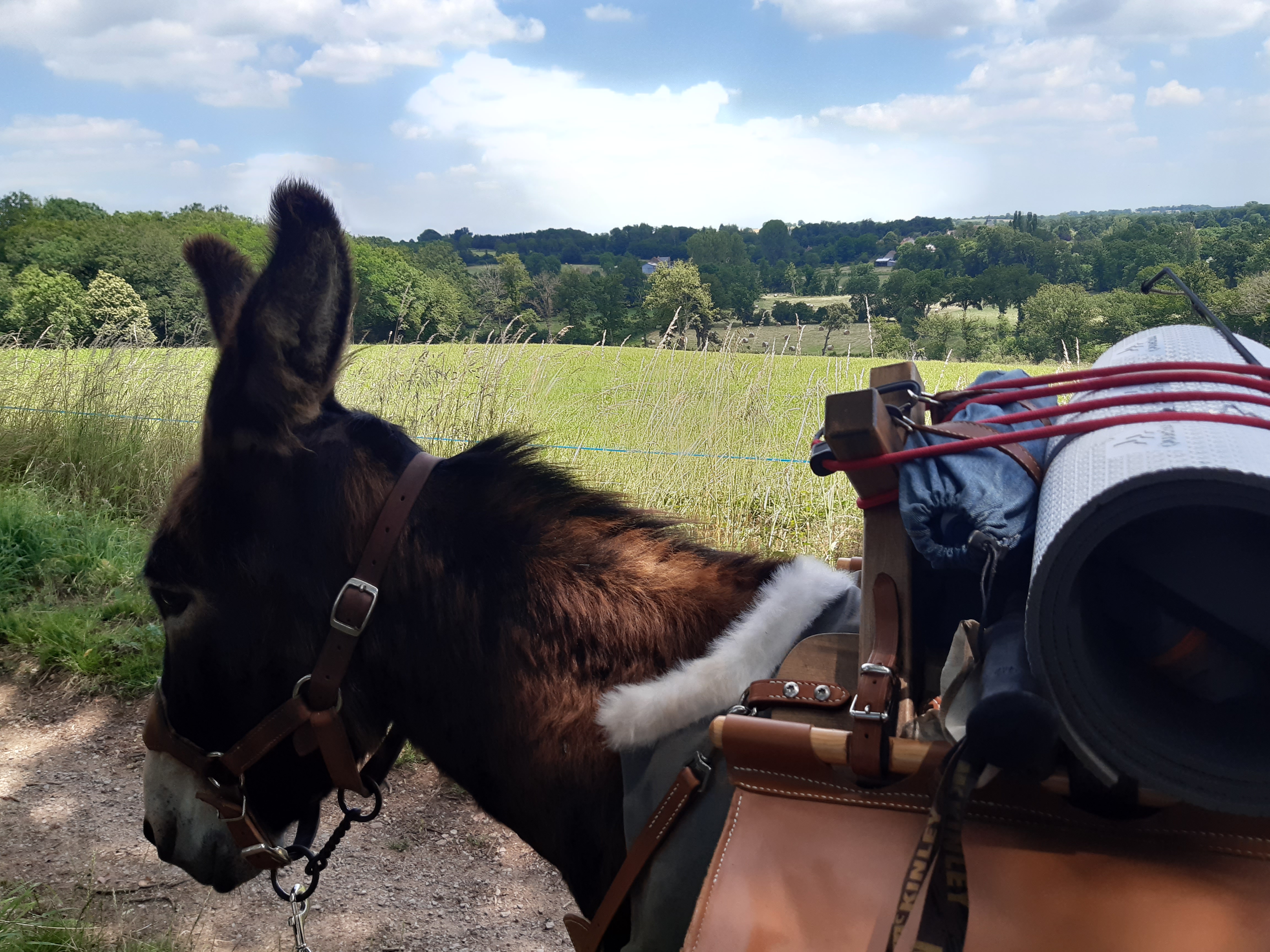 Le lendemain, donc, il faut traverser La Châtre, c’est jour de marché, il y a du monde et de la circulation. On ne ramasse pas beaucoup de déchets en ville parce que parfois, Honoré fait un écart quand je mets les déchets dans le sac plastique, sûrement à cause du bruit. Je ne prends donc pas de risque quand il y a trop de voitures. Honoré se comporte comme un chef et la traversée se déroule sans accroc. On passe par Montgivray, charmant village dont la maire est très jolie. Le chemin est agréable autour d’un magnifique moulin. Cependant la passerelle suivante, Honoré ne la passera pas. On doit faire un détour de 4 km pour rejoindre Christophe et Cathy à Sarzay dans un accueil paysan. Quelle belle surprise ils me font de faire un détour pour nous saluer à l’occasion de leur retour de vacances. On passe une superbe soirée, comme toujours avec eux qui sont toujours souriants et positifs. Ça fait du bien d’avoir des amis comme eux. Du coup la séparation le lendemain est difficile. Ce chemin me secoue les tripes et l’émotion est forte.