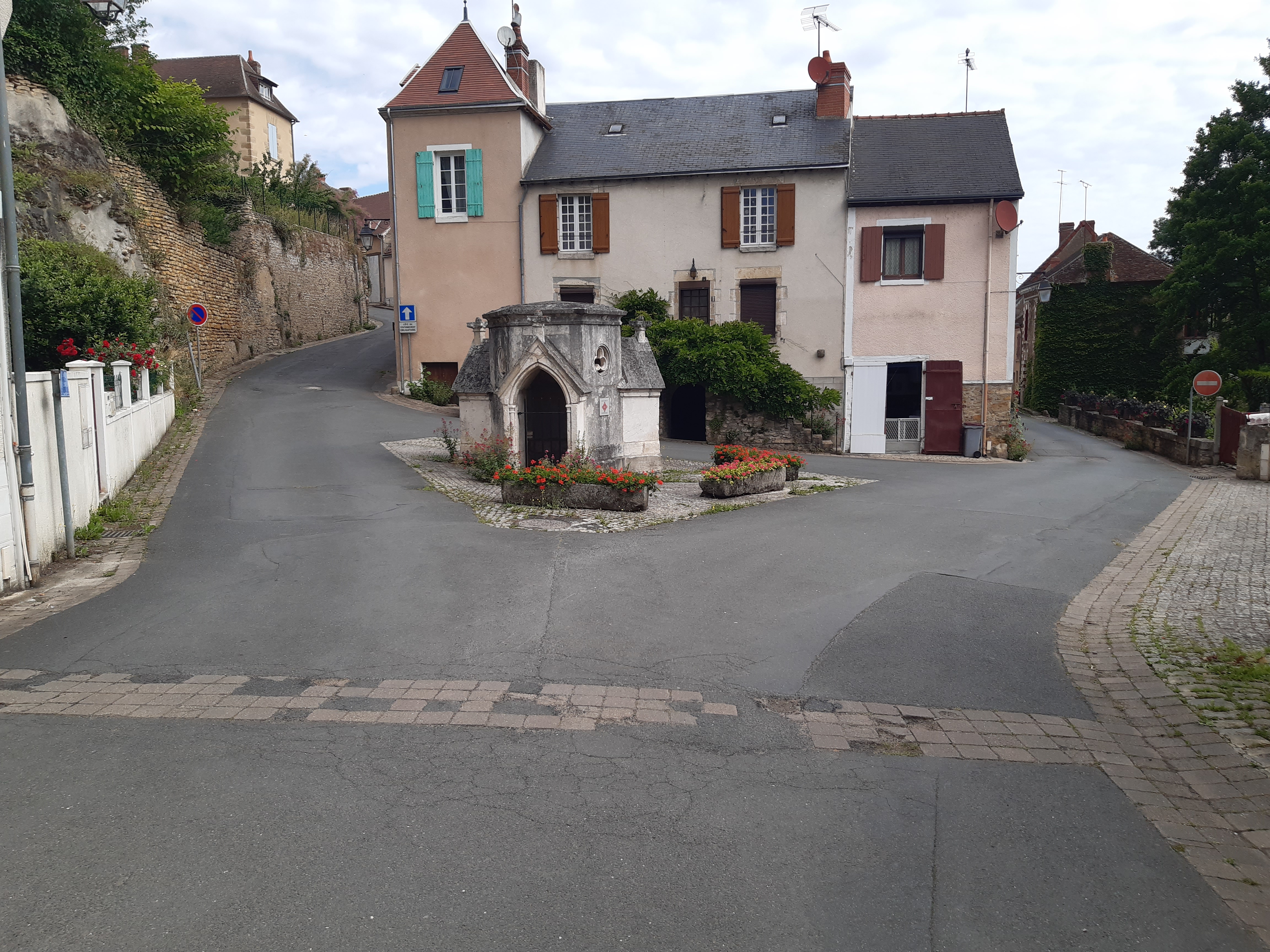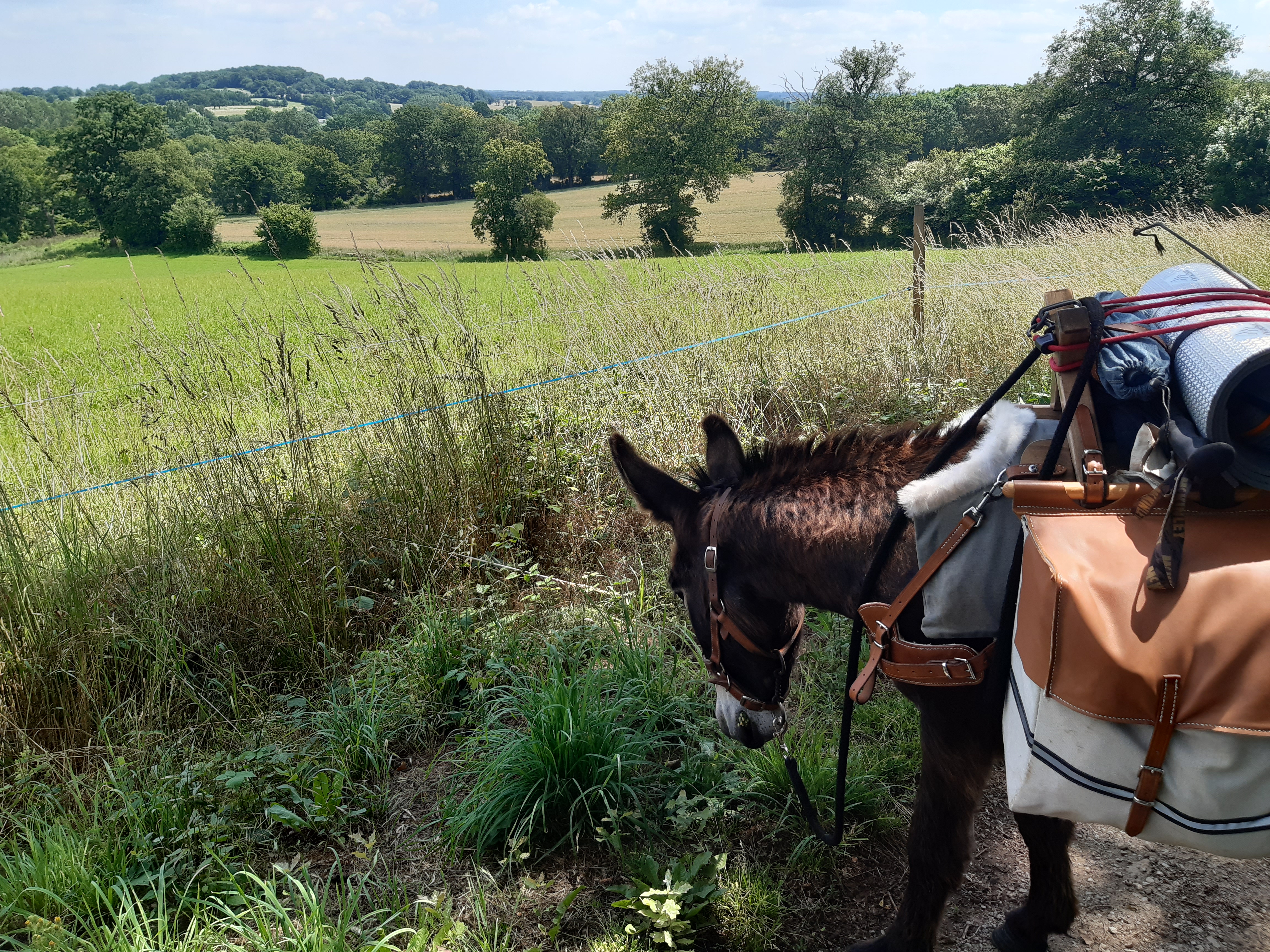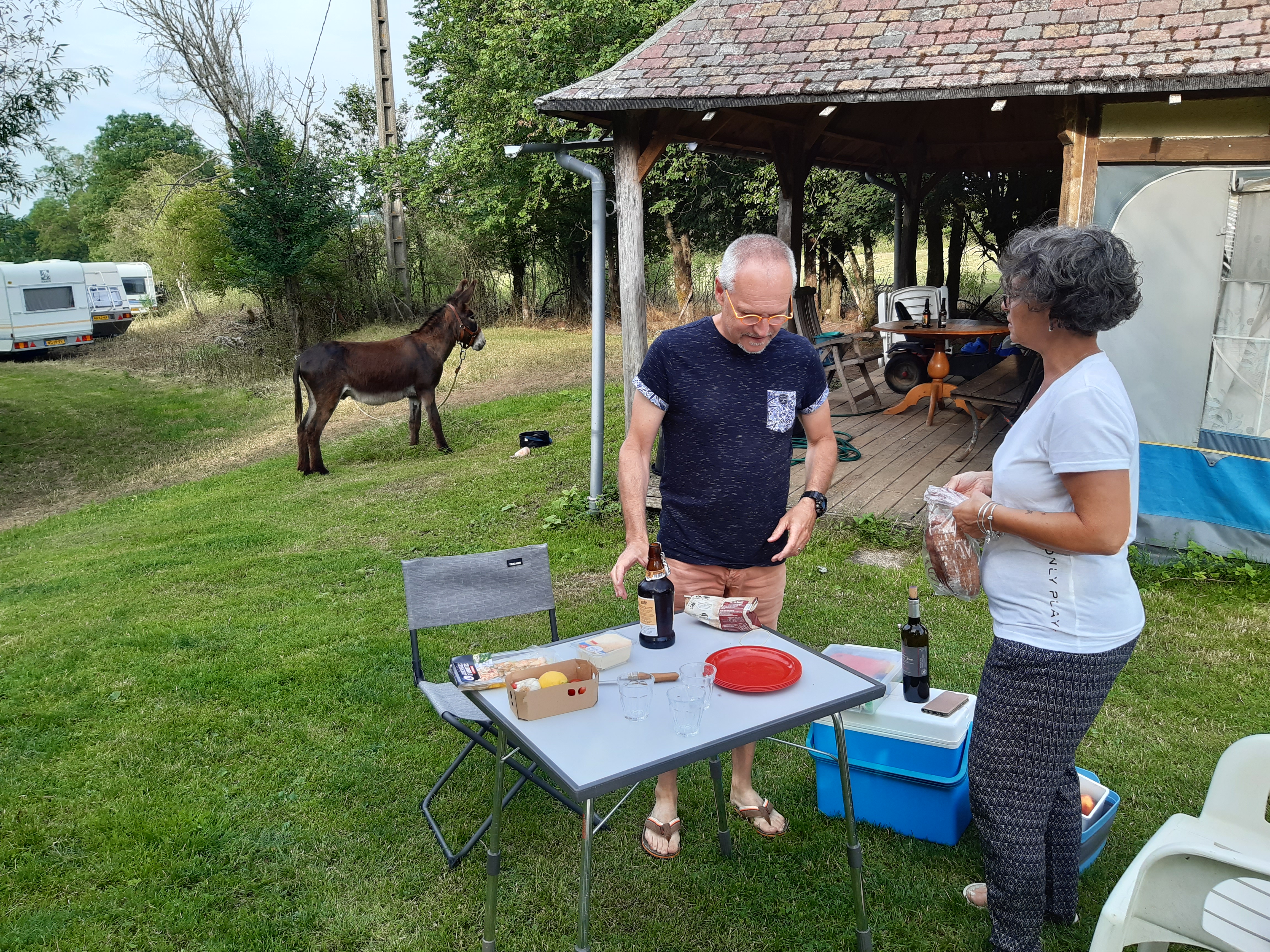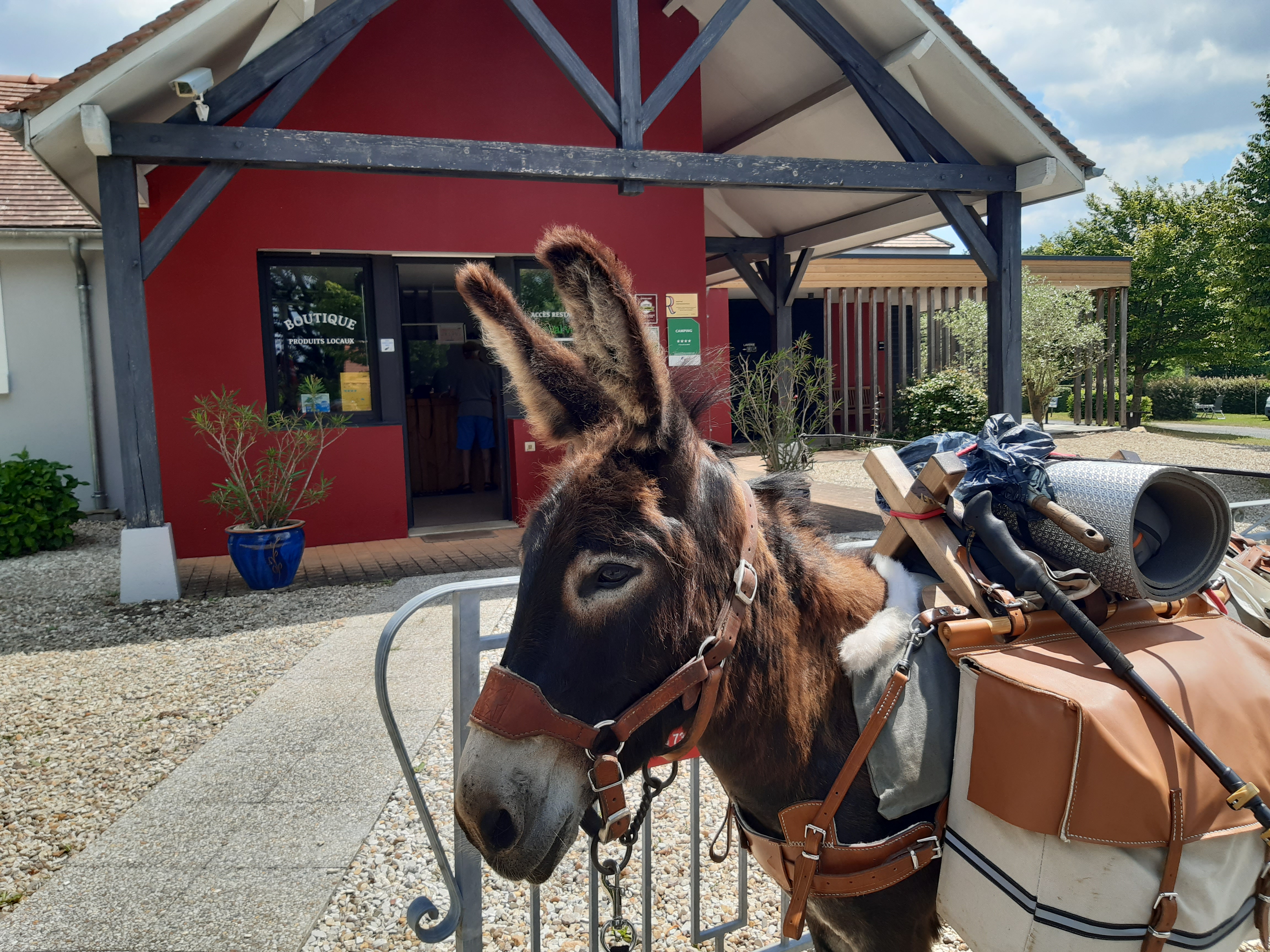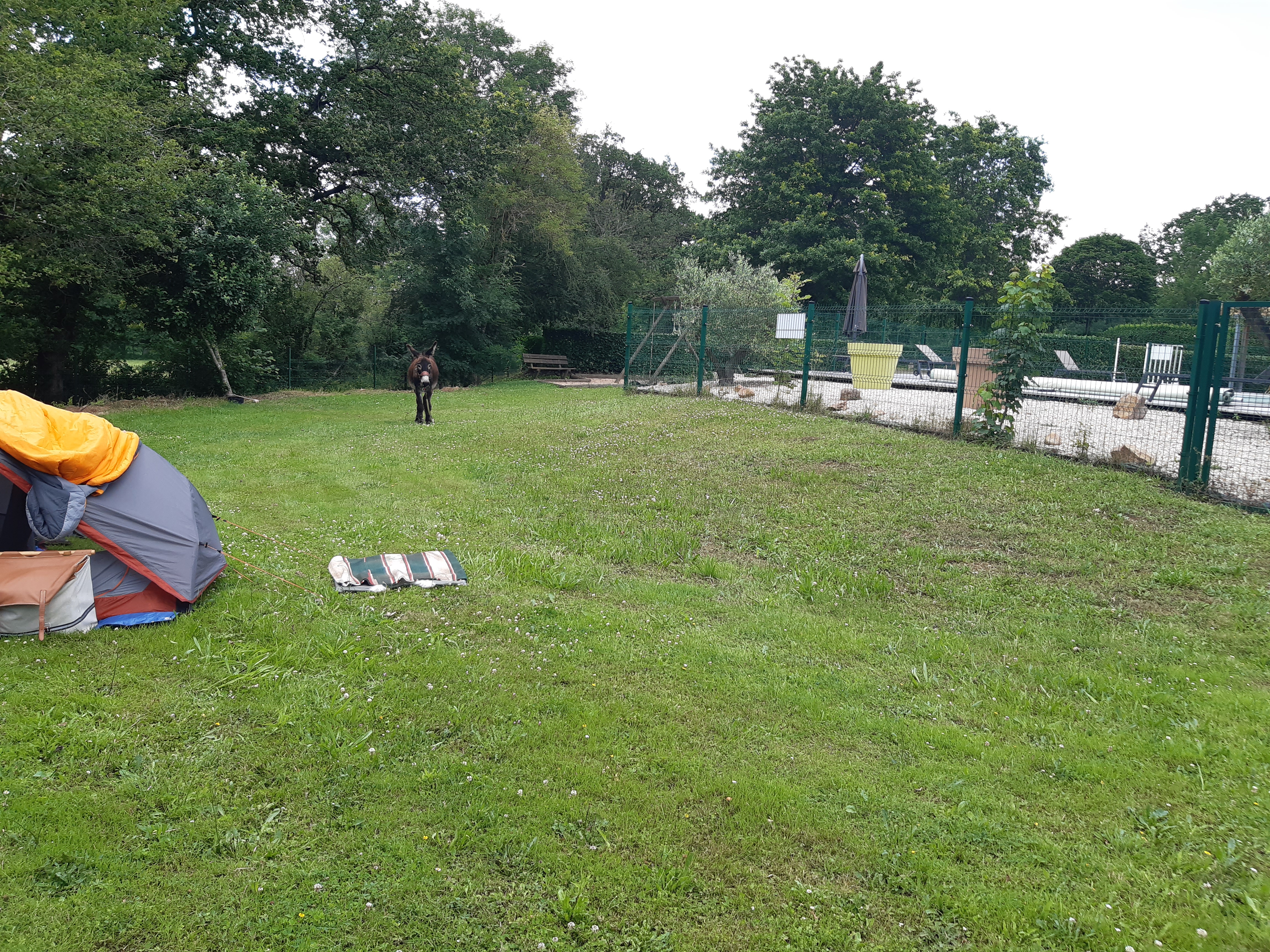La campagne berrichonne est agréable, boisée, vallonnée, verdoyante. Nous sommes maintenant dans l’Indre, troisième département que nous traversons depuis le départ. Honoré me surprend à passer une passerelle pourtant inhabituelle. Il commence à comprendre mes attentes. Par ici, les maisons et les fermes sont assez distantes et je choisi de me rapprocher du camping de La Châtre car le lendemain matin je dois faire le point sur Lyme avec mon médecin en visioconsultation et j’ai besoin d’internet. Ici les zones blanches sont fréquentes. Nous sommes très bien accueillis au camping, bien que mis à l’écart près de la piscine. Le tarif est élevé pour un emplacement qui n’en est pas un, mais le camping est confortable. Et comme le chemin est toujours surprenant, en allant faire ma vaisselle, je tombe sur une connaissance. Le Troyen. Pour ceux qui pratiquent le géocaching, le personnage est connu et le trouver ici est une surprise. Quelle drôle de rencontre alors que je dois retrouver le lendemain Christophe et Cathy, eux aussi géocacheurs, et le surlendemain Jean-François…