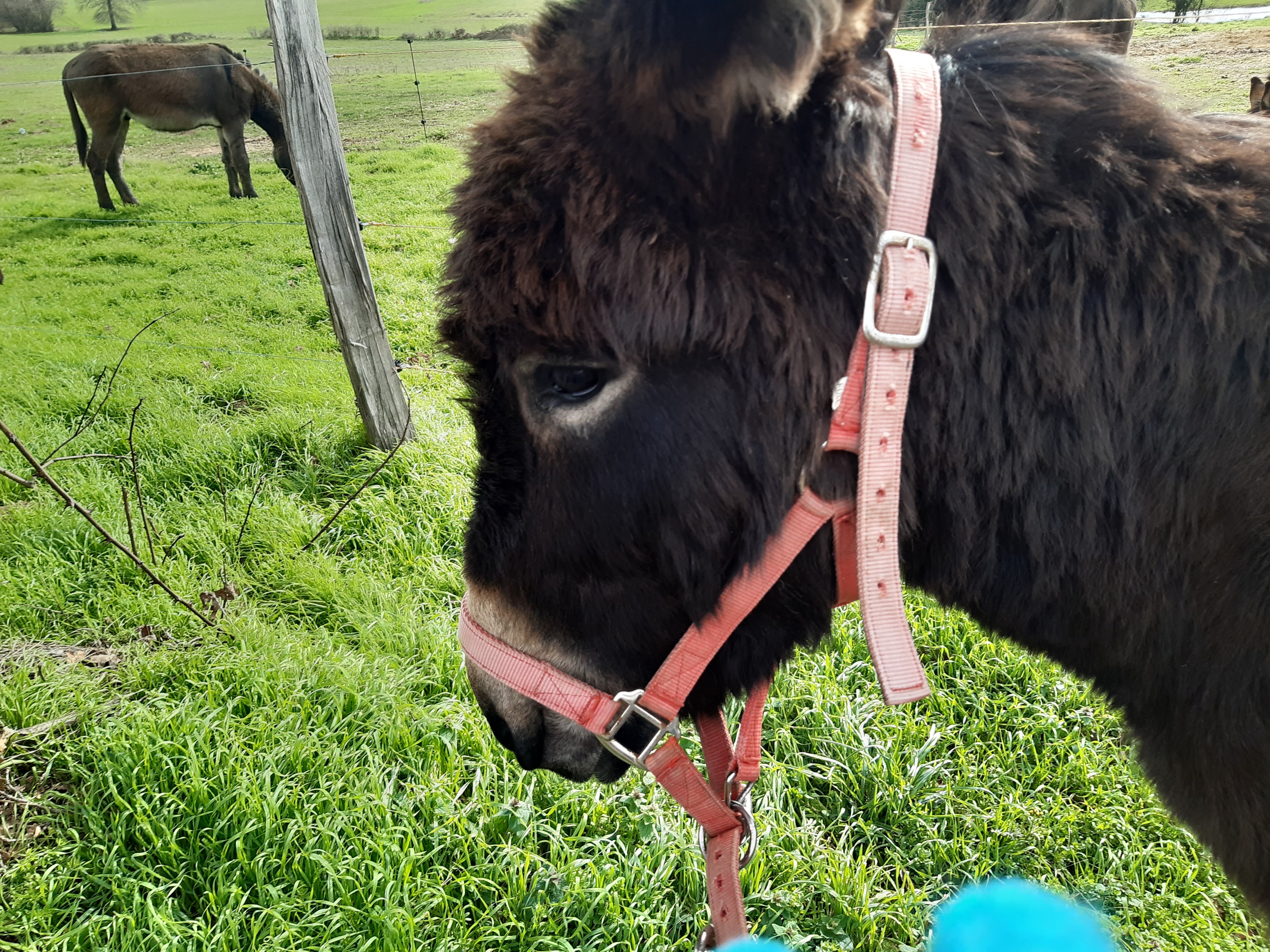 On était tellement bien qu’on n’avait pas envie de partir, mais on a une mission. Nouvel obstacle pour Honoré, traverser la RCEA avec son flot de camions sur un pont. Là il à eu peur à en glisser des 4 pieds sur le pont. Heureusement des ouvriers chargés de travailler à l’agrandissement du pont ont détourné son attention. C’est passé. Ouf. C’est incroyable comme le chemin place les bonnes personnes au bon moment, au bon endroit. Ensuite nous suivons une transhumance de génisses sur quelques mètres. Avant de rencontrer encore des personnes agréables et bienveillantes. Comme ce petit garçon et son papa qui ont fait un bout de chemin avec nous, faisant oublier à Honoré sa phobie des vélos. Toutefois la route était encore longue avant d’enfin trouver un lieu de bivouac. Mais quel lieu ! Un centre équestre avec gite. Annelou et sa maman Véronique nous ont accueillies avec une grande bienveillance et générosité. Et leur regard professionnel rassurant. Merci à elles que j’ai quitté la gorge serrée.