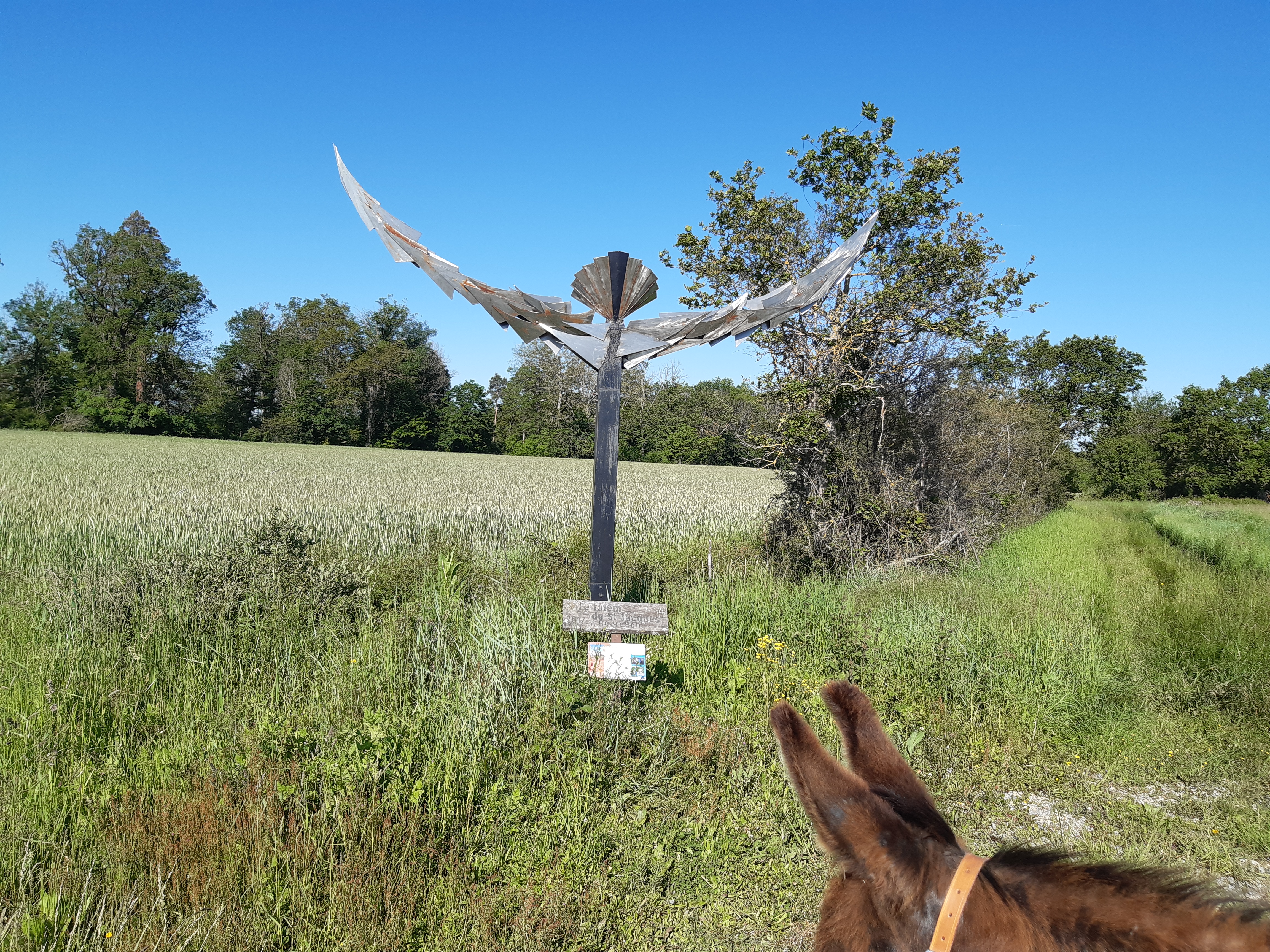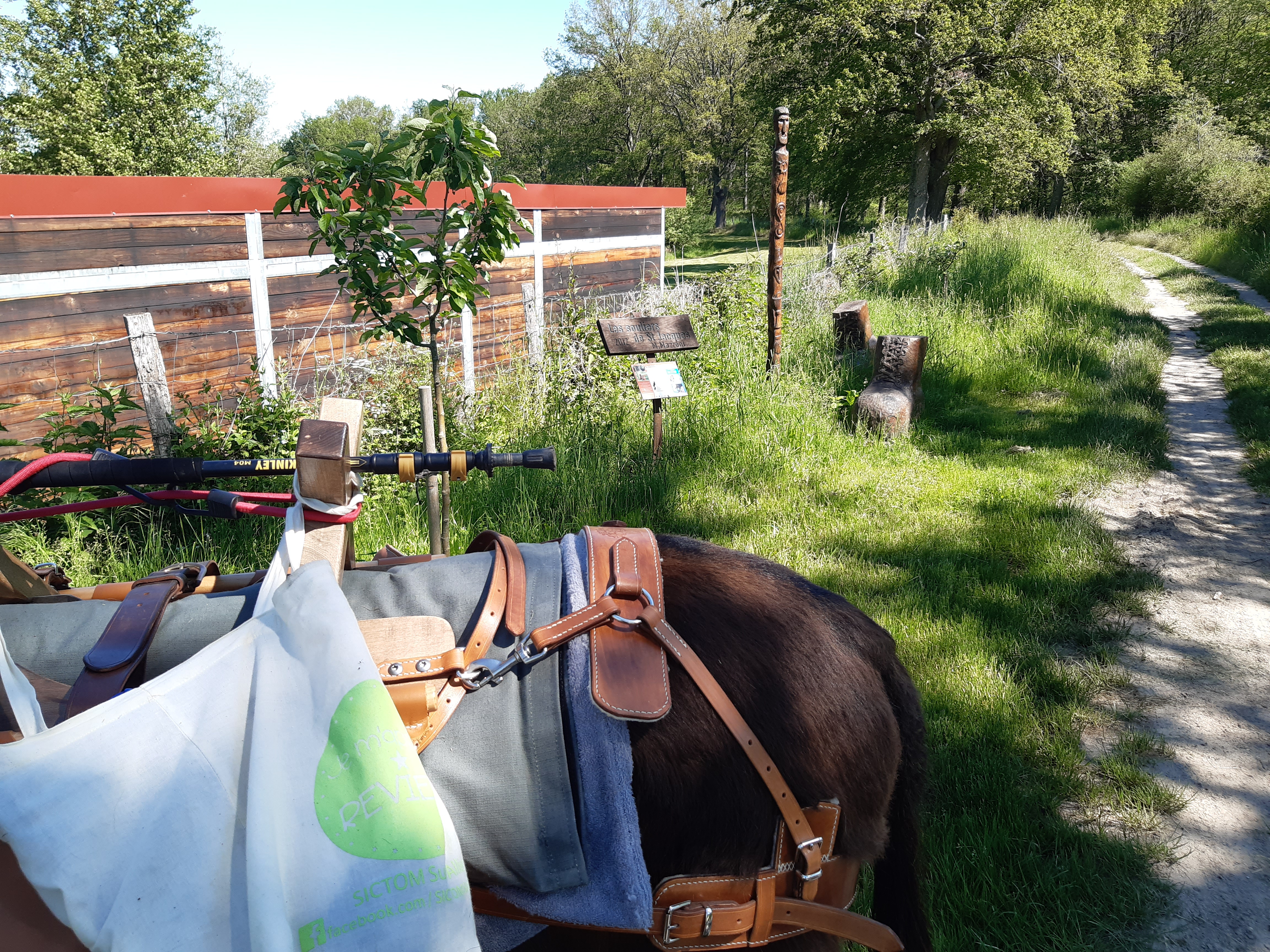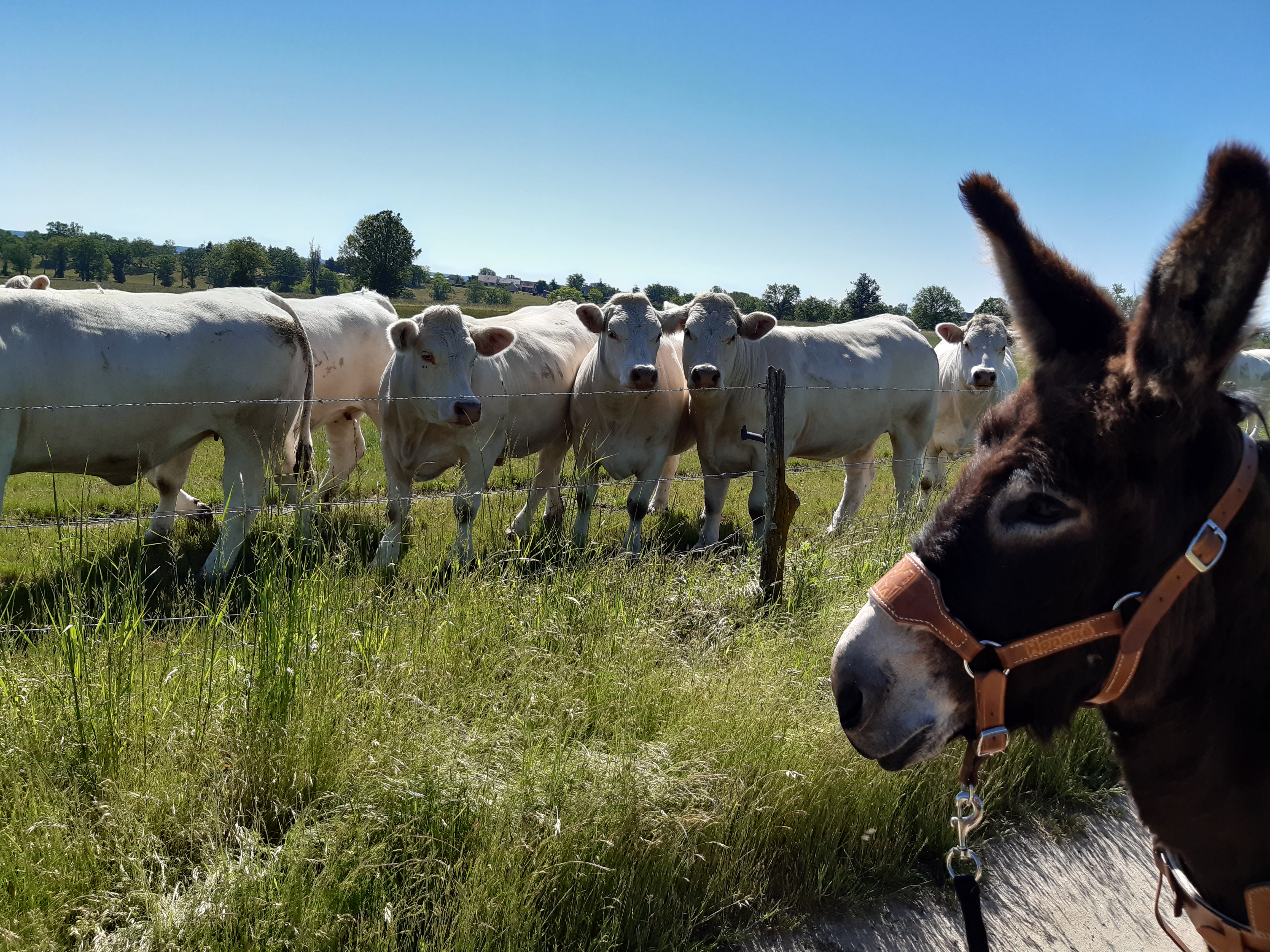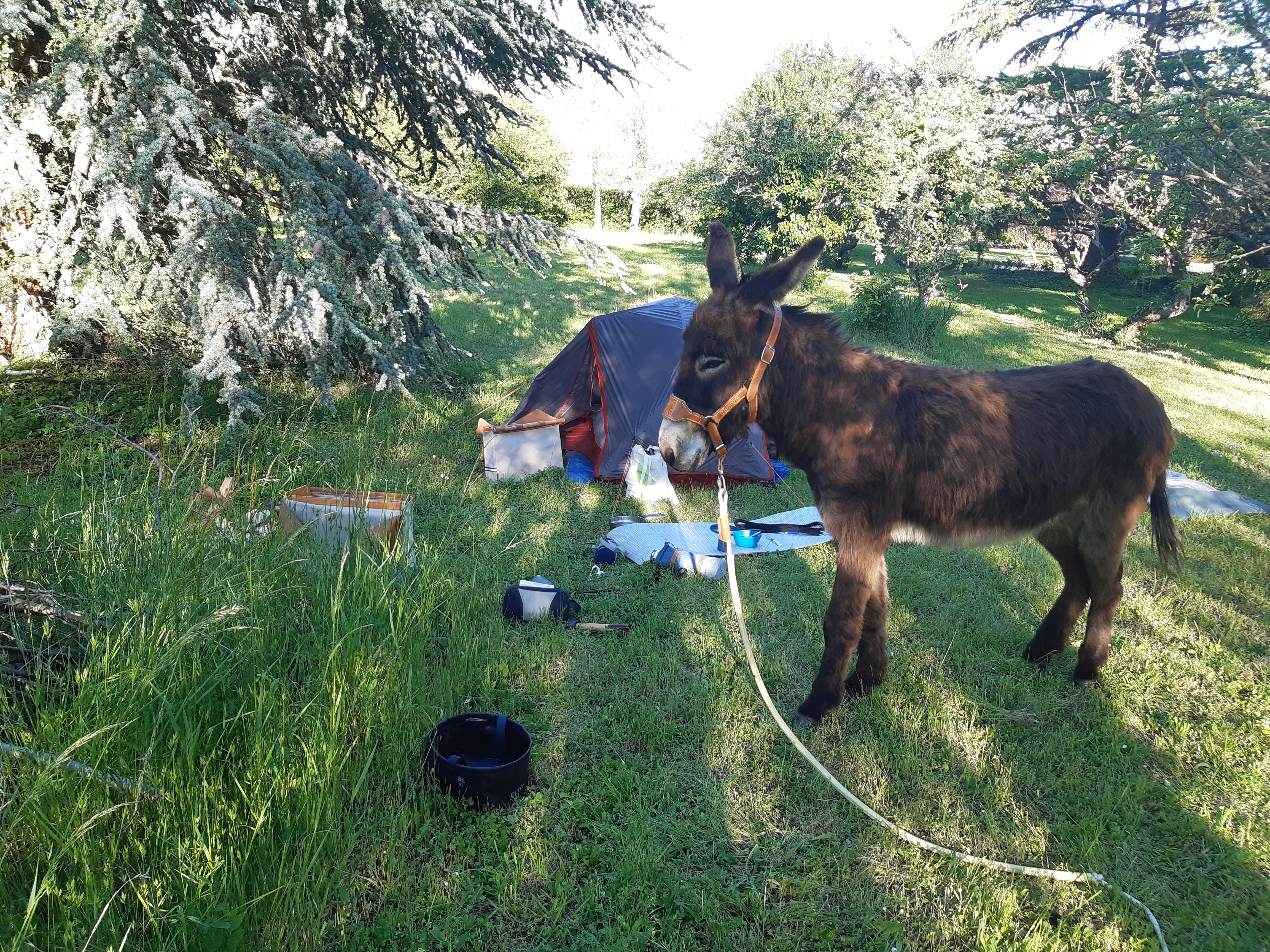 La traversée de Souvigny s’est super bien passée. J’ai même pu m’arrêter à la pharmacie, Honoré attaché devant qui m’attendait sagement. Il était l’attraction du village et nous avons été interpellés de nombreuses fois. Le chemin nous a ensuite réservé une surprise incroyable. Je m’arrête demander de l’eau et un lieu de bivouac à un couple dans son jardin, la dame, ne pouvant pas m’accueillir, va demander à son voisin. Quand je regarde chez le voisin, je reconnais un nom qui m’est familier sur le camion. Là, un type sort. Et ho stupeur, c’est Fabien que j’ai connu tout petit et que j’emmenais à la pêche quand il venait en vacances chez sa sœur Valérie, amie d’enfance, et en plus, à l’époque, collègue de travail et voisine. Tant de souvenirs remontent. Du coup je suis invité à l’apéro et même à dîner, soirée téléphone et émotions avec Valérie, Fabien me présente sa charmante petite famille. C’est magique, incroyable, émouvant. Wahou ! Merci Fabien bises et à bientôt 😉. Départ difficile du coup le lendemain matin, mais je suis tout près de Saint Menoux, je vais passer faire quelques petits coucous au marché et bien sûr à D’Âmes Nature (https://www.d-ames-nature.com/) Là encore Honoré attire tous les regards de bienveillance. Bruno, mon ancien voisin de marché, m’offre un fromage, Céline de D’âmes Nature, une nouvelle pierre pour Honoré. Merci pour toute cette bienveillance. Mais Honoré n’est pas très motivé aujourd’hui. Je le sens fatigué et moi aussi. Alors j’appelle Corinne et lui demande si je peux bivouaquer 1 ou 2 jours sur sa ferme. Et c’est donc parti pour deux jours de woofing à « coucou le jardin de l’essentiel ». Encore de belles rencontres et deux jolis dessins offerts par la petite voisine de la ferme de Corinne, Adélie qui a 7 ans et qui a fait le portrait de « lane ». Merci Adélie pour cette gentille attention. Merci à Corinne et son homme pour l’accueil, la cueillette des Bleuets… un séjour réparateur. Décidément ce chemin réserve bien des surprises.