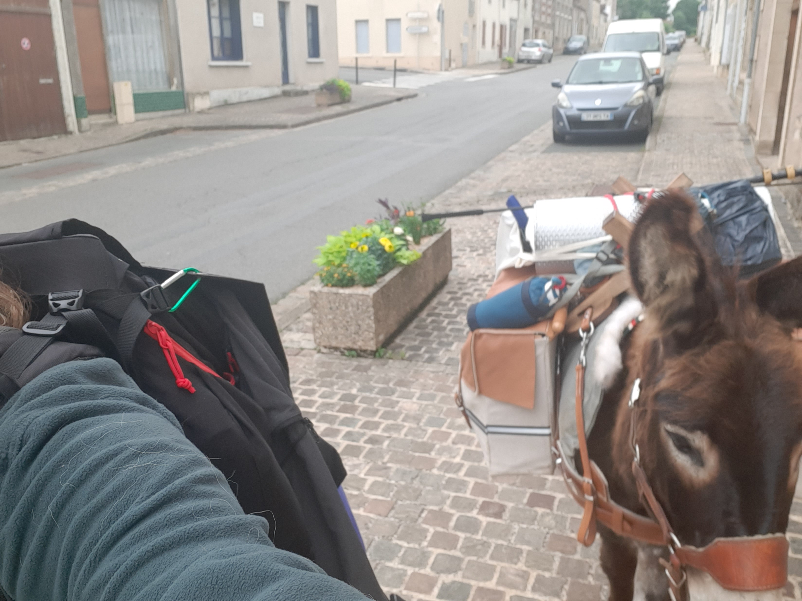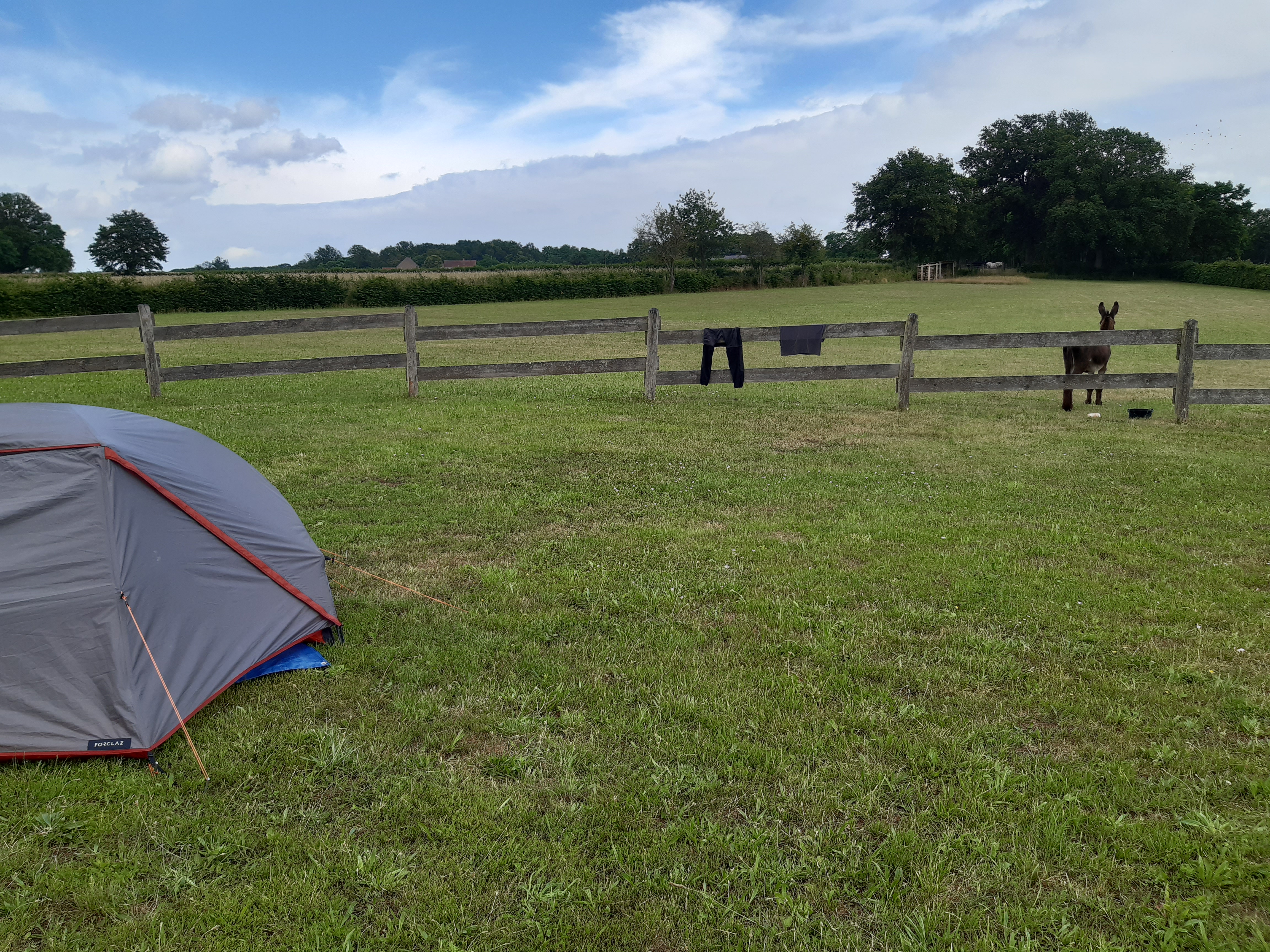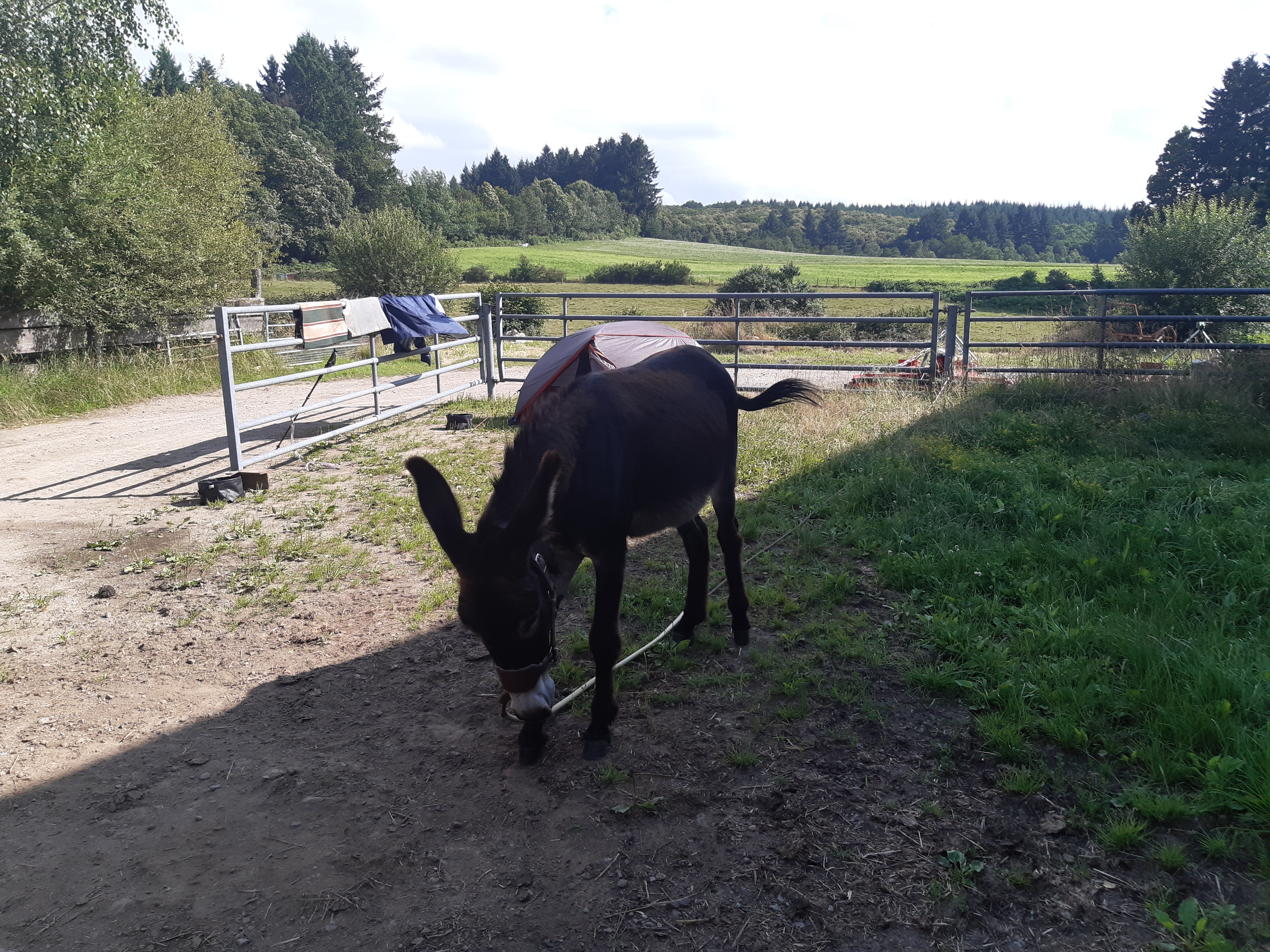 Départ de Châtelus-le-Marcheix salués par Marie-Pierre qui apporte un bout de pain à Honoré et de brioche pour moi (merci beaucoup elle était délicieuse), nous repartons avec le beau temps. On profite donc du paysage, mais ça ne dure pas, la pluie vient gâcher la journée. Sous la pluie nous arrivons dans une ferme où nous sommes accueillis 0ar Floor et ses enfants Antoine et Martin, Guillaume le papa est dans les prés. Il y a deux ânes dont un entier compliqué à gérer.