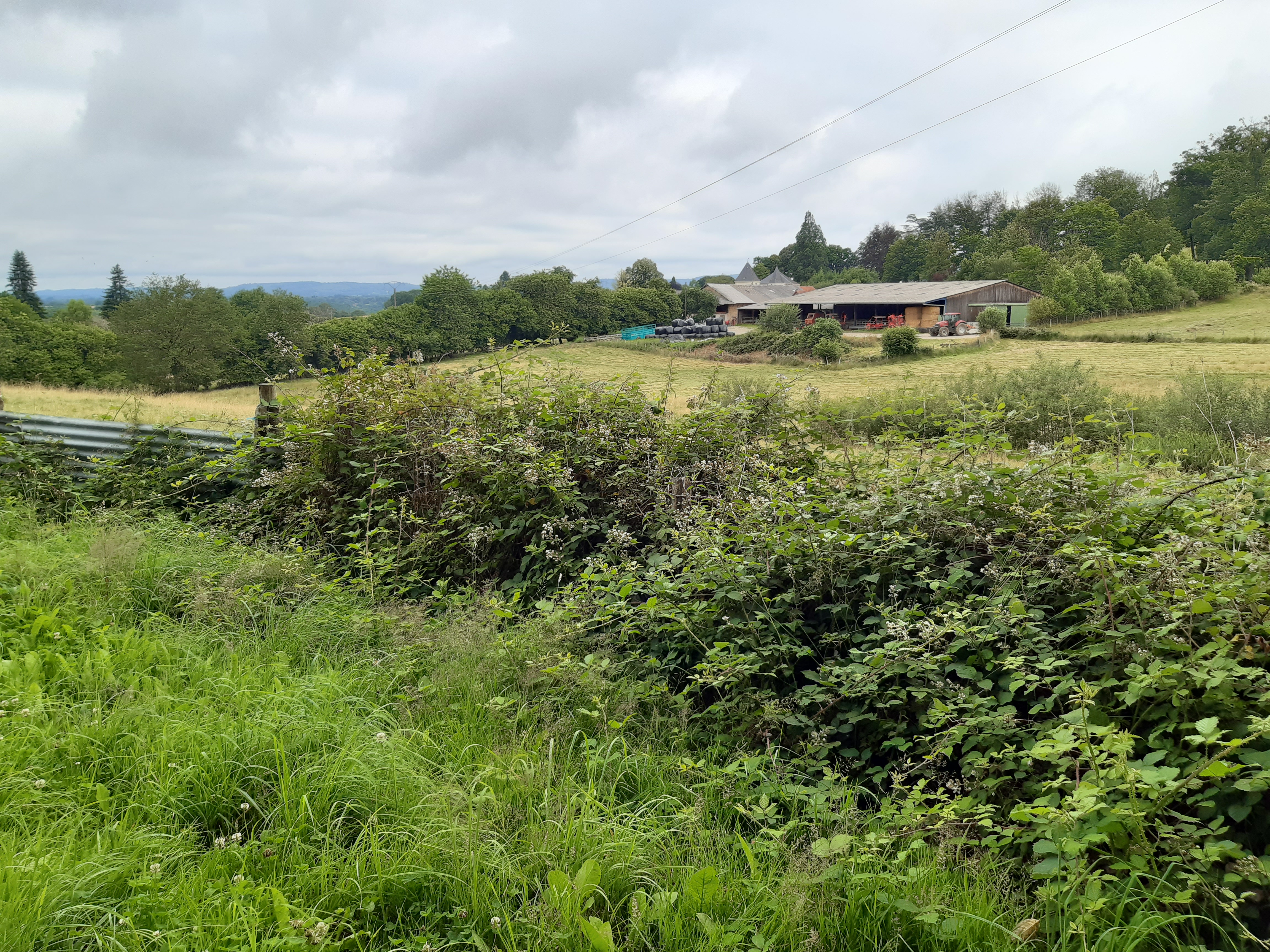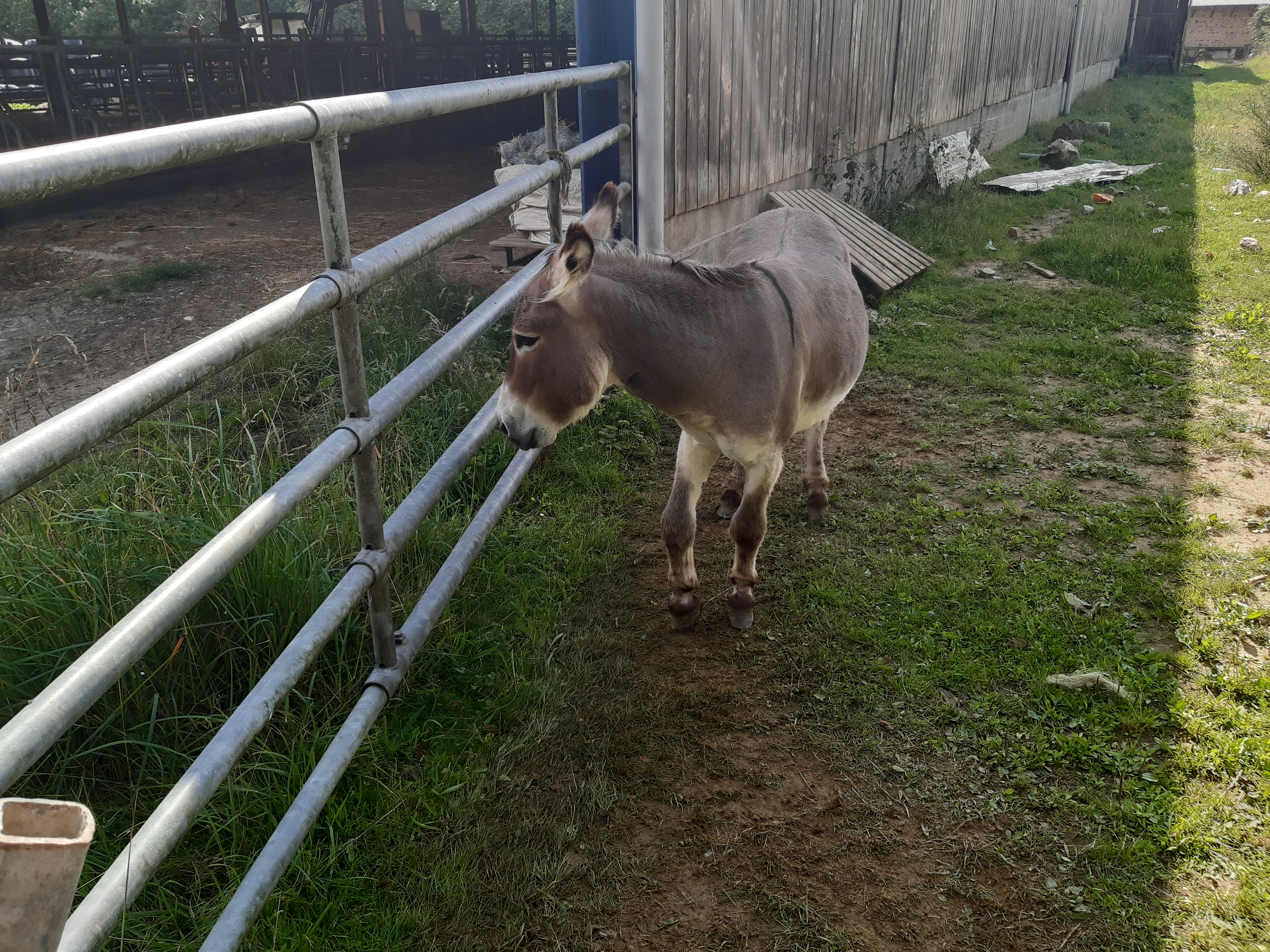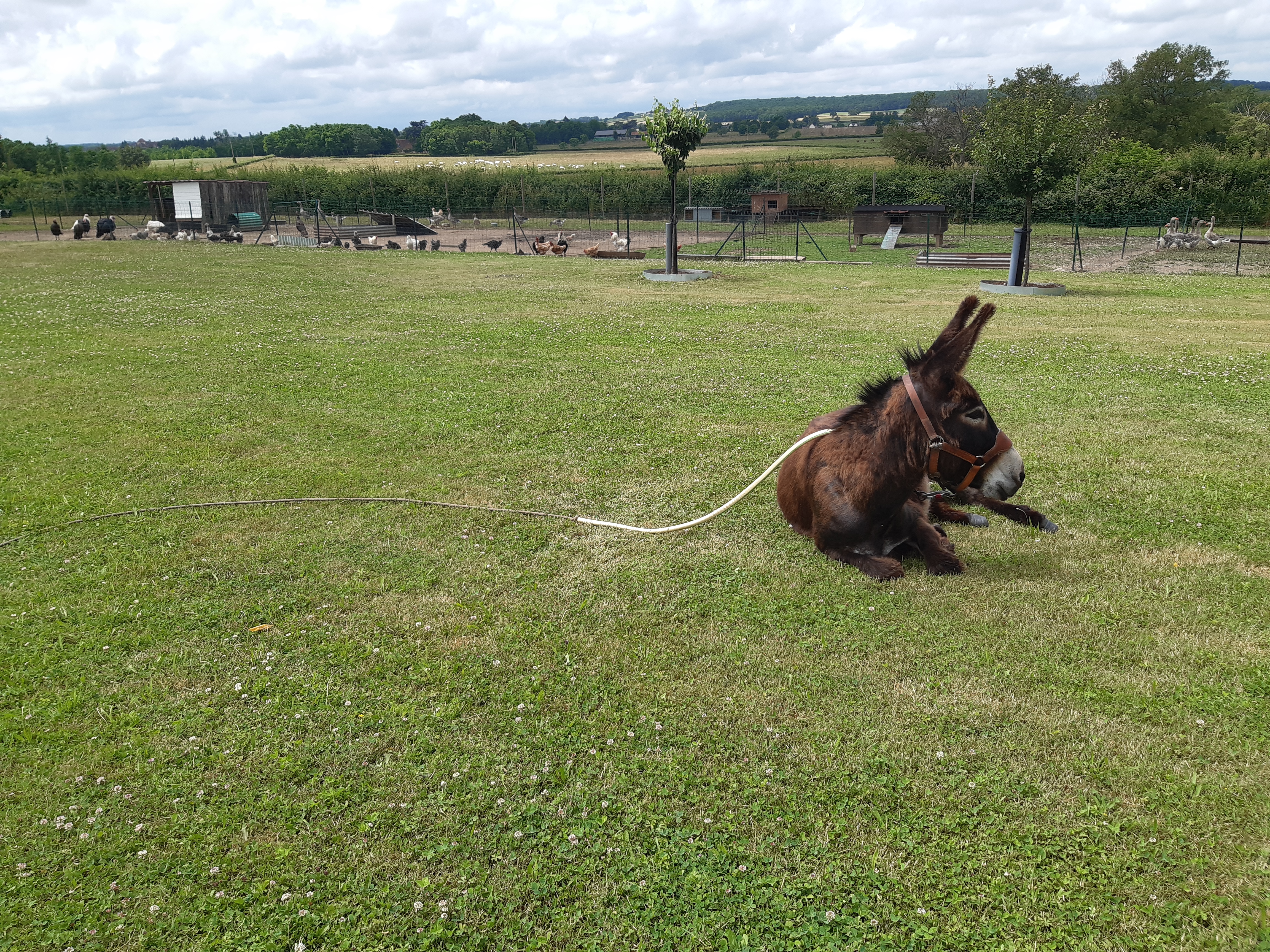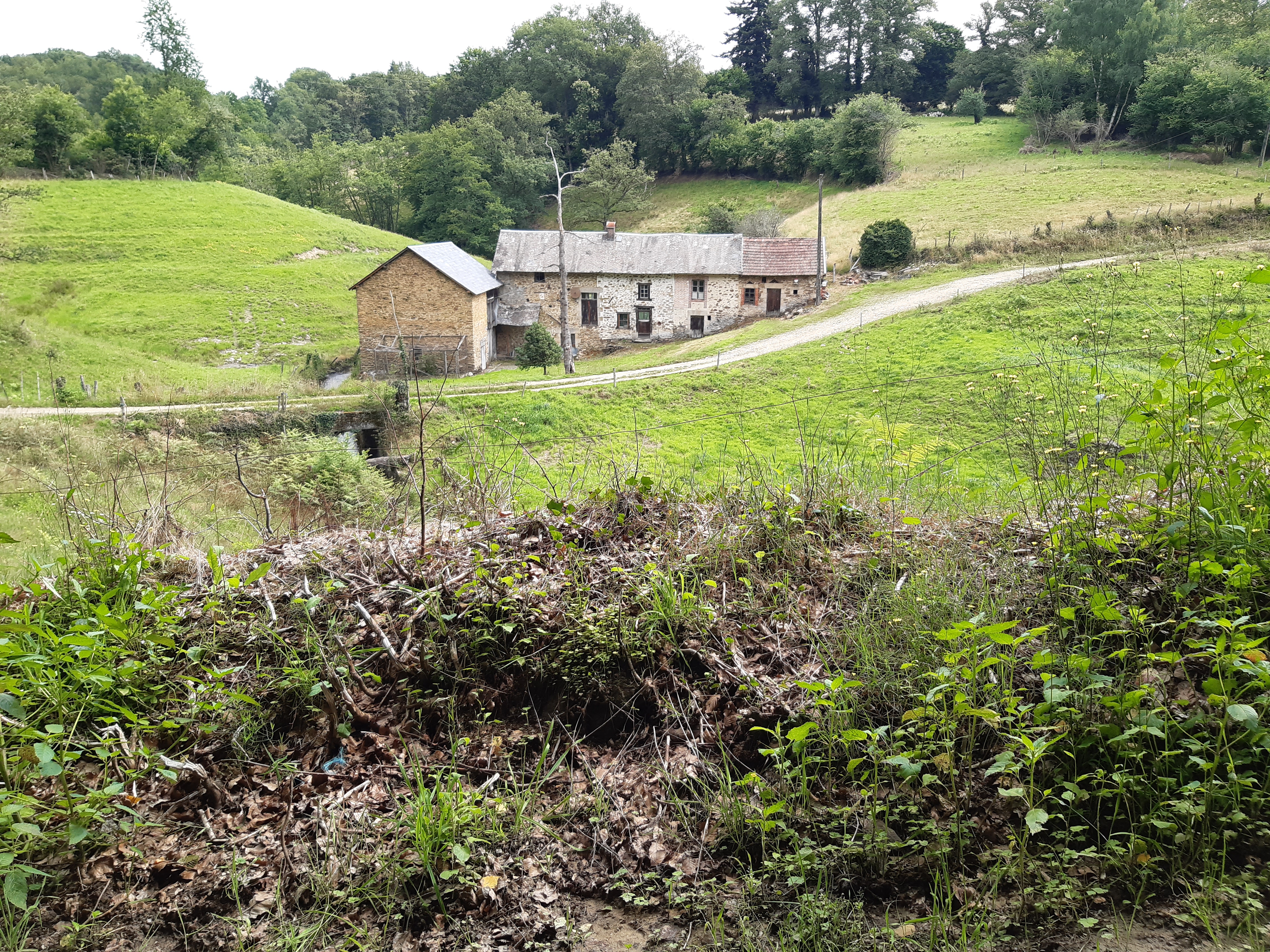 Départ de Châtelus-le-Marcheix salués par Marie-Pierre qui apporte un bout de pain à Honoré et de brioche pour moi (merci beaucoup elle était délicieuse), nous repartons avec le beau temps. On profite donc du paysage, mais ça ne dure pas, la pluie vient gâcher la journée. Sous la pluie nous arrivons dans une ferme où nous sommes accueillis 0ar Floor et ses enfants Antoine et Martin, Guillaume le papa est dans les prés. Il y a deux ânes dont un entier compliqué à gérer.